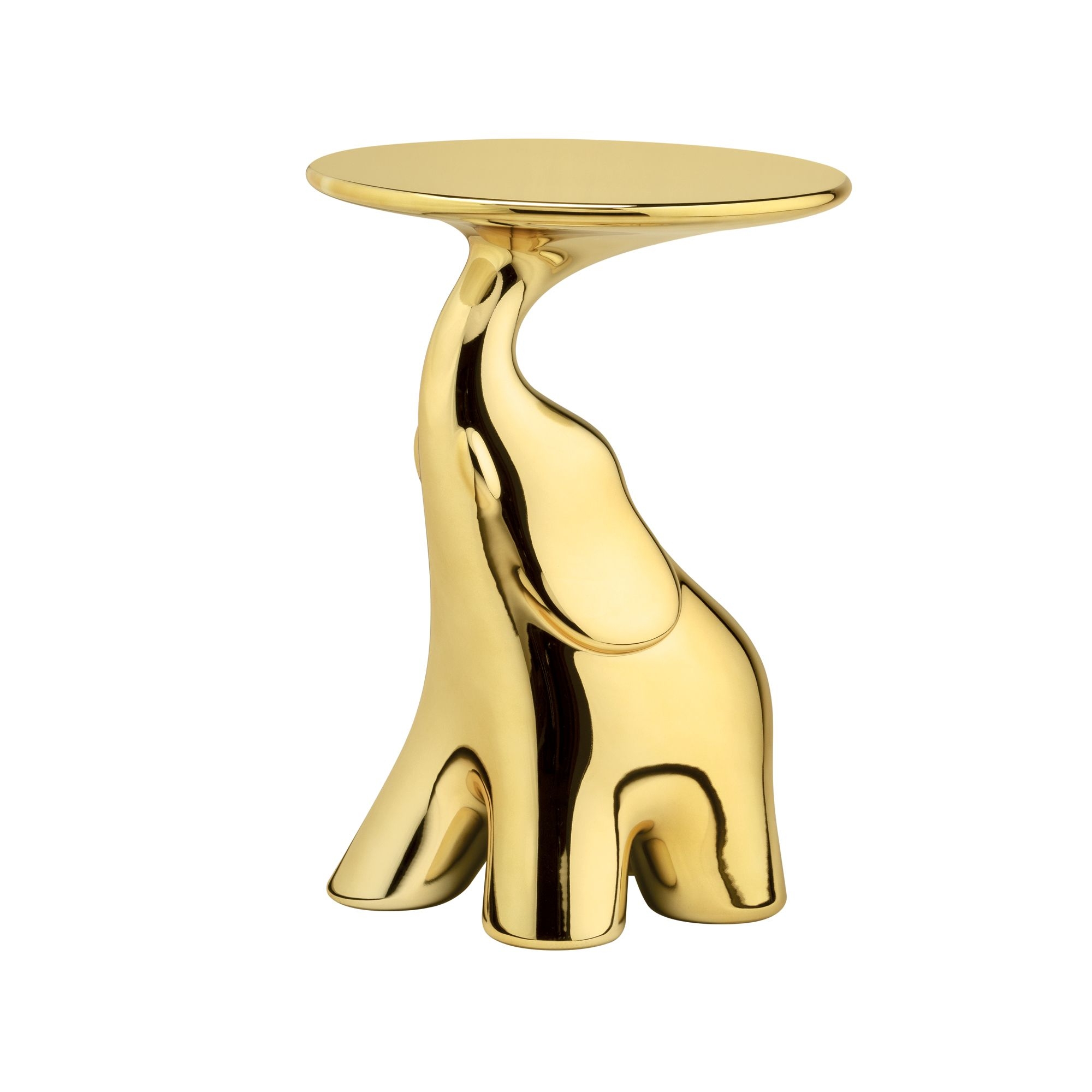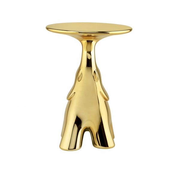 The Pako Gold coffee table by Qeeboo is a delightful piece entirely made of recyclable polyethylene, a material known for its durability, ease of maintenance, and resilience. This gorgeous coffee table stands as a symbol of elegance and modernity, designed to add a stylish flair to any setting, from living rooms to entryway halls, as well as being ideal for public spaces such as hotels or restaurants. Its fluid silhouette and golden hue uniquely capture and reflect light, creating unequaled visual plays and reflections. With its trunk supporting a circular top, the table provides a surface to place various items: books, magazines, beverages, or decorative objects around your home. The Pako Gold coffee table is a singular choice, representing an investment in both functionality and aesthetic beauty, a piece that enhances every space in your home. Designed by Stefano Giovannoni for Qeeboo.