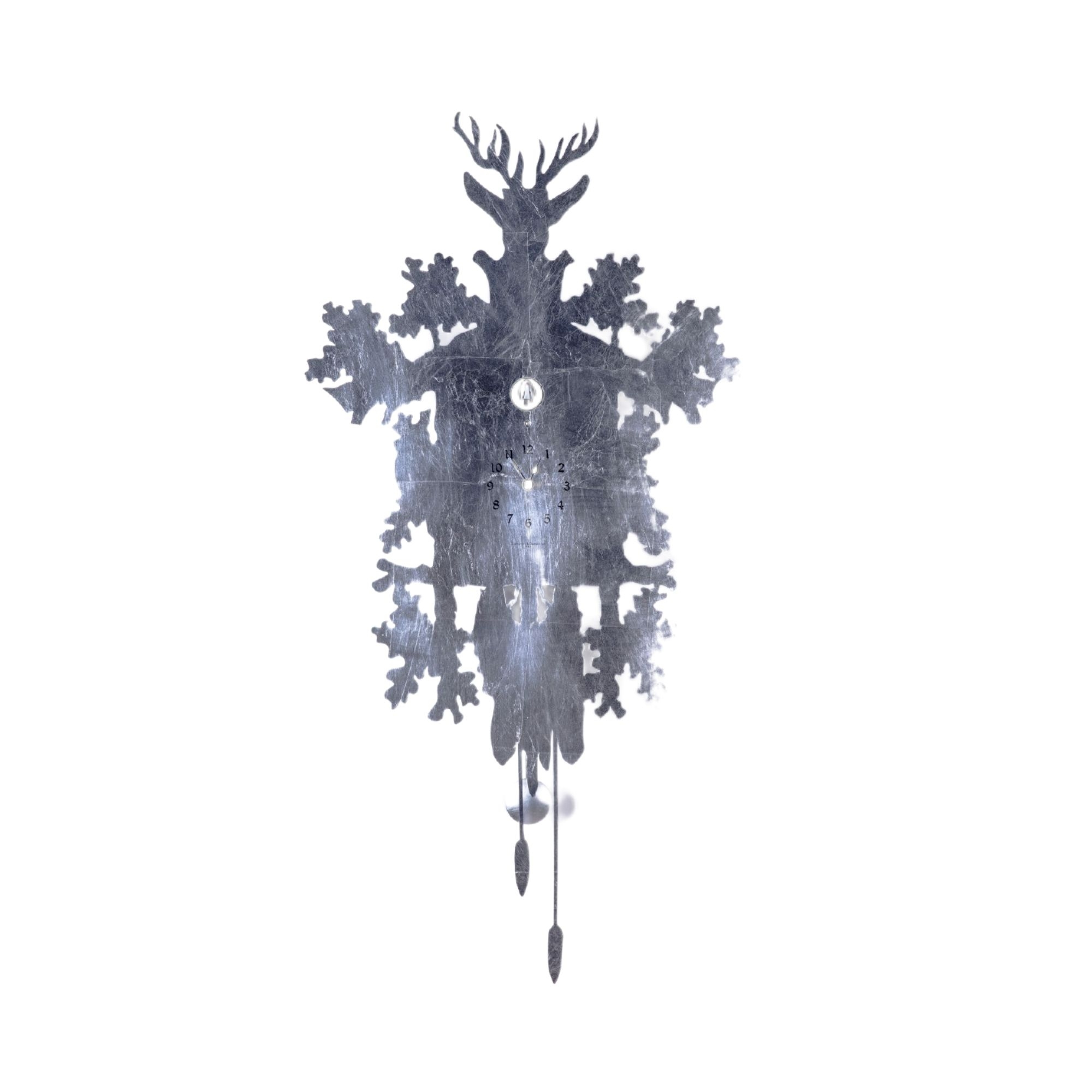 The Cuckoo clock is the most representative item by Diamantini & Domeniconi. In Pascal Tarabay's ultra-modern interpretation, it consistis of a laser-cut metal in several lacquers. The little bird comes out and sings every hour, unless it's dark. In fact, a light detector stops the sound as soon as the room is dark. Dimensions Width 45 cm, Depth 10 cm, Height 88 cm Materials Lacquered metal