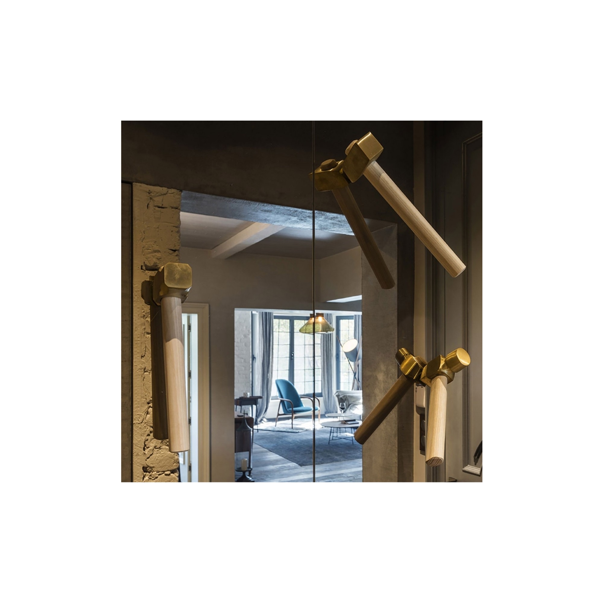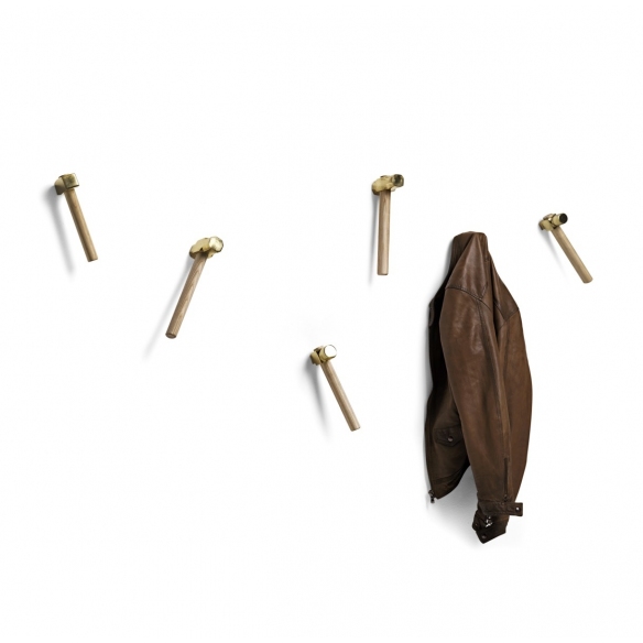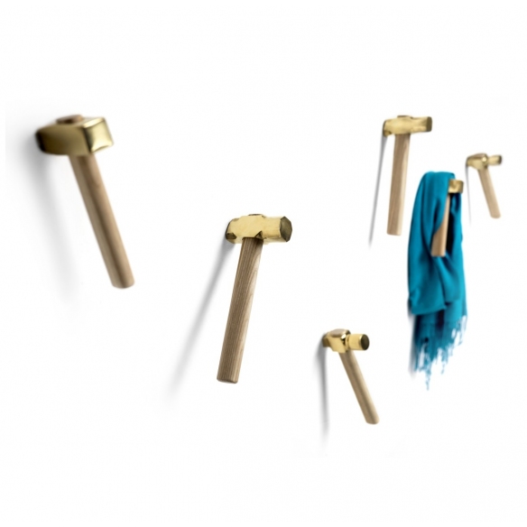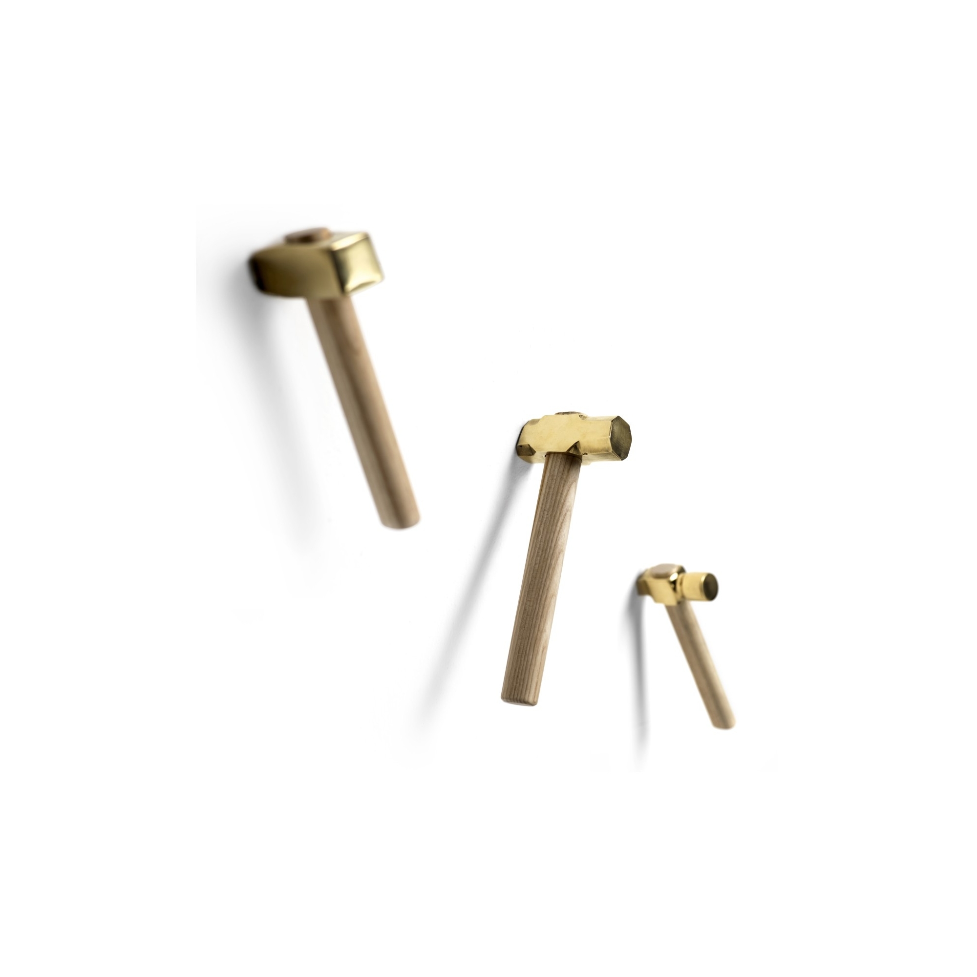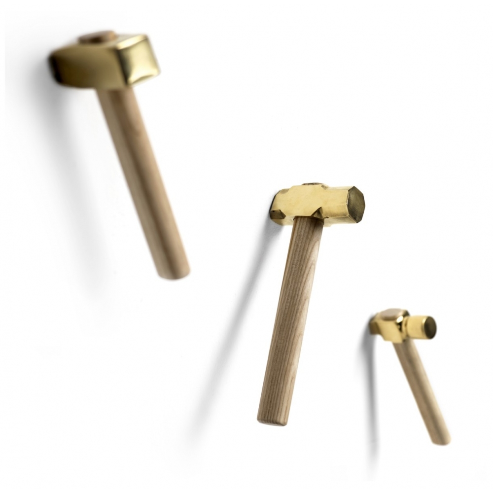 Kit of 3 Hammer coat hooks with ash handle and satin cast brass tip, designed by Marcantonio for Mogg.