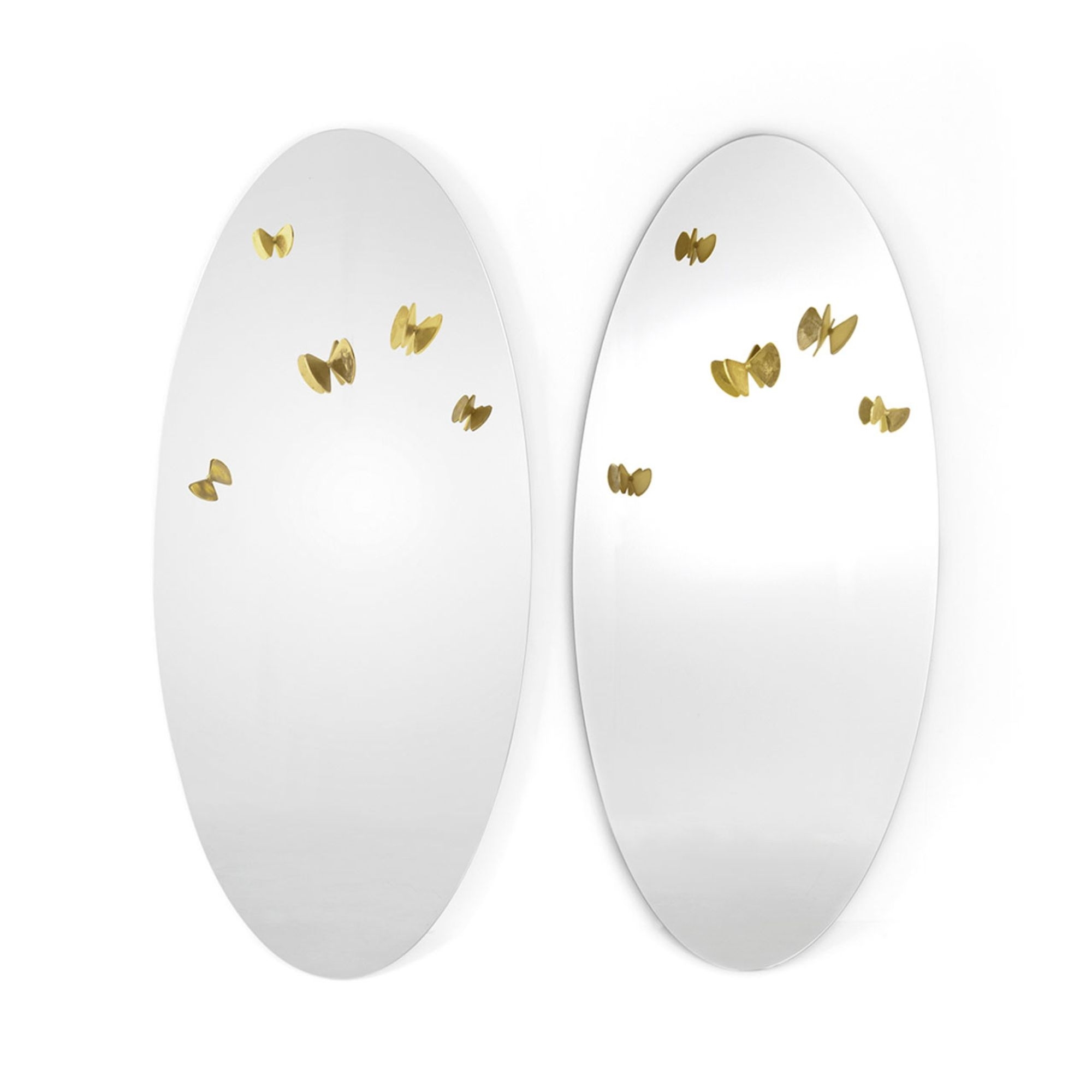 Bice oval wall mirror with kit of 5 brass casting butterflies. Available in mixed finishes (polished nickel, oxidized brass) or in copper finish. Bice looks like a mirror with a simple and exquisitely hilarious design A plainly designed mirror, with stylized butterflies that give a touch of elegance and femininity to the object, making it eye-catching and ideal to any living space, designed by Roberto Mora for Mogg.