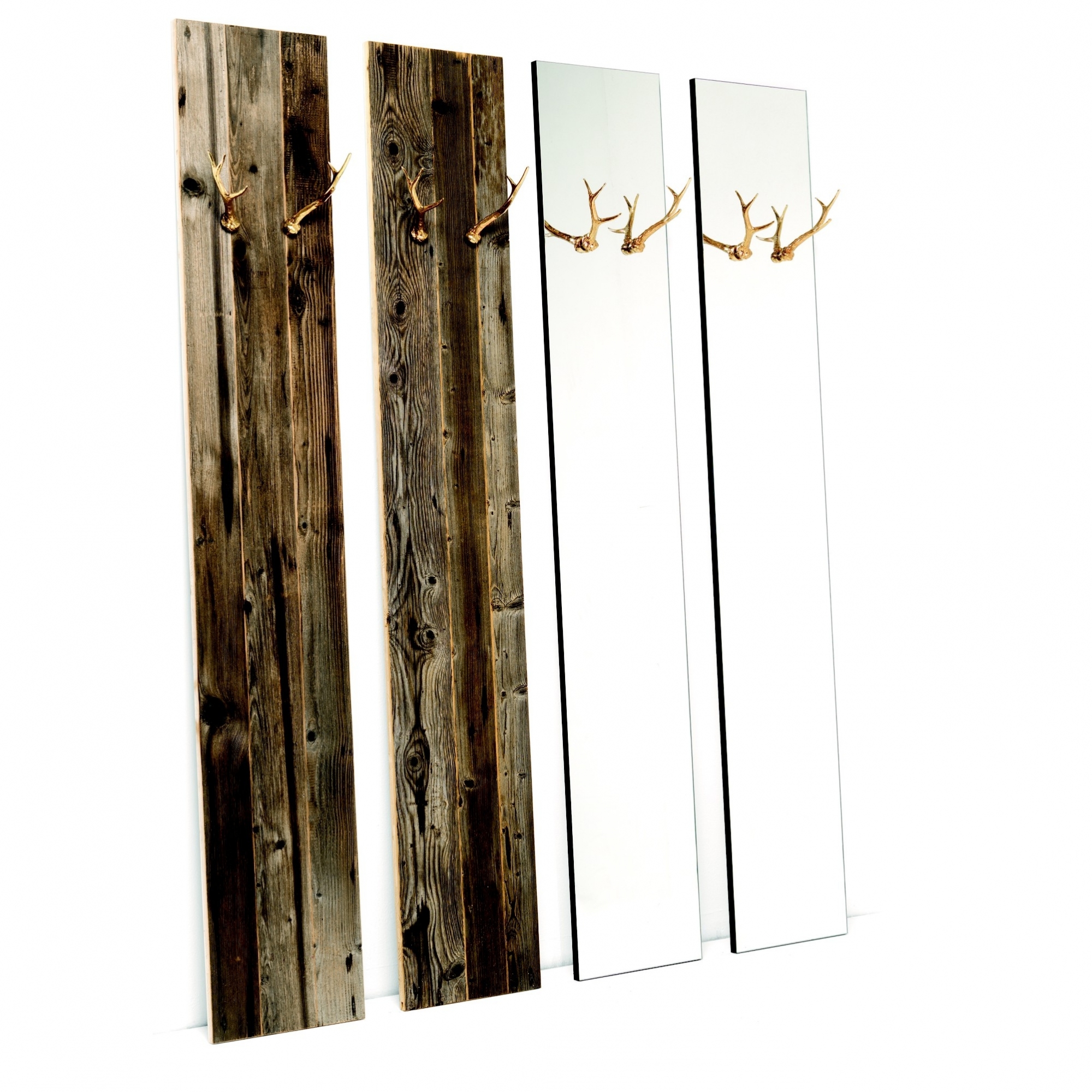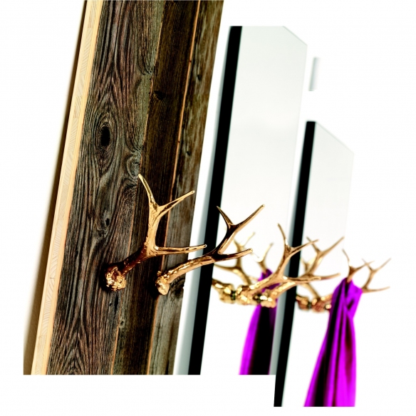 Hubertus Coat Hanger Panel to hang or stand on. Hubertus comes as a rectangulas mirror, definitely elegant, complemented with a pair of cast brass horn hooks with polished finish. Unusual and definitely uncommon, Hubertus is a well recognizable and defined object, yet extremely functional. The antique latrice panel is available too. Designed by Filippo Mambretti for Mogg. Dimensions : 33 cm width, 10 cm depth, 200 cm height. Item material : Wood, Brass.