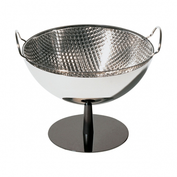 AC04 B colander/fruit bowl made of 18/10 stainless steel with aluminium base. Very elegant and compact, this amazing colander/fruit bowl can be everything you want. It is perfect to bring pasta, vegetables and can be a fruit holder or a centrepiece. With this project, which represents a happy and rare case of a new typology born from the crossing of two classic typologies of the household, the cup and the colander. Achille Castiglioni, who was 77 at the time, was awarded the Prize of the Conseil National des Arts Culinaires de Paris in 1995 as “jeunne créateur de l'année”. Designed by Achille Giovannoni for Alessi.