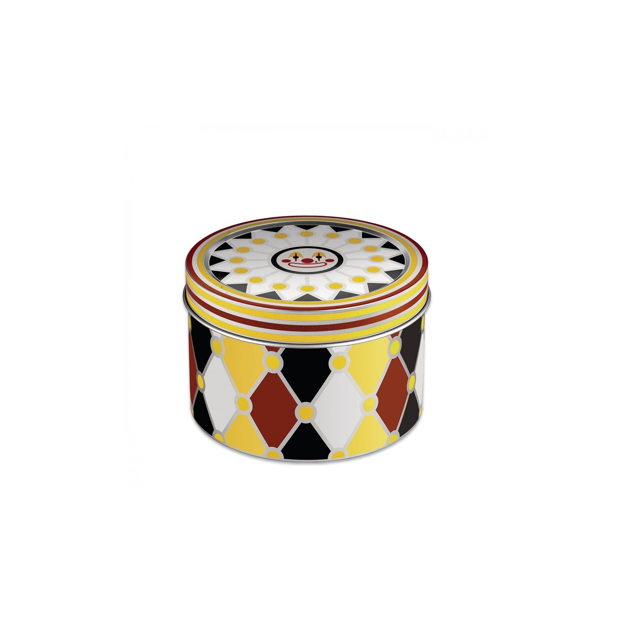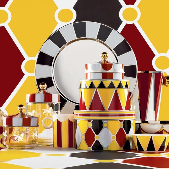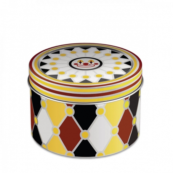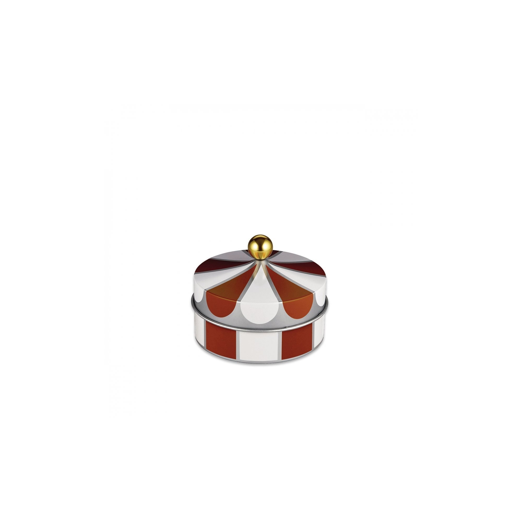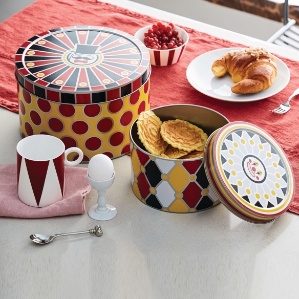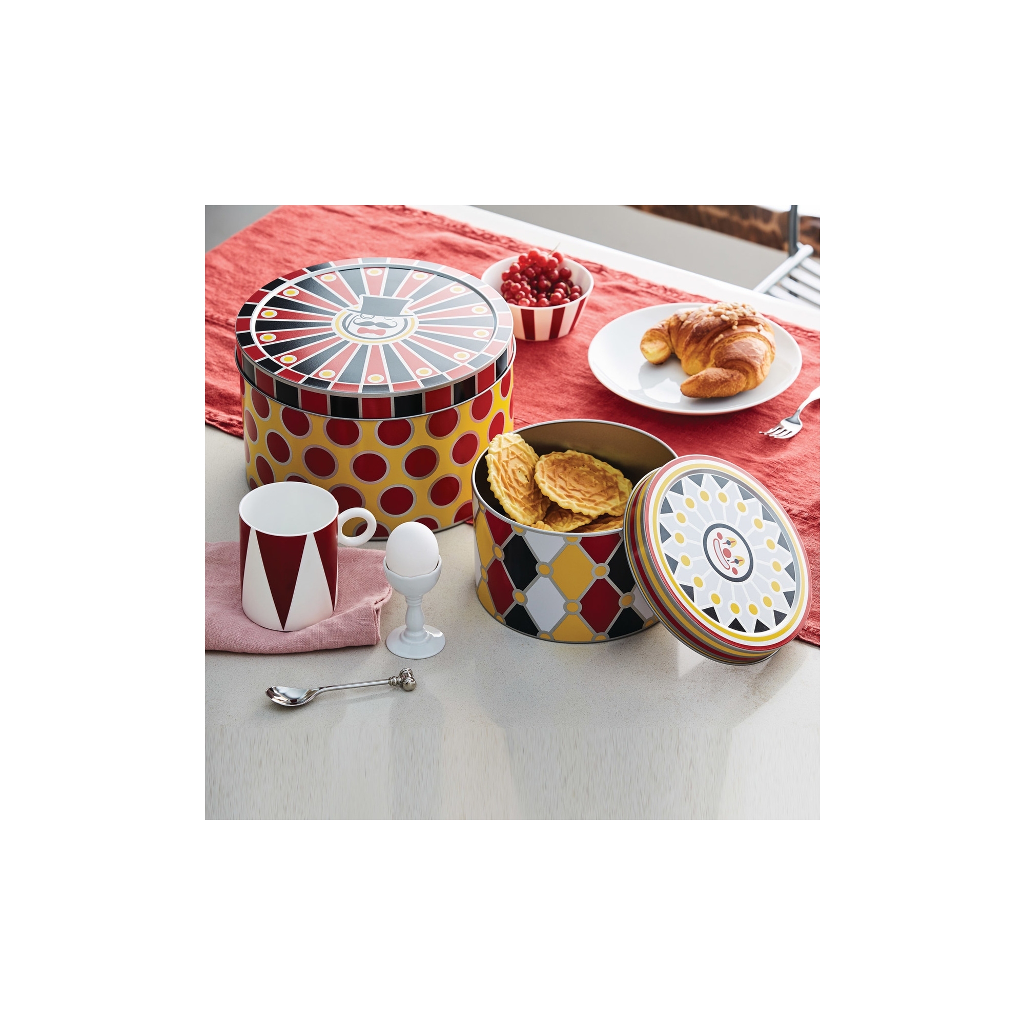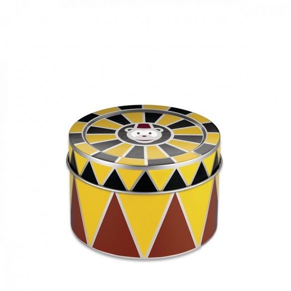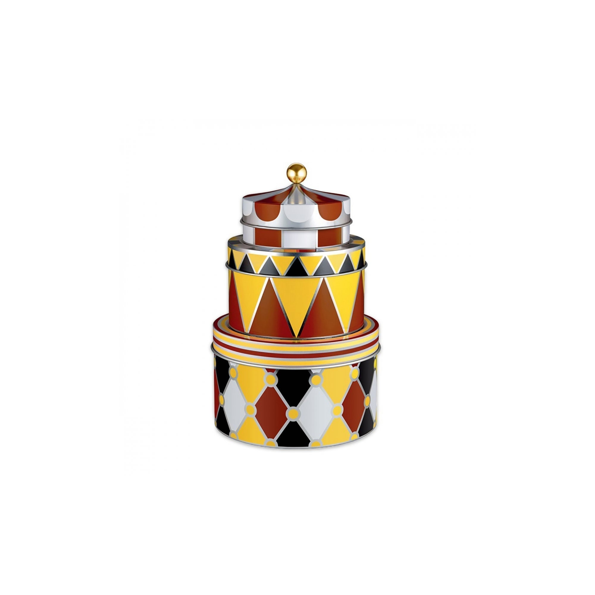 Circus set of three-storage boxes made of tinplate with decoration. This fabulous boxes can be used to store various food items, locking in all their freshness, aroma and flavour. The design inspires a decoration reminiscent of the merry-go-rounds often set up along with the circus big top. Designed by Marcel Wanders for Alessi.