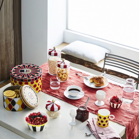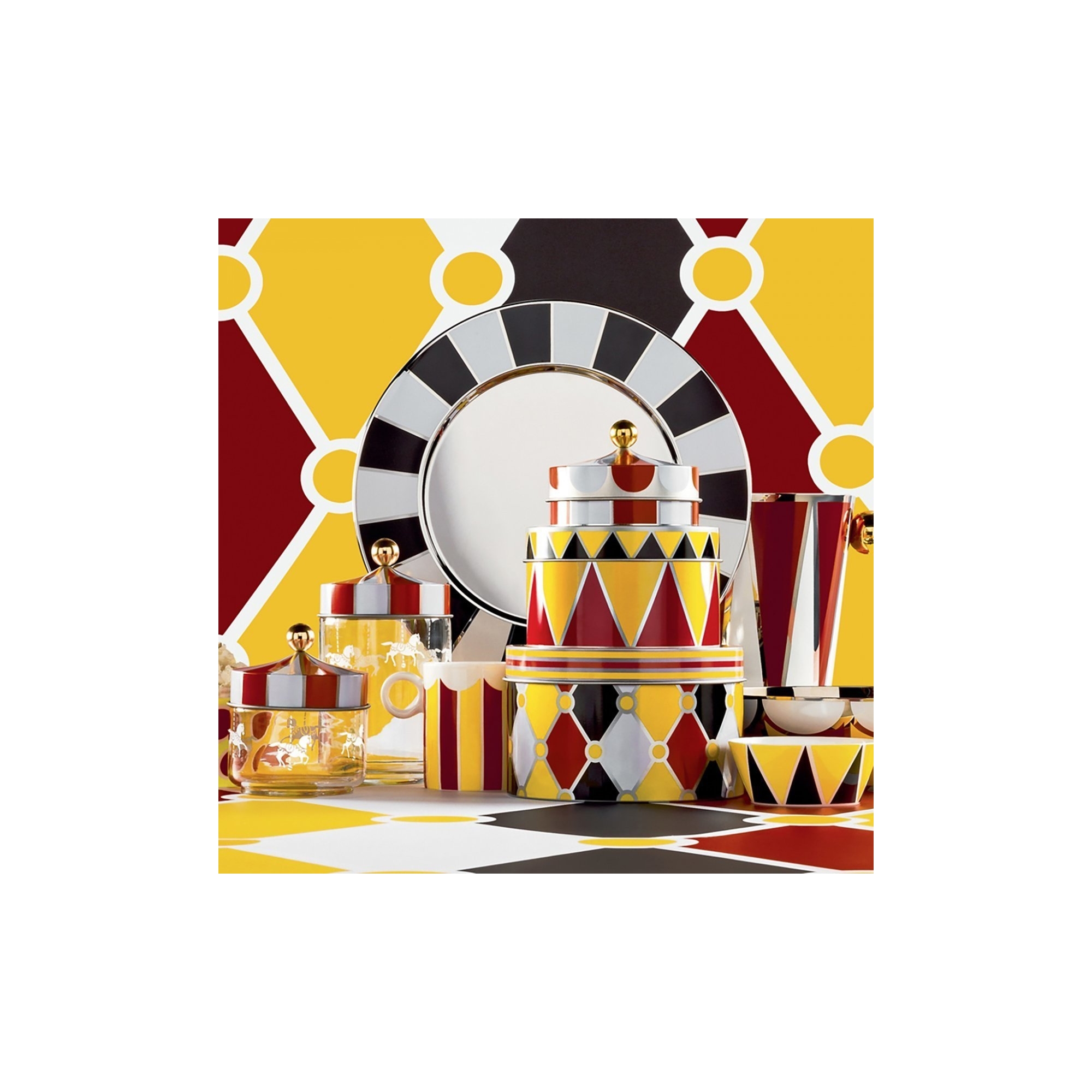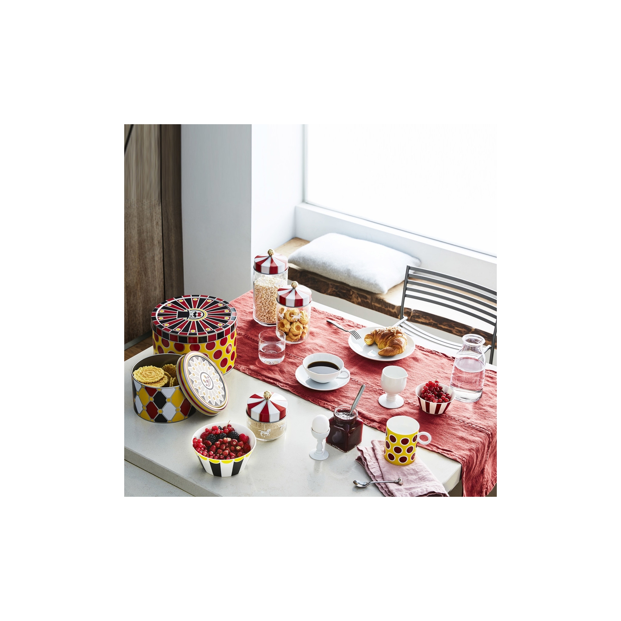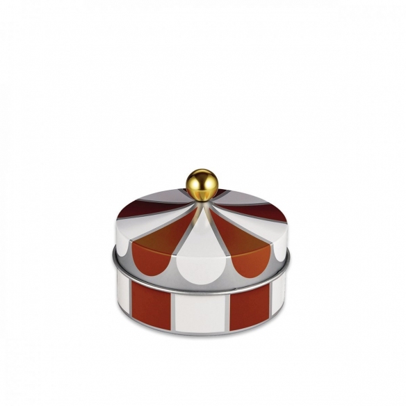 Circus kitchen box is part of the charming collection designed by the illustrious Marcel Wanders for the Alessi brand. Designed in 2016, this collection includes differed kitchen tools and utensils, characterised by the ambience of old, colourful circus tents, where bright shades of yellow and red combine with strong black and white patterns and the shine of gold and silver. The Circus collection transforms the delightful spirit of old-time circus into a modern shape and fills the table with joyful atmosphere. To create this jar, Marcel Wanders inspires a decoration reminiscent of the merry-go-rounds often set up along with the circus big top. The lid is decorated with the traditional red and white stripes of fairground ride awnings, while the gold-coloured knob conjures up the ornamental element that adorns the centre. The result is enchanting: Wanders transforms classic kitchen jars into cheerful mini fairground rides. So? What are you waiting for? Bring your table the charming of Circus tools! Discover the other fantastic products of the same line here, on Newpo.it!