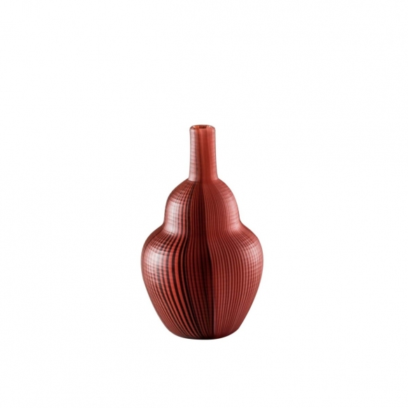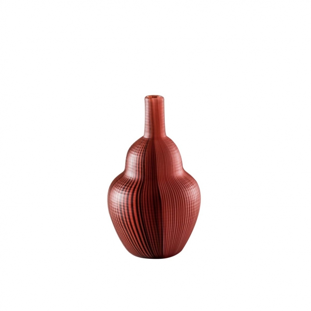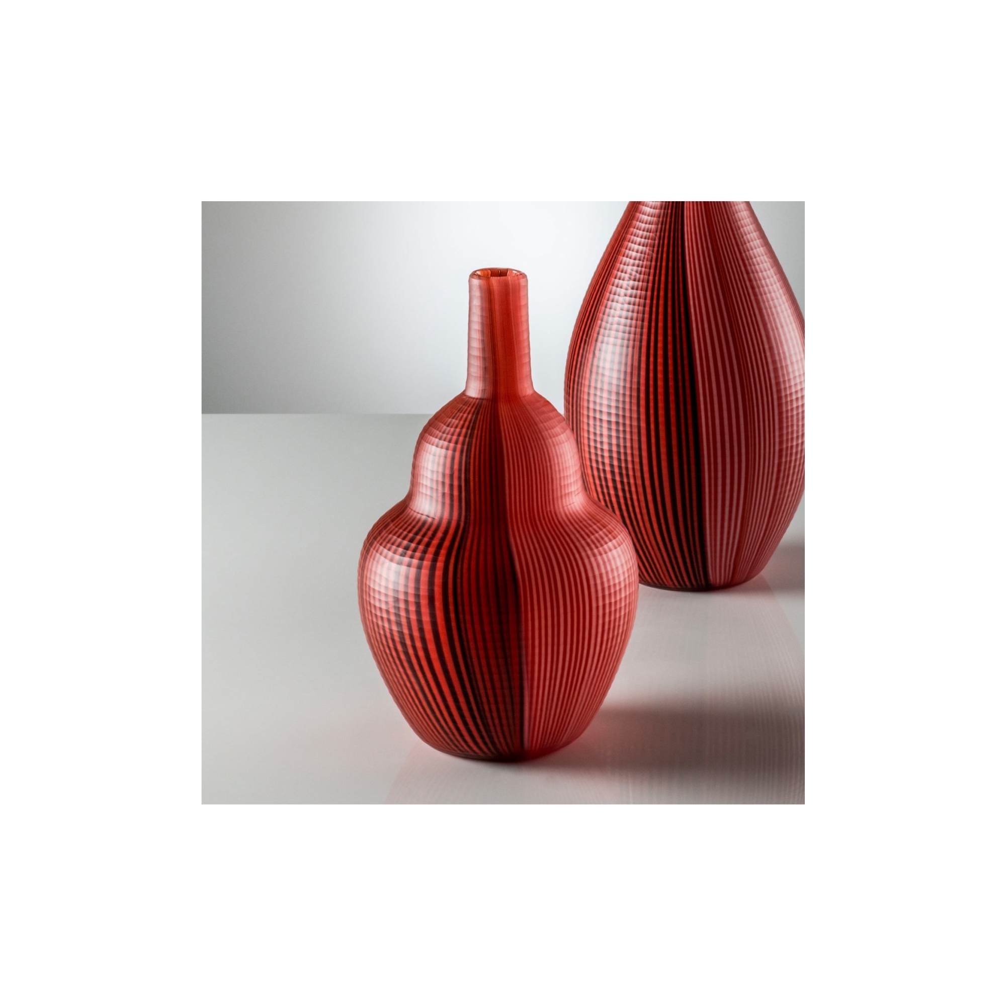 Tessuti Battuti collection designed by Carlo Scarpa with Venini brand is one of the collection more suggestive and precious of the company. Different colour in rigours lines, which coming closer, pulling away, intertwining and forming light forms and lines. Proposed in two version, Tessuti Battuti vase combines the shades of Coral alternate on the lines of lighter and darker shades, reproduced by master glassblowers by using the skilful "Canne" technique and by finally grinding the glass.