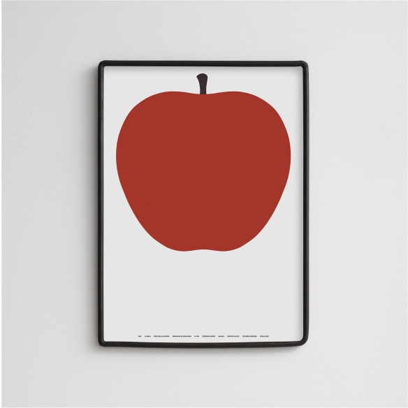 Two-color "Uno, La Mela" screen printed on dropjet paper 200g mq 50x70 cm belonging to the nature series. Very lively and elegant, this splendid work aims to depict the archetypal nature of the apple, purging it of all superfluous formal details and representing it in its purest form. Printed on dropjet paper closed on the horizontal sides by two plastic profiles that allow it to be hung, La Mela finds its place in children's rooms, in a kitchen, in a study. Designed by Enzo Mari in 1963 for Danese Milano.