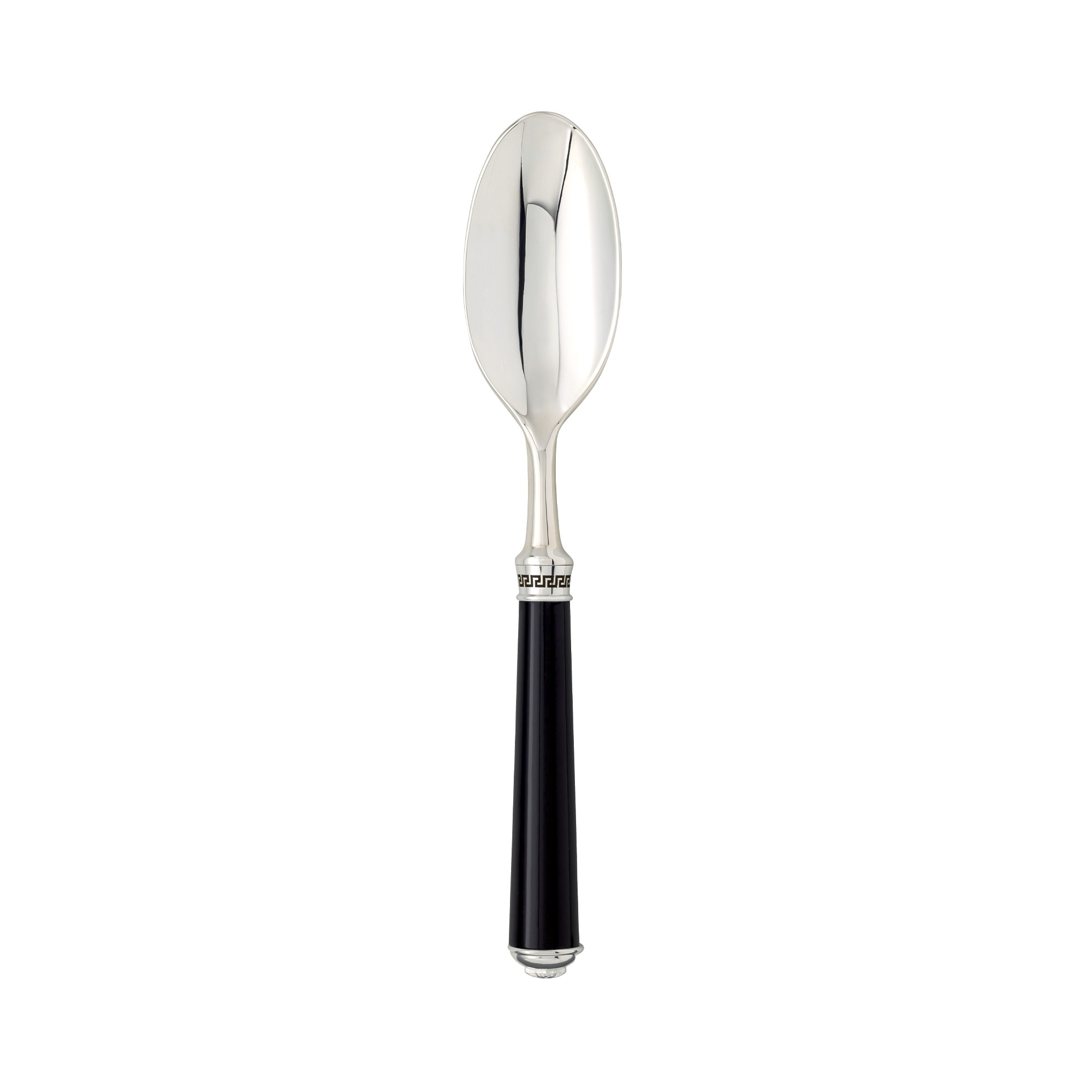 Cucchiaio da tavola Me-Deco realizzato in acciaio inossidabile e disponibile in due eleganti versioni: argento o placcato oro (24 carati). Il design del cucchiaio è esaltato dal contrasto cromatico offerto dal manico, laccato in un nero profondo e brillante, che conferisce a ogni pezzo una presenza regale e maestosa. Le posate sono inoltre impreziosite da delicati dettagli che fanno eco alla tradizione e all'iconografia di Versace: una fascia a meandro e un modello tridimensionale della famosa Medusa adornano il manico, simboli di lusso e raffinatezza che caratterizzano l'unicità del marchio. Perfetto per le cene eleganti, i banchetti festivi o semplicemente per aggiungere un tocco di classe alle tue routine giornaliere, il cucchiaio da tavola Me-Deco di Rosenthal meets Versace rappresenta non solo un'espressione di gusto impeccabile ma anche un'opera di arte applicata, un tributo all'armonia tra forma e funzione, bellezza e praticità. Realizzato da Rosenthal Versace.