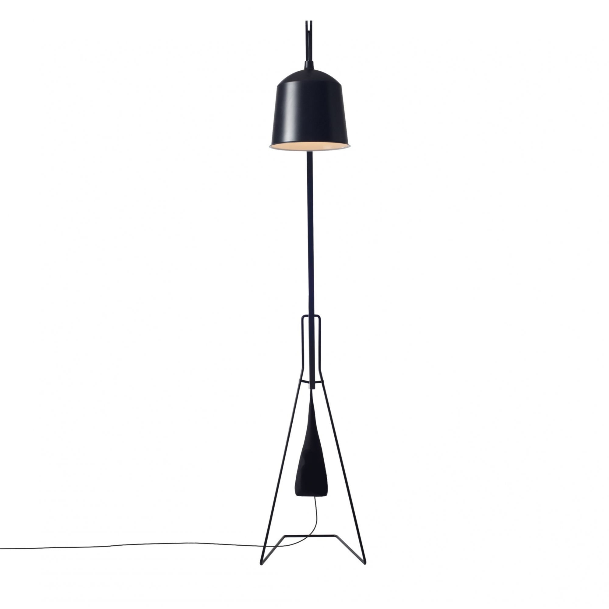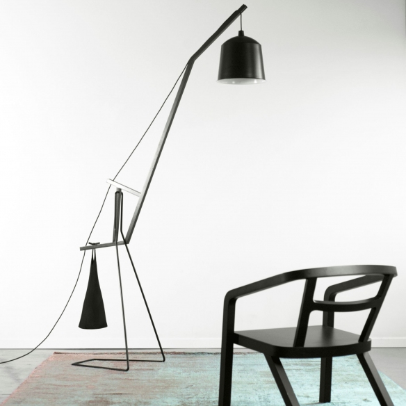 Floor lamp A Floor Lamp with wooden central body, base made of steel and cotton canvas bag. An apparently precarious but decidedly desired balance is the fulcrum of the beautiful A Floor Lamp. An object out of the ordinary, which focuses entirely on an aesthetic of character. The lampshade is suspended in the air and, at the same time, held together with the central body by a play of proportions and balances. Innovative and sophisticated, A Floor Lamp challenges the force of gravitational attraction by translating an élan towards modernity. Made by Covo.