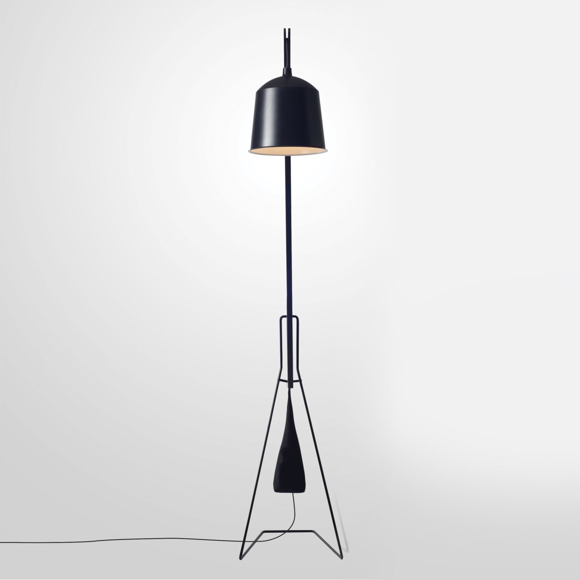 Floor lamp A Floor Lamp with wooden central body, base made of steel and cotton canvas bag. An apparently precarious but decidedly desired balance is the fulcrum of the beautiful A Floor Lamp. An object out of the ordinary, which focuses entirely on an aesthetic of character. The lampshade is suspended in the air and, at the same time, held together with the central body by a play of proportions and balances. Innovative and sophisticated, A Floor Lamp challenges the force of gravitational attraction by translating an élan towards modernity. Made by Covo.