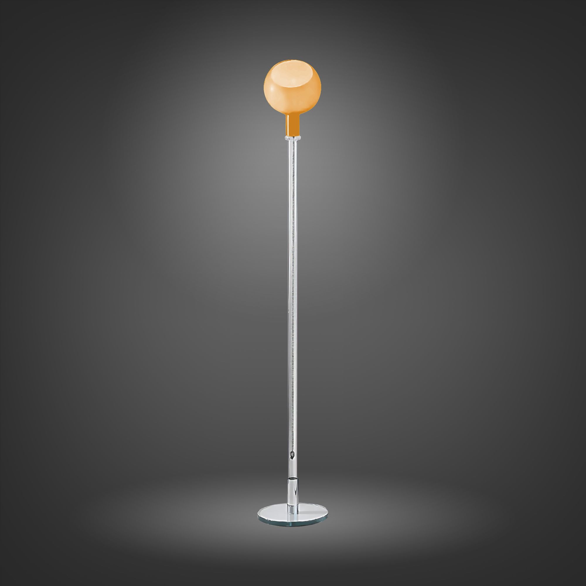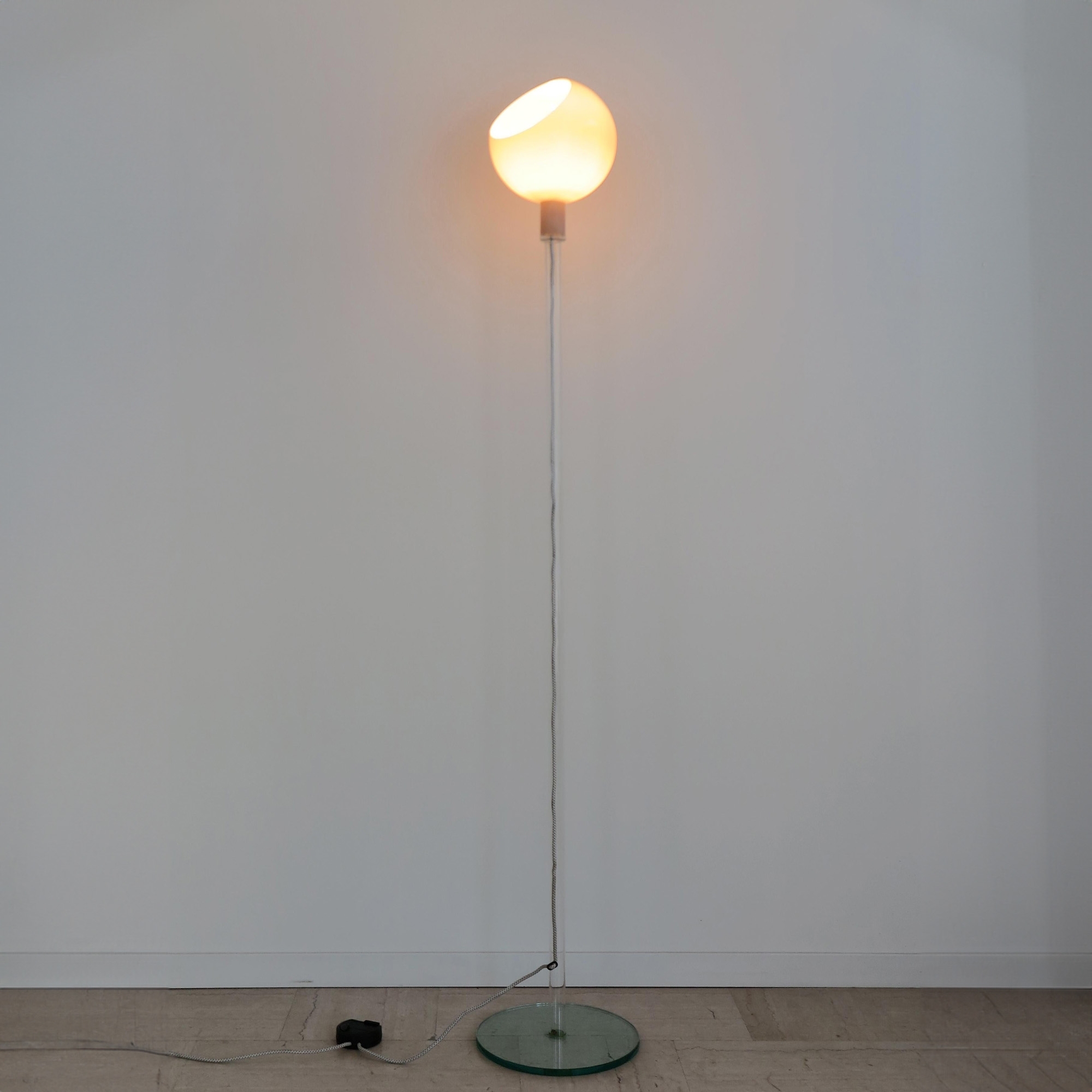 The Parola floor lamp is designed with a diffuser in glossy colored blown glass and a painted polycarbonate ceiling rose. Available in two magnificent colors, the Parola floor lamp is a design masterpiece that will bring an unmatched style into your home. This lamp stands as an exemplary model of how craftsmanship and industry can blend to create a product with outstanding quality and design. The particular charm of the Parola lamp relies on its ability to merge three different types and techniques of glass into a single object: the ancient and delicate technique of blown glass endows the Parola lamp with a light and ethereal appearance. This glass, shaped by a breath of air, adds a touch of artistic elegance; the natural glass, also known as raw glass, ensures a clean and minimalist aesthetic effect due to its tactile properties and transparency; the natural crystal, processed with great attention to detail, offers a shine and luminosity that renders the Parola lamp both elegant and sophisticated. These various glass techniques have been masterfully utilized to create a unique and elegant design distinguished by its innovation and quality. Designed by Gae Aulenti and Piero Castiglioni for Fontana Arte.