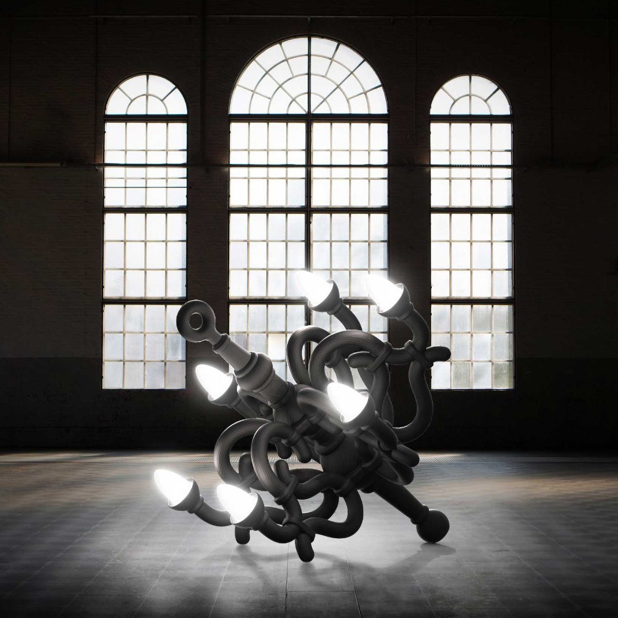 The Chandelier XL is a floor lamp crafted by Qeeboo entirely out of fiberglass, a material known for its excellent resistance to weather conditions and flexibility, making it ideal for both outdoor and indoor use. This XL lamp is available in three stylish color combinations, and its design was influenced by the classic Thonet curves of the 19th century. It is an out-of-scale object that travels through time to stand out as the absolute protagonist in any space it occupies. It blends easily into any style and setting, from a traditional living room to a modern bedroom design. Additionally, each of its arms holds LED lights, surrounded by ornate baroque-style elements that exceptionally refract light, creating a warm luminosity and a welcoming atmosphere. The Chandelier XL lamp is a delightful object of design that is elegant and sophisticated, yet simultaneously a product of functionality and innovation. Designed by Studio Job for Qeeboo.