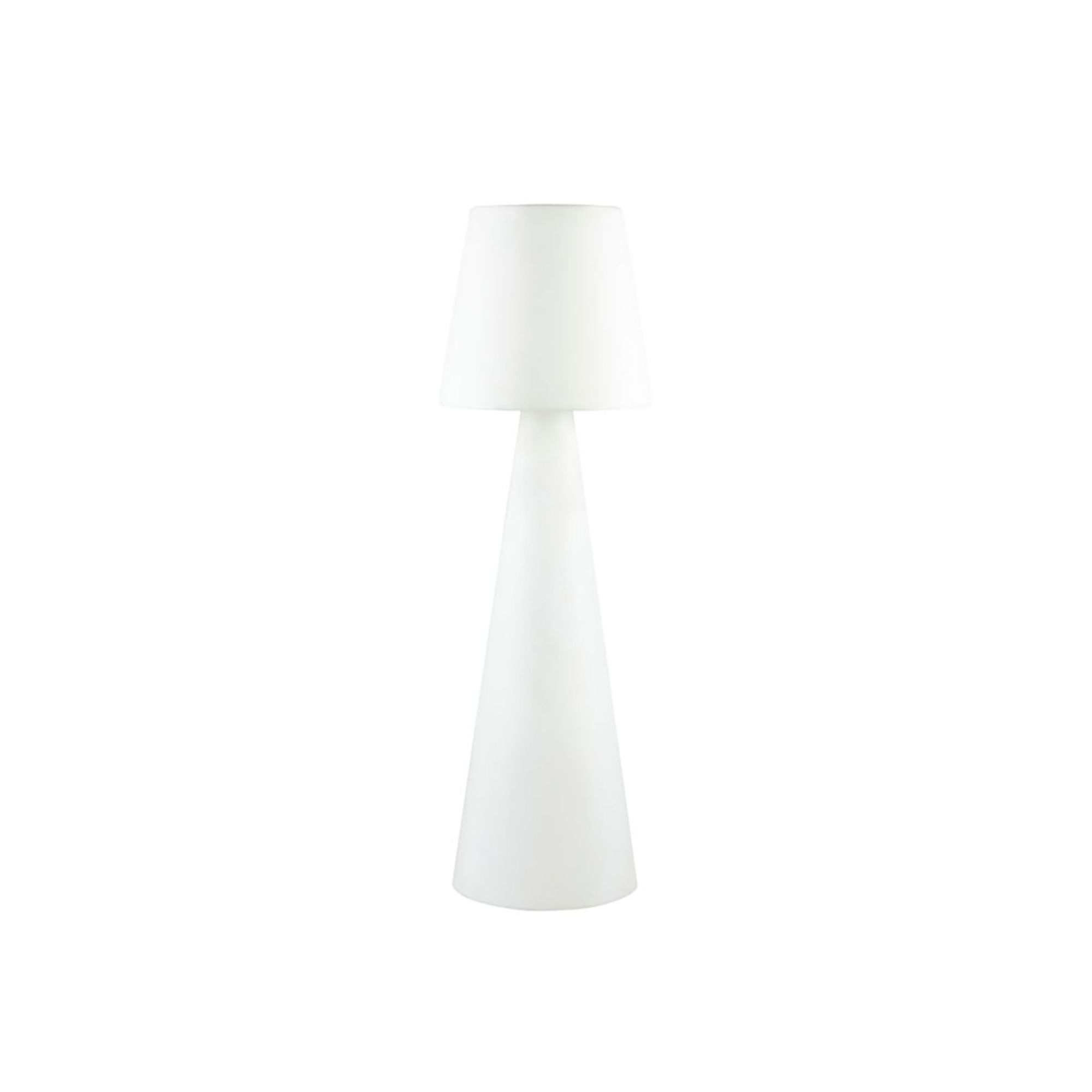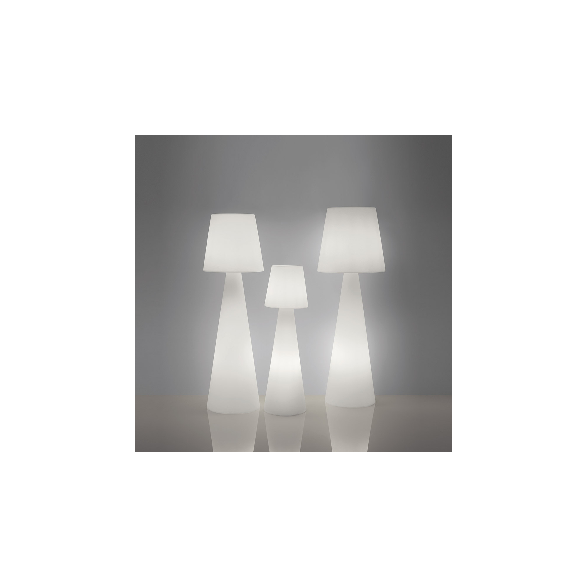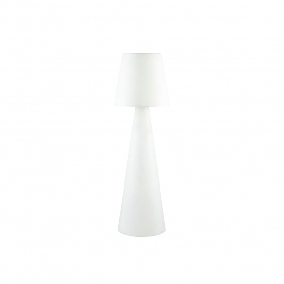 The Pivot floor lamp, in its small version, is a minimalist work of art crafted by Slide entirely out of polyethylene, a material that is 100% recyclable and highly resistant to the elements, making it perfectly suitable for both indoor and outdoor spaces. This floor lamp boasts a design that melds the conical shape of the base with a classic flared lampshade, and thanks to its arabesque embossed texture on the lampshade, it adds elegance and sophistication to any space. Due to its lightweight, Pivot is easy to move, allowing it to be positioned in environments where it's necessary to rapidly change the setting according to different needs. To make relocation even more straightforward, Pivot is also available in a wireless version, with the option to install two Candy Light modules in place of traditional light bulbs. It can be placed in a garden, on a terrace, within an al fresco dining area, but also in a living room or lounge, capturing the attention of all guests. With this product, Slide demonstrates how style and functionality can be seamlessly combined in a lighting accessory that captivates everyone with its unique and stylish presence. Designed by Carlo Constantini for Slide.