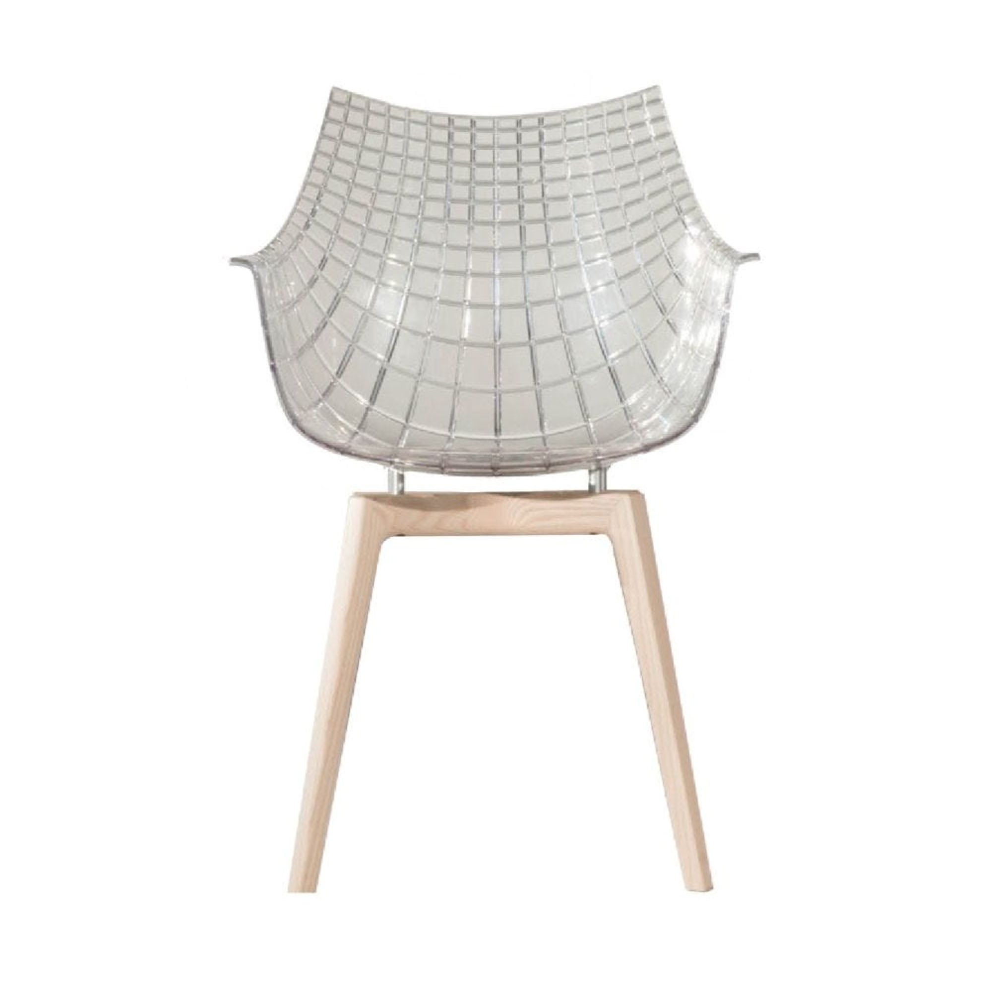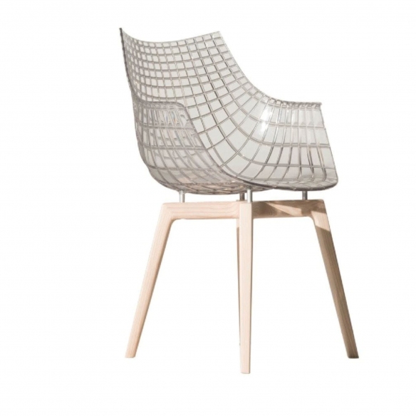 Meridiana chair made with polycarbonate seat and natural ash wood legs. Meridiana is a very elegant and versatile chair and is adaptable to any domestic environment, from the dining room to the office. It takes inspiration from the lines of the diamond, a feature that gives it extreme preciousness. The perfect chair for lovers of suggestiveness in furnishing accessories. Designed by Christophe Pillet for Driade.