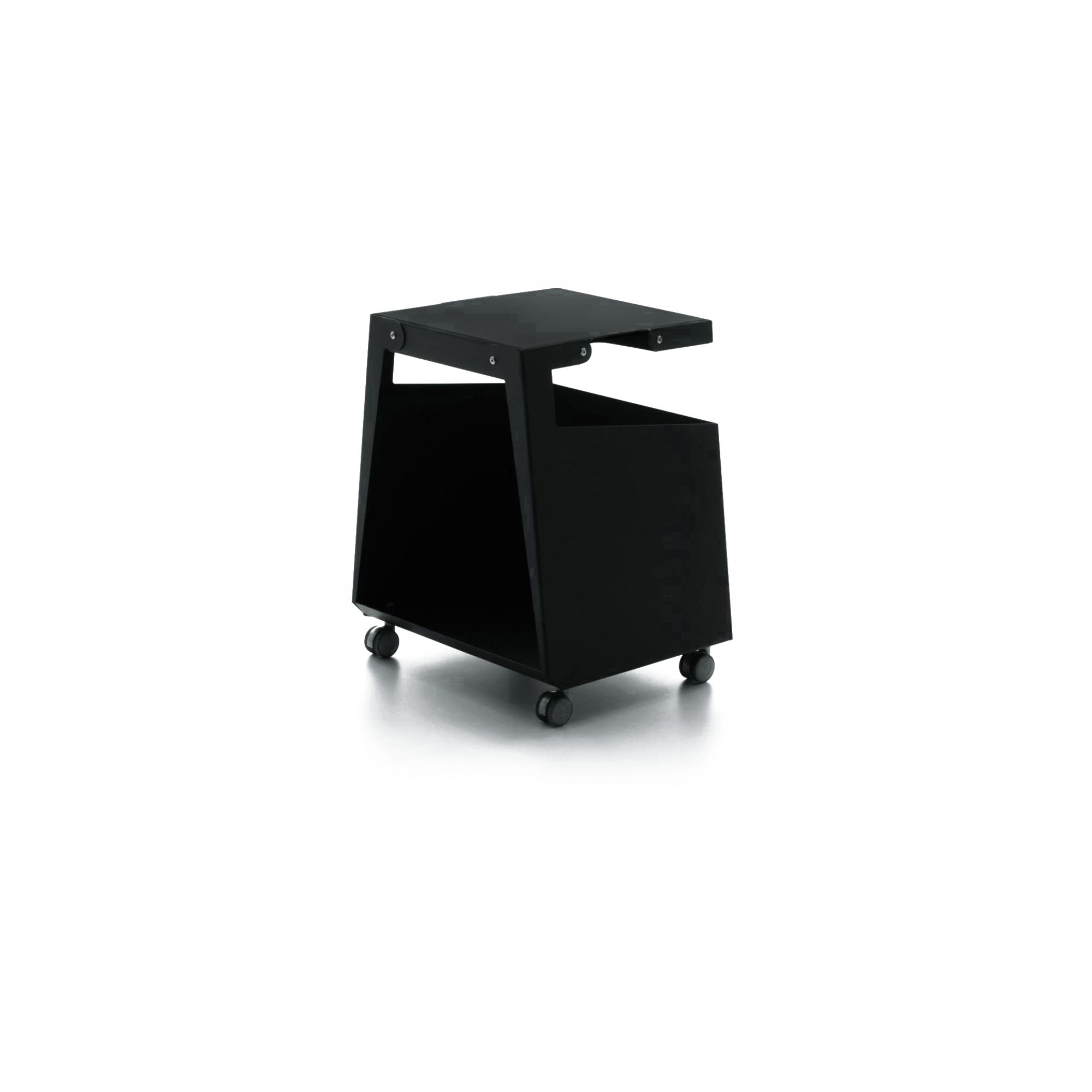 Smith trolley made of powder-coated sheet metal. Available in 3 elegant and striking color finishes, Smith is a very versatile trolley: it can serve as a container for the office, as a table top, as a bookcase and even as a seat. The wheels allow for easy movement of Smith, while the unit can be suspended and hung from a desk or rotated around the workspace. Designed by Johnathan Olivares in 2007 for Danese Milano.