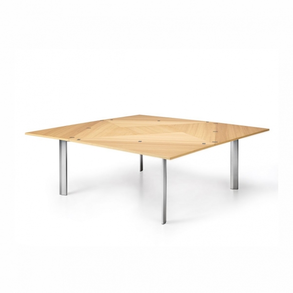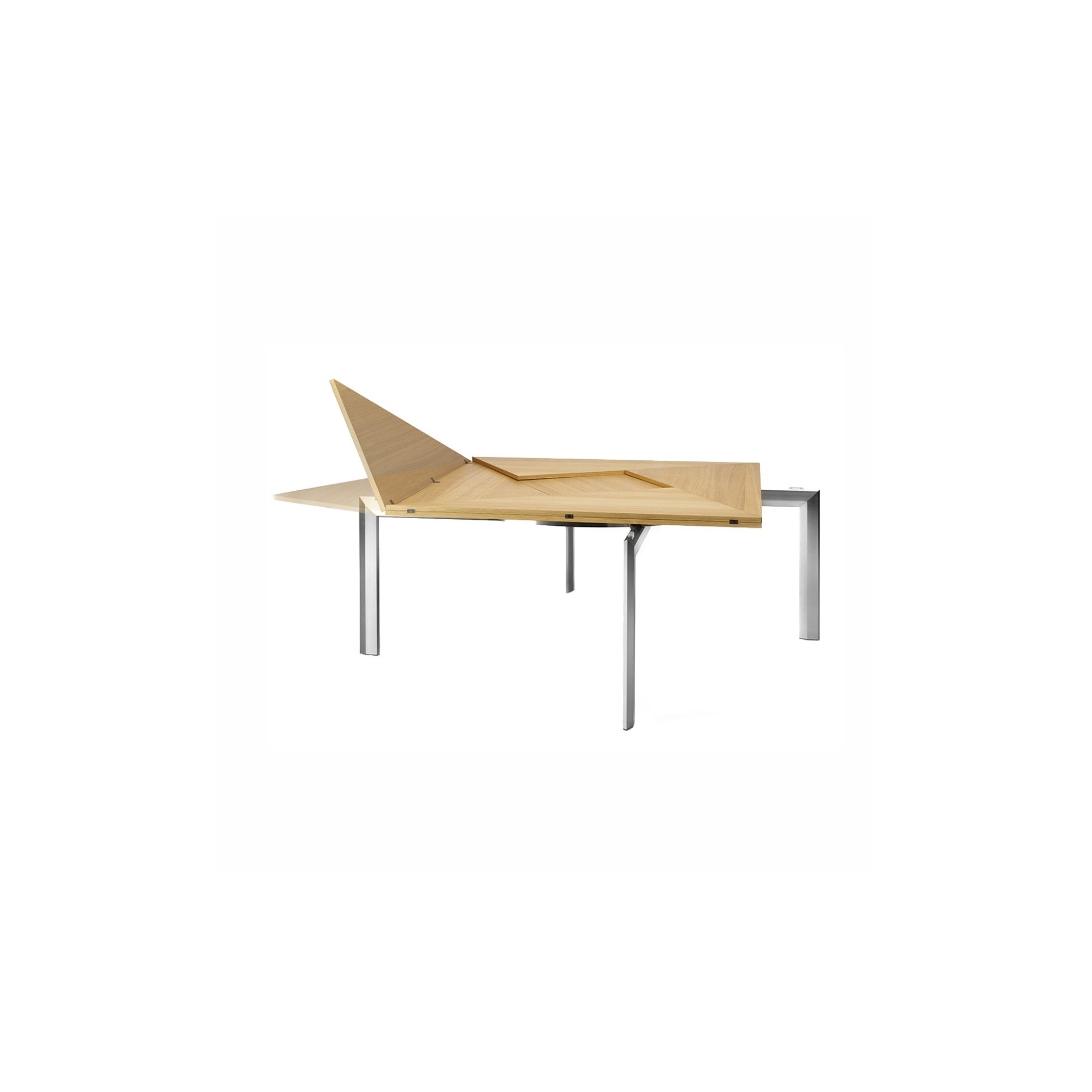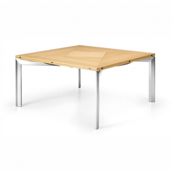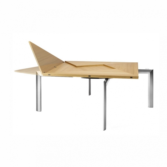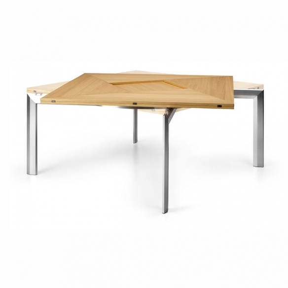 Extendable oak table by rotating the top and opening the sides, the central square sector of the top varies its height position during rotation to keep itself aligned with the surface. Base in brushed stainless steel finish aluminum, tops available in natural oak or wenge-stained oak, designed by Lidor Gilad E Yotam Shabtai for BBB Italia Dimensions Width 103 cm (open 140 cm). Length 103 cm (open 140 cm). Height 74 cm Materials Aluminum, oak