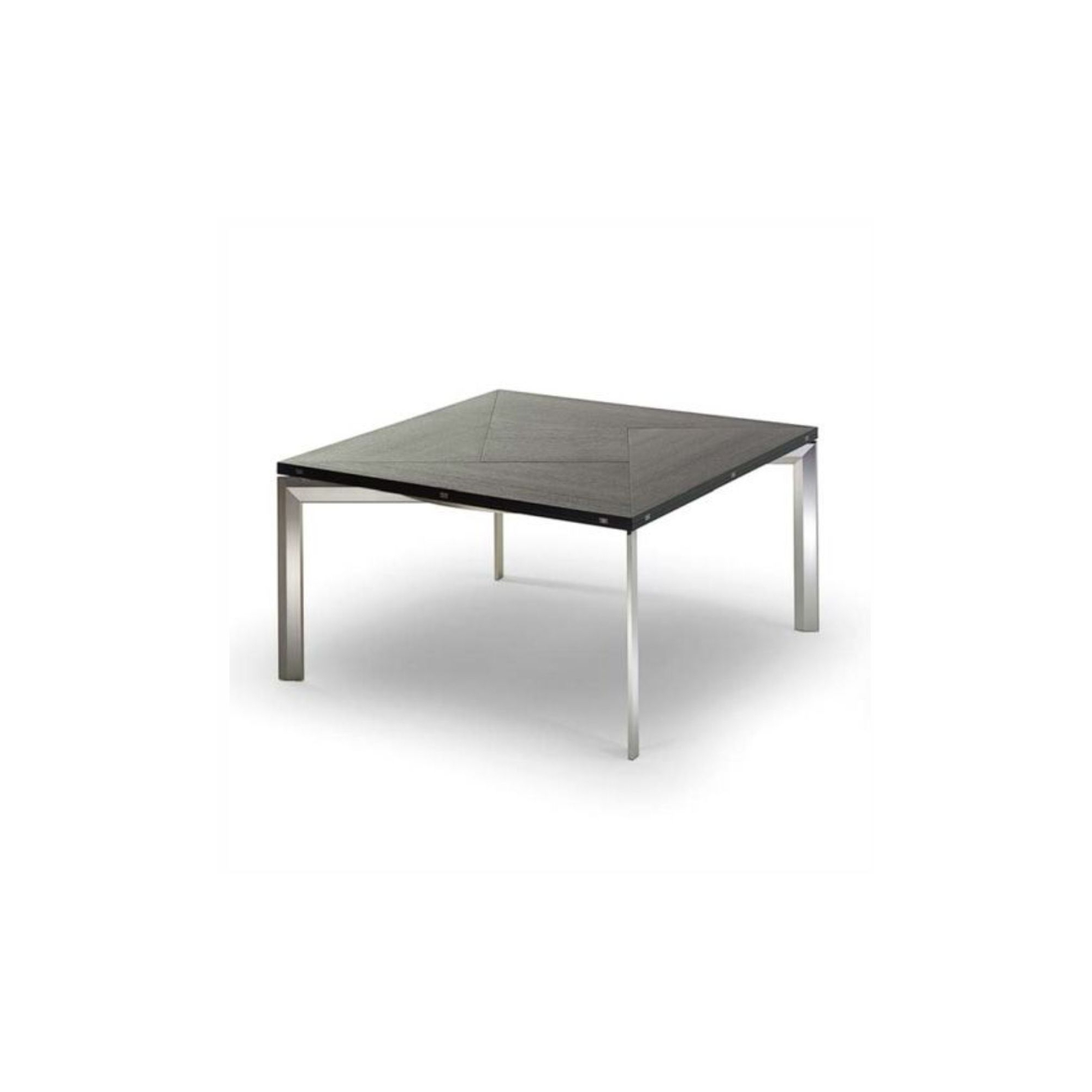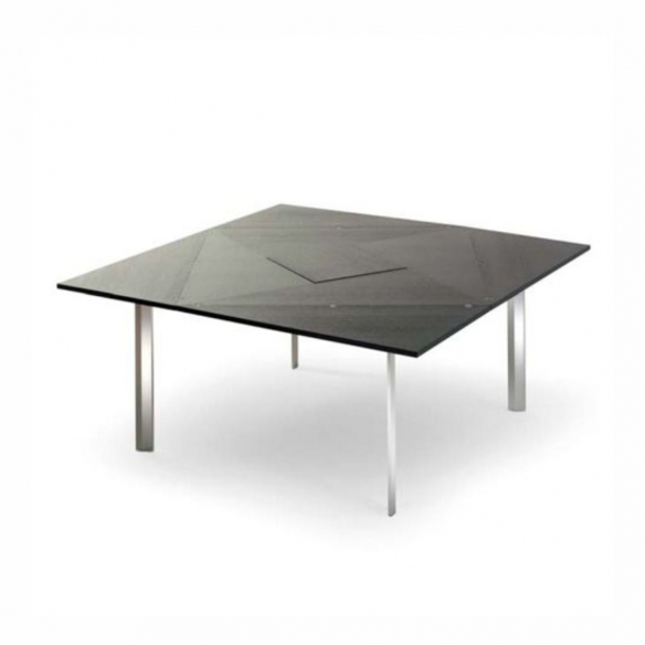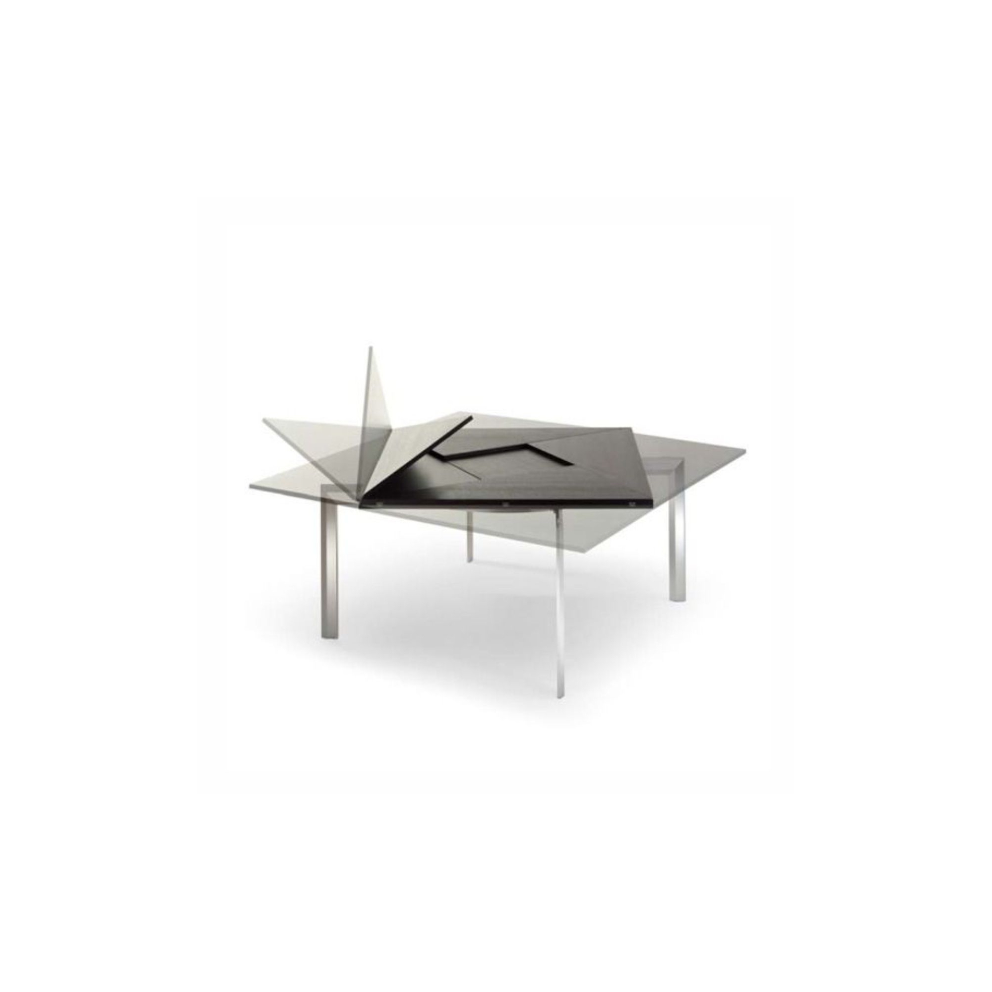 Extendable oak table by rotating the top and opening the sides, the central square sector of the top varies its height position during rotation to keep itself aligned with the surface. Base in brushed stainless steel finish aluminum, tops available in natural oak or wenge-stained oak, designed by Lidor Gilad E Yotam Shabtai for BBB Italia Dimensions Width 103 cm (open 140 cm). Length 103 cm (open 140 cm). Height 74 cm Materials Aluminum, oak