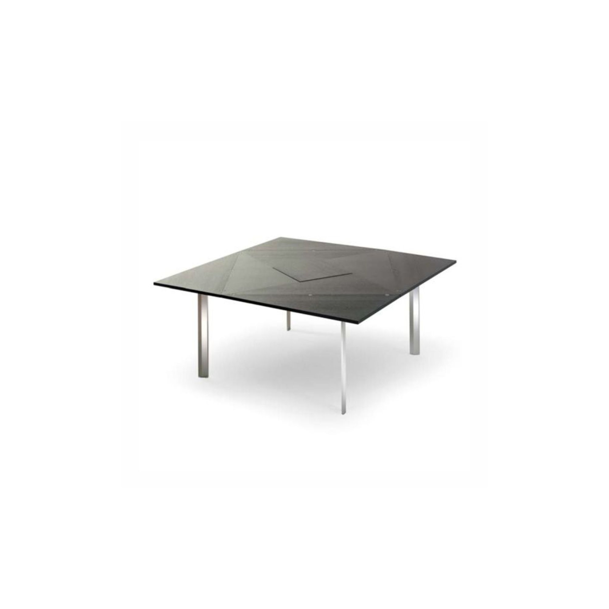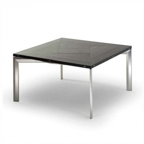 Extendable oak table by rotating the top and opening the sides, the central square sector of the top varies its height position during rotation to keep itself aligned with the surface. Base in brushed stainless steel finish aluminum, tops available in natural oak or wenge-stained oak, designed by Lidor Gilad E Yotam Shabtai for BBB Italia Dimensions Width 140 cm (open 191 cm). Length 140 cm (open 191 cm). Height 74 cm (open 72 cm) Materials Aluminum, oak