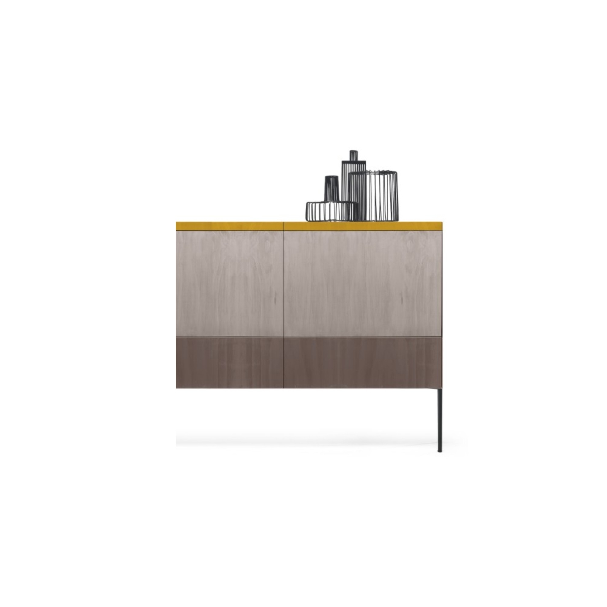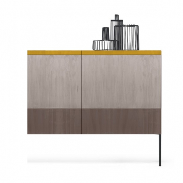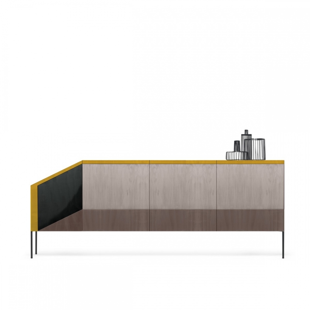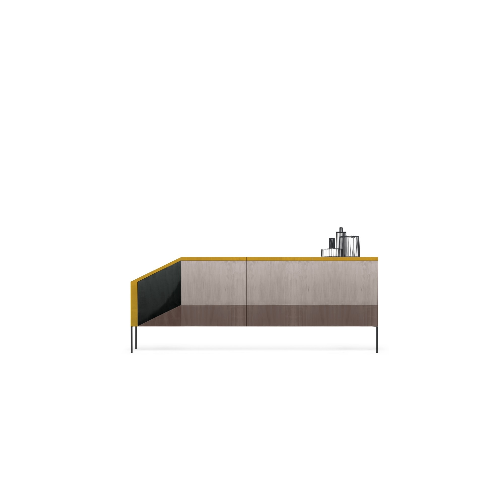 Ritatti sideboard made of MDF veneered with toulipier wood with glossy and matt lacquered finish. The sideboard has 4 doors and 4 internal shelves. Ritratti is an almost magical storage, with an asymmetric shape and the detail of the cut corner. Sharp lines, play of perspectives and strong colours characterized this sideboard. Designed by Dainelli Studio for Mogg.