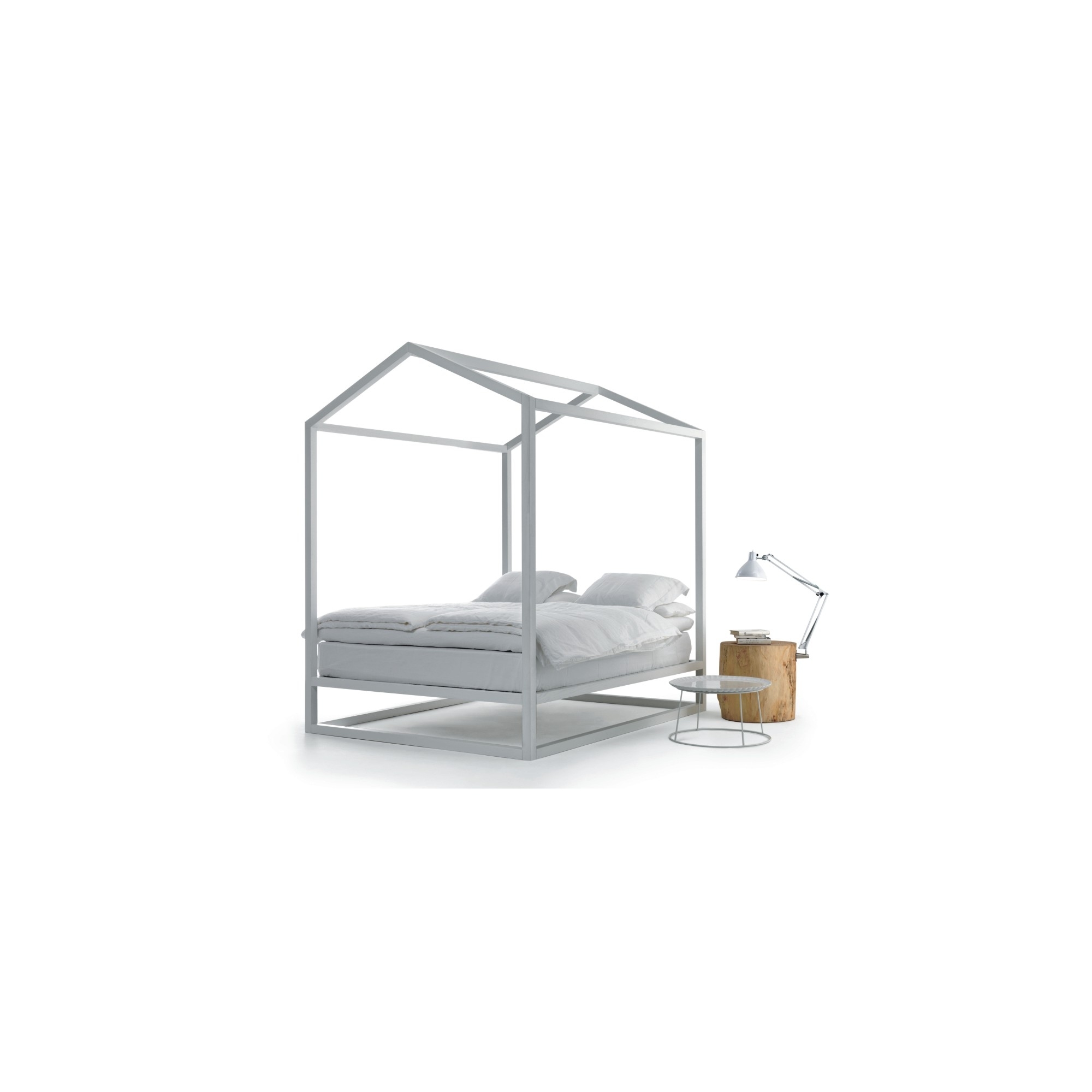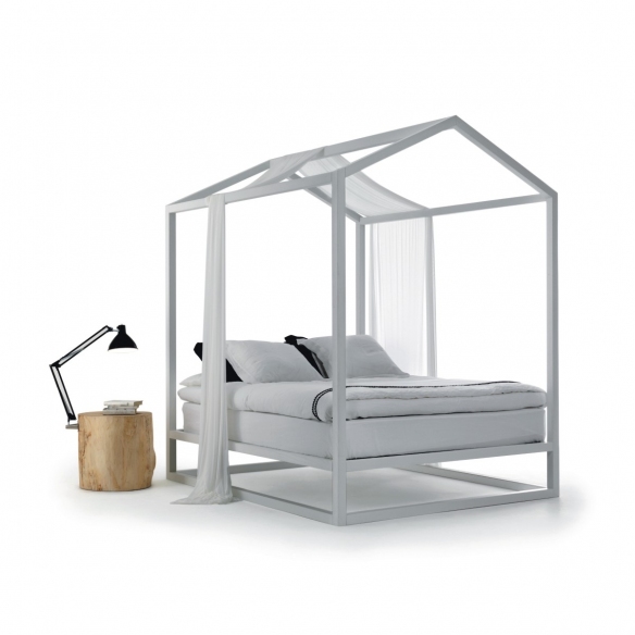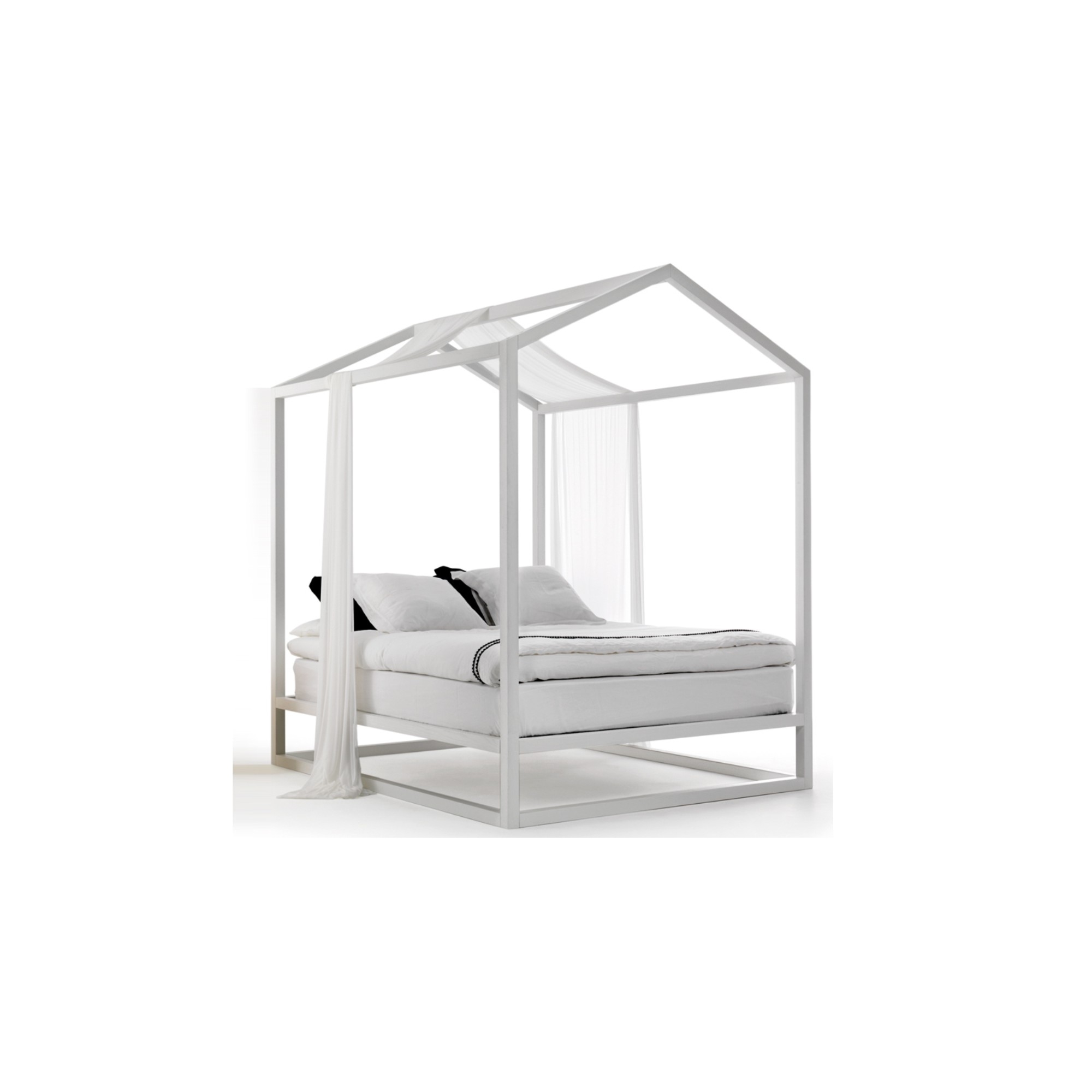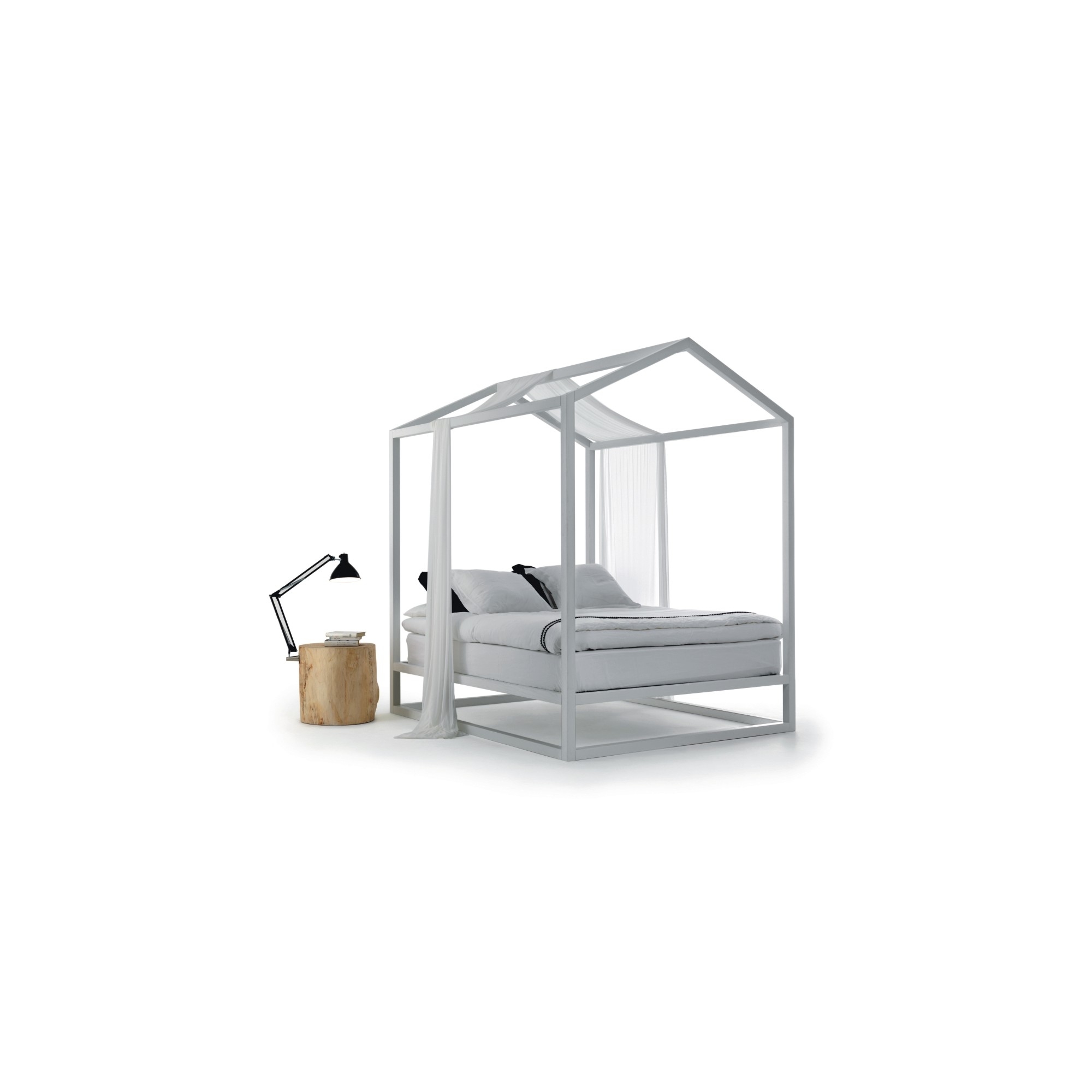 Casetta in Canada four-poster bed made of solid wood structure of lacquered white ash. It recalls in its structure the shape of the house designed by children, as a refuge where to sleep comfortably. It is possible to use mosquito nets and fly screens to make your room or campsite warmer and more elegant. Complete with 160x200 cm slatted beech wood base. Designed by Nathan Yong for Mogg.
