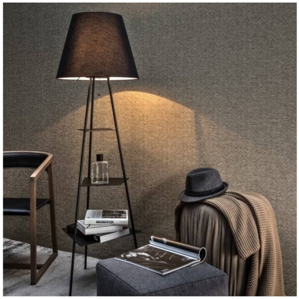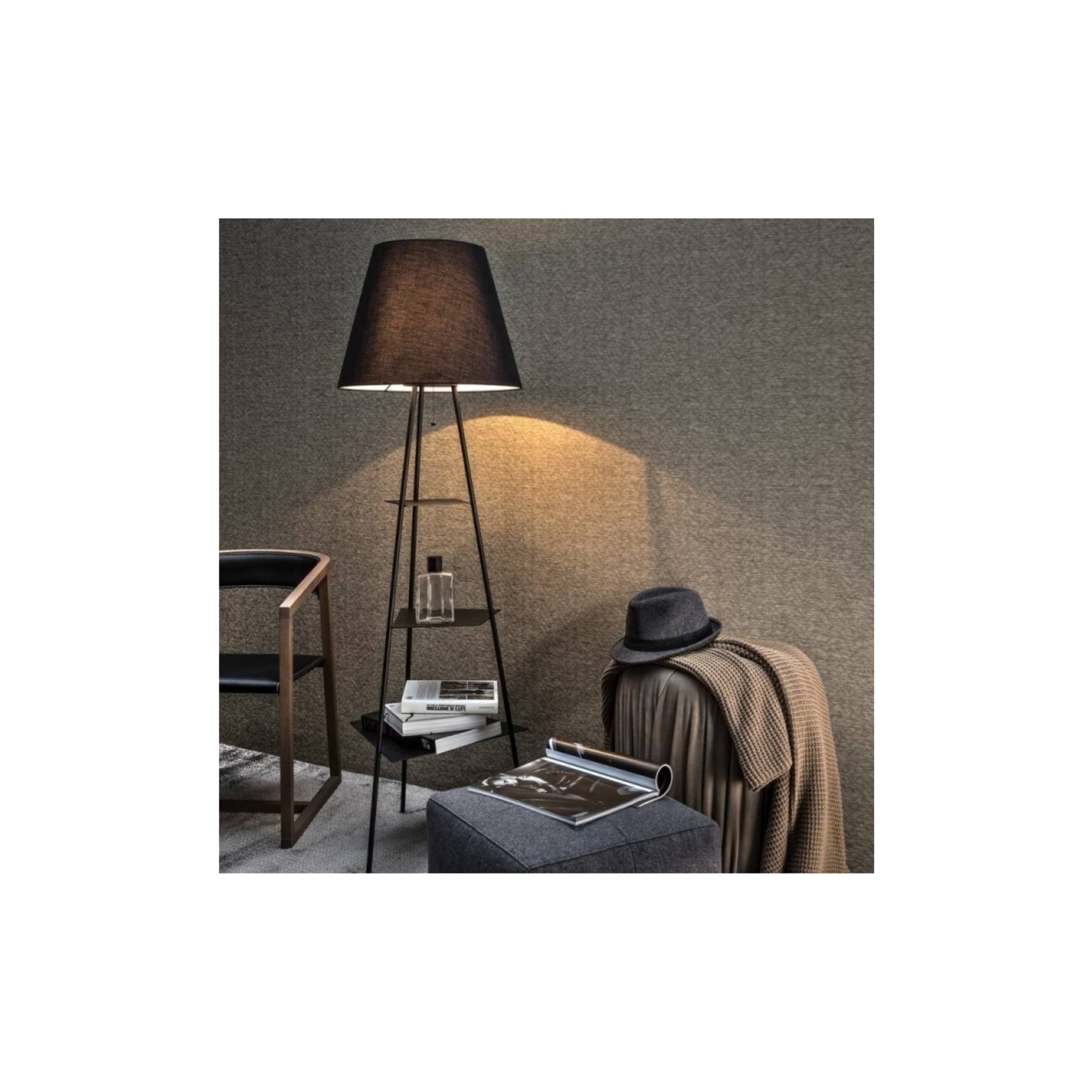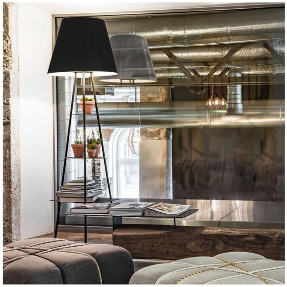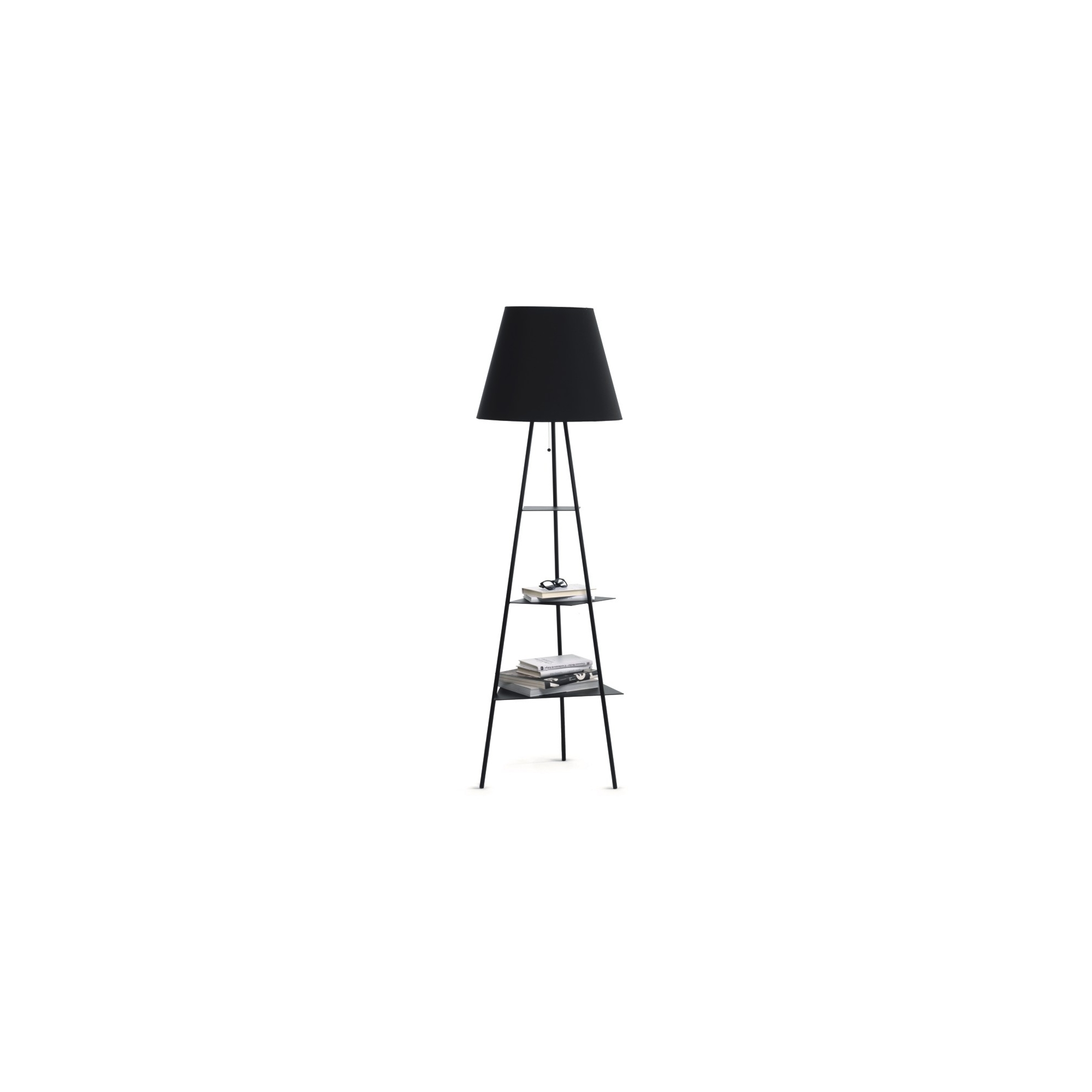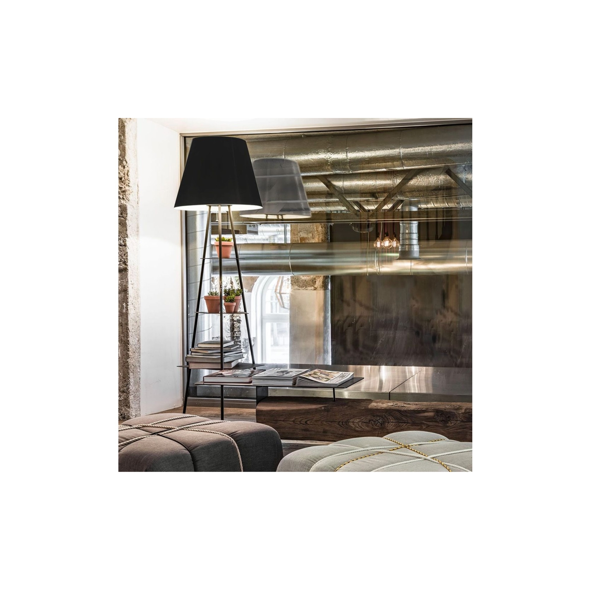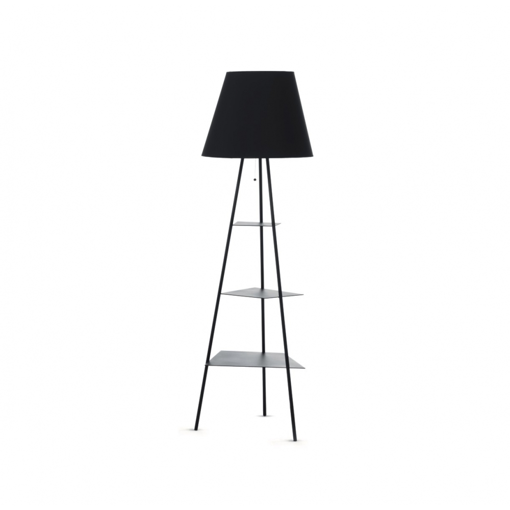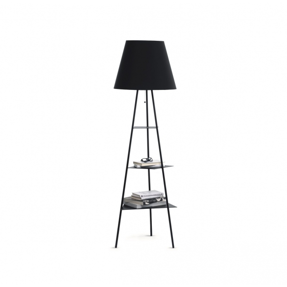 Tribeca floor lamp made of metal with plasticised paper shade and USB charge 12v under the bottom shelf. Available in two colours, Tribeca is a floor lamp which can be a shelve, thanks to the shelves in the structure. Bulb E27. Power 60 W MAX. Designed by Dainelli Studio for Mogg.