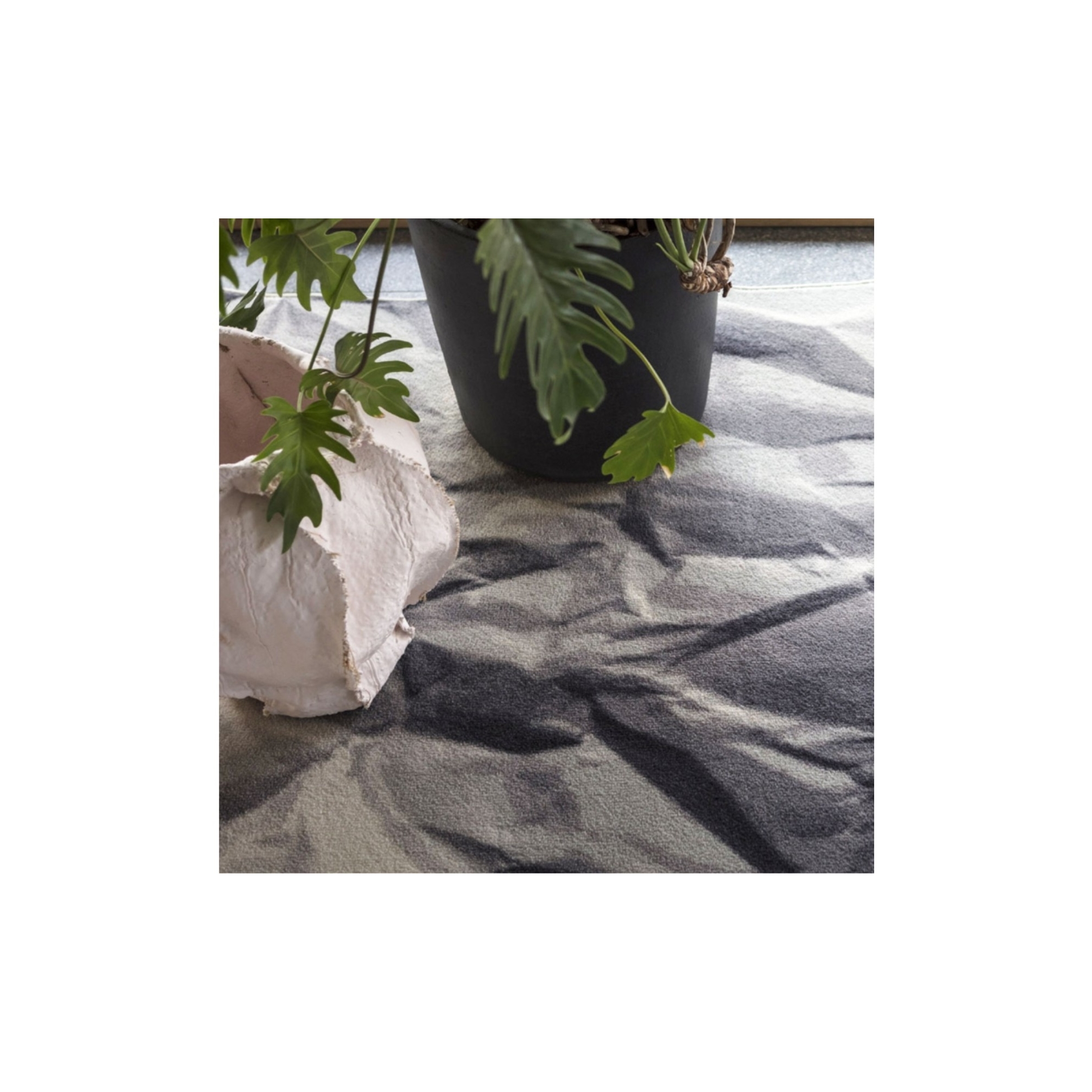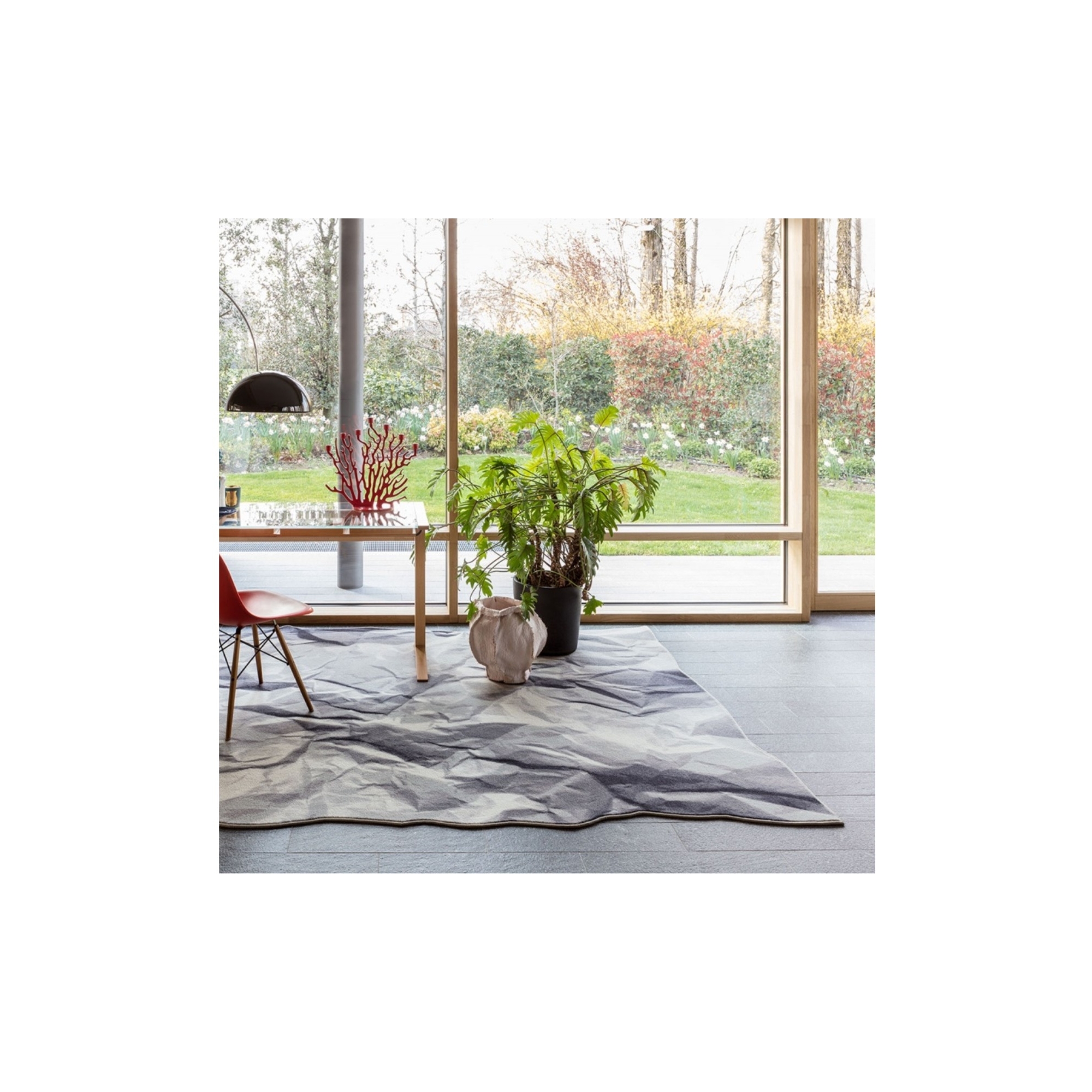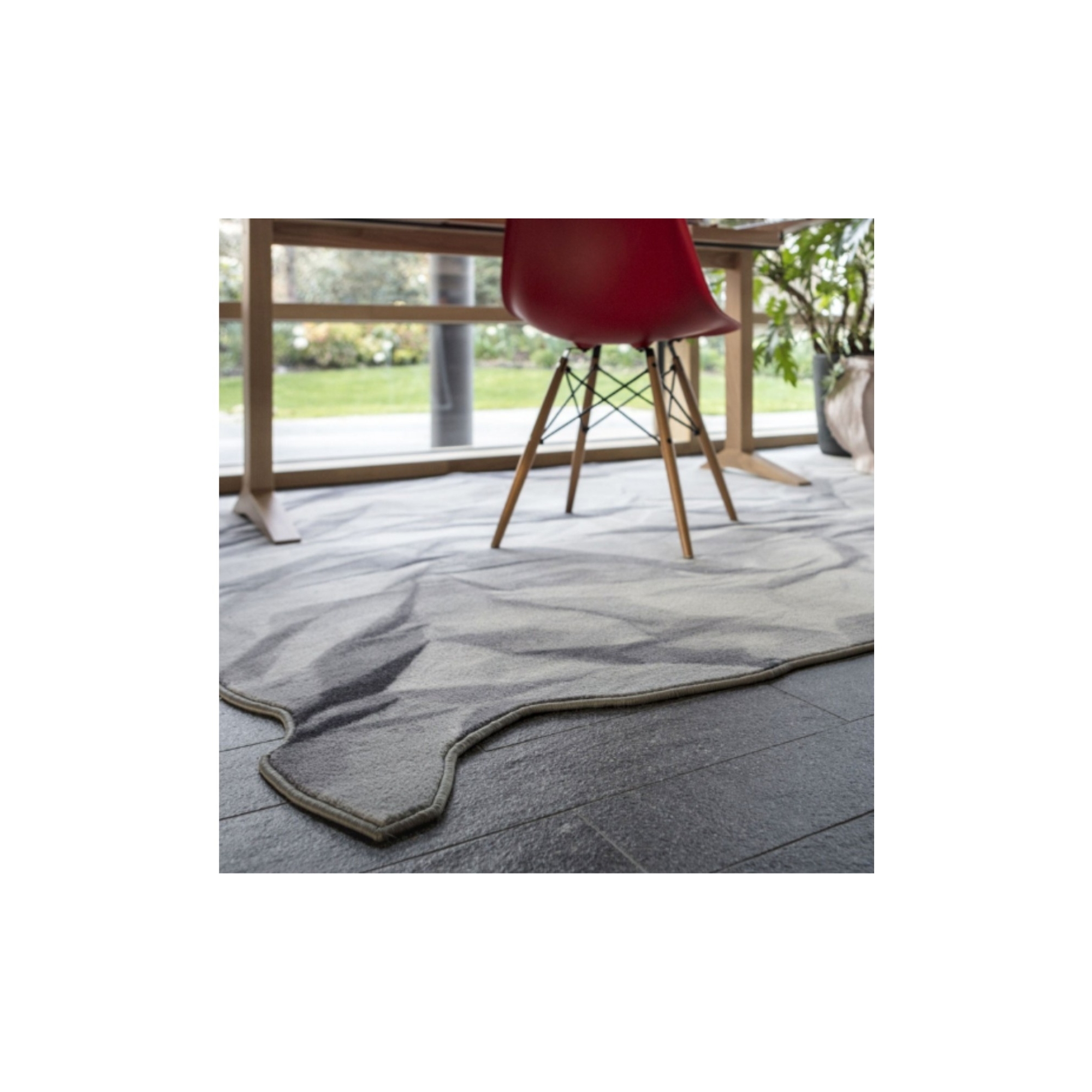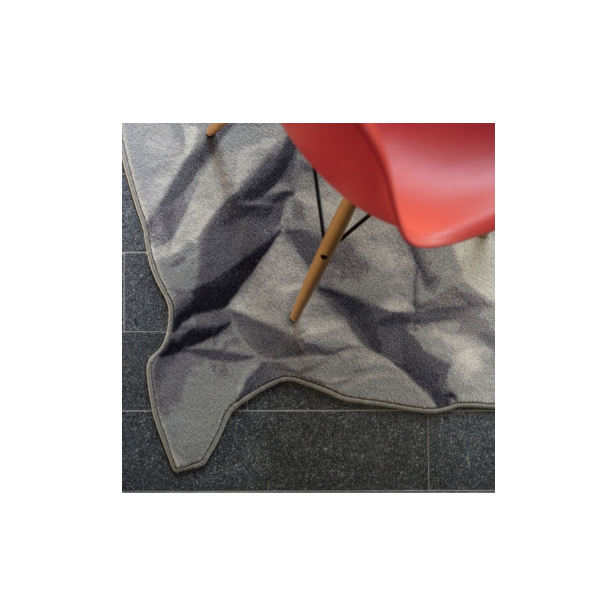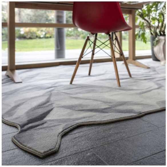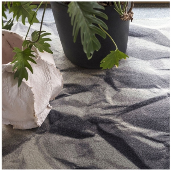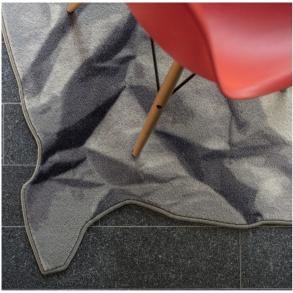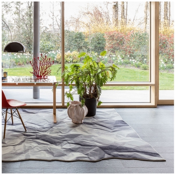 Neversaid rug made of 80% wool and 20% polyamide printed with wire border. Neversaid is the crumpled rug that represents a sheet of paper crumpled up and then opened again. Designed by Alessandra Baldareshi for Mogg.