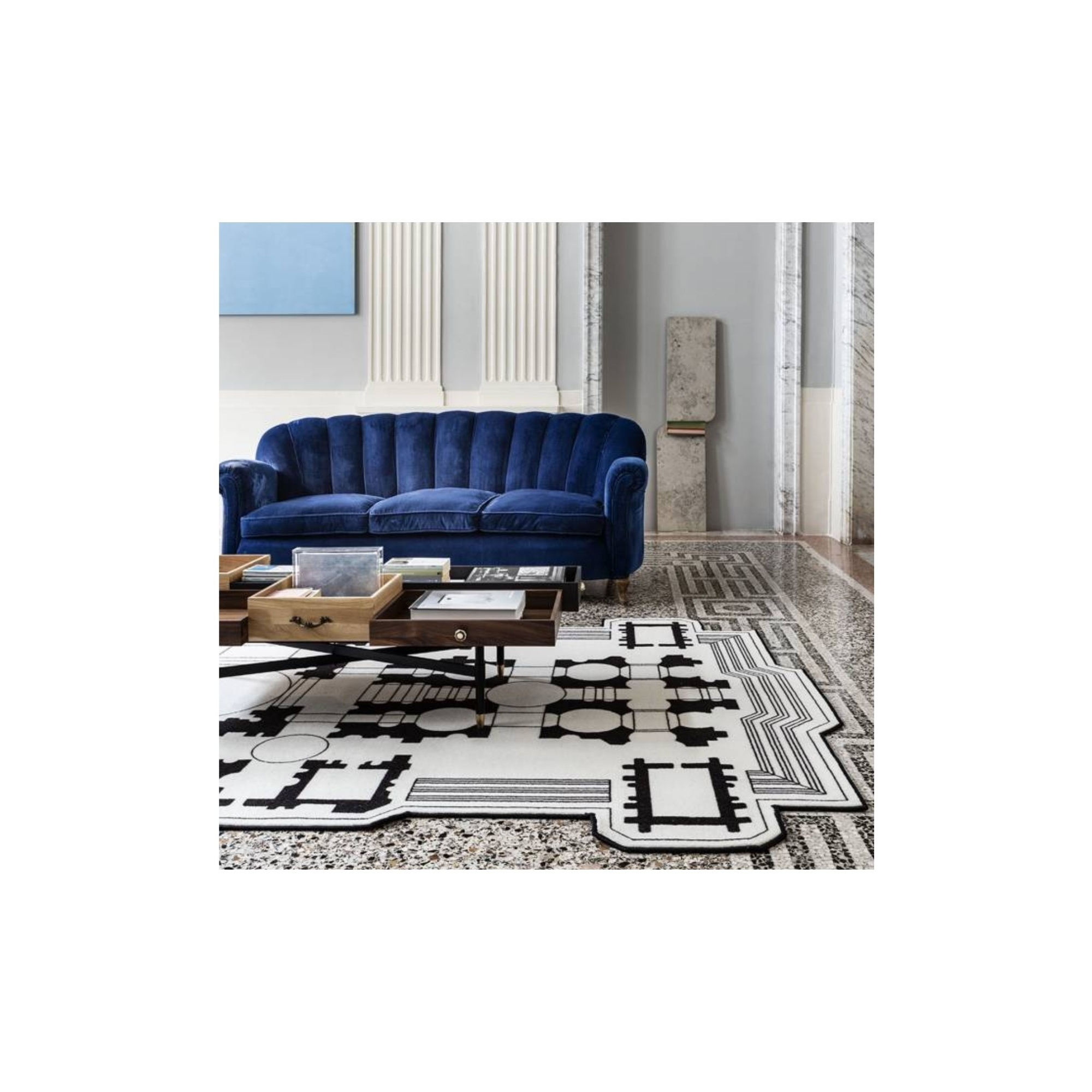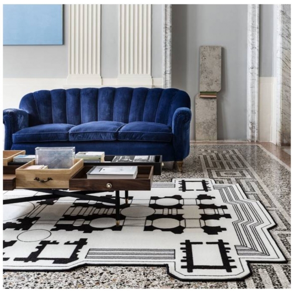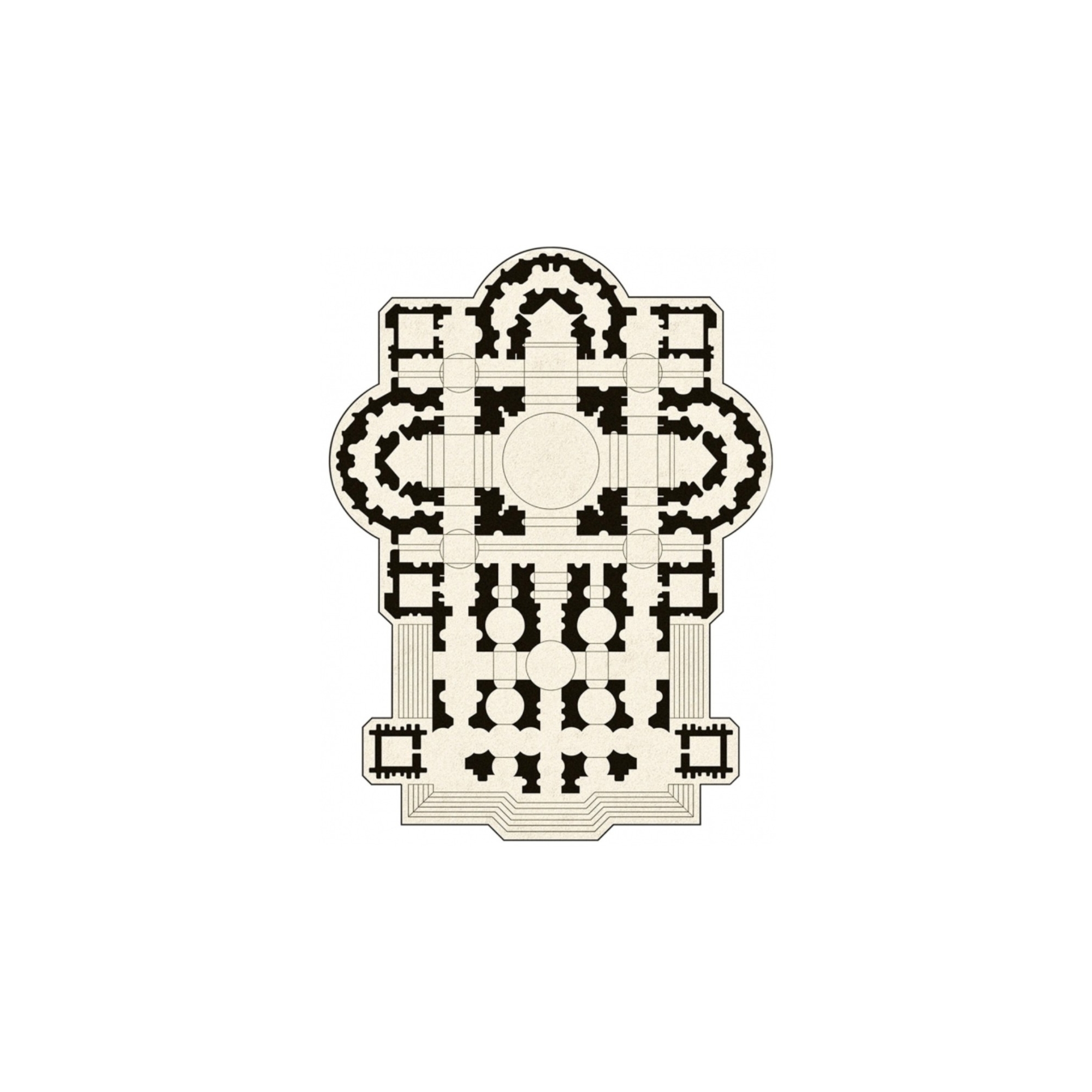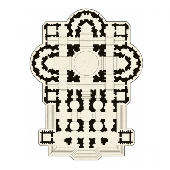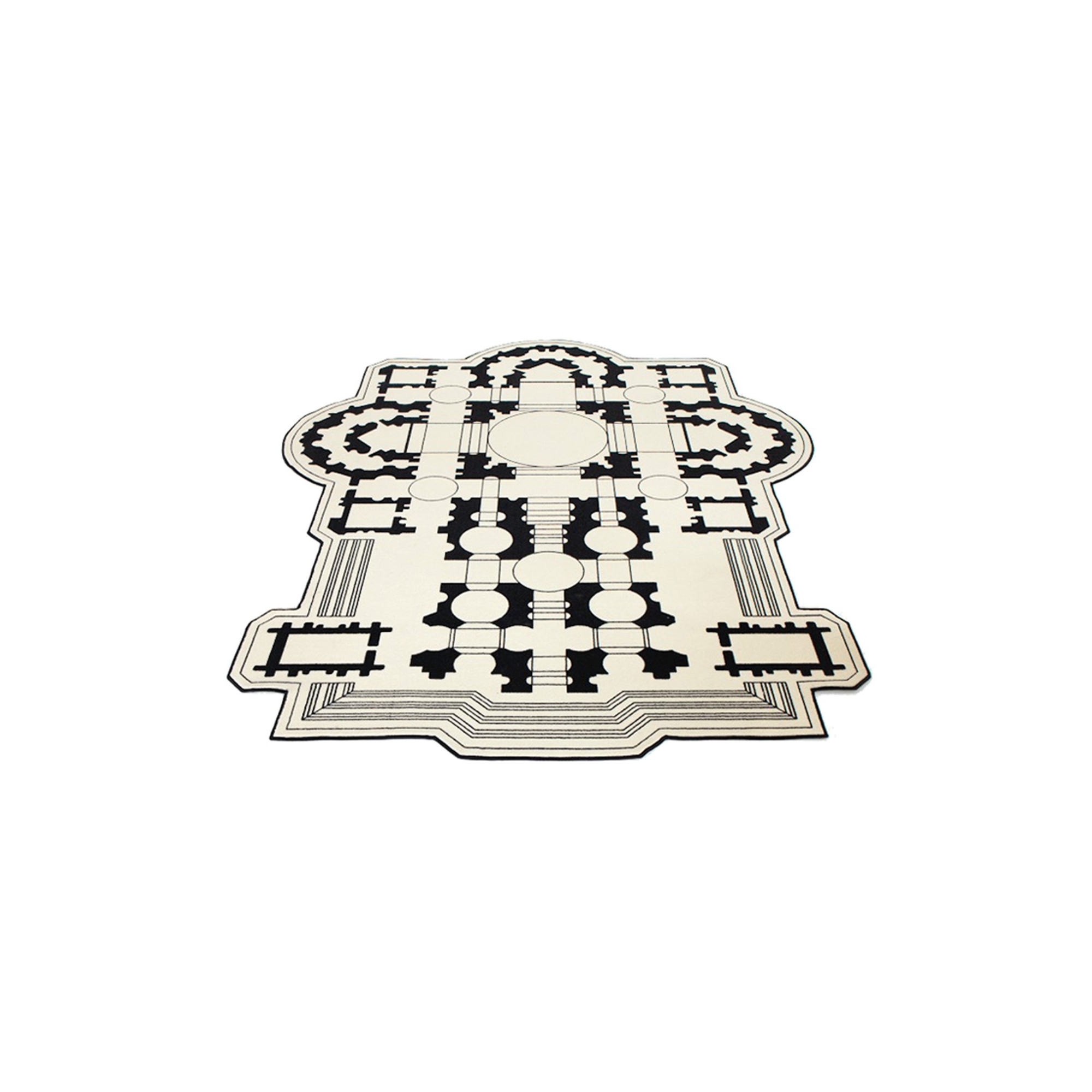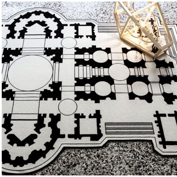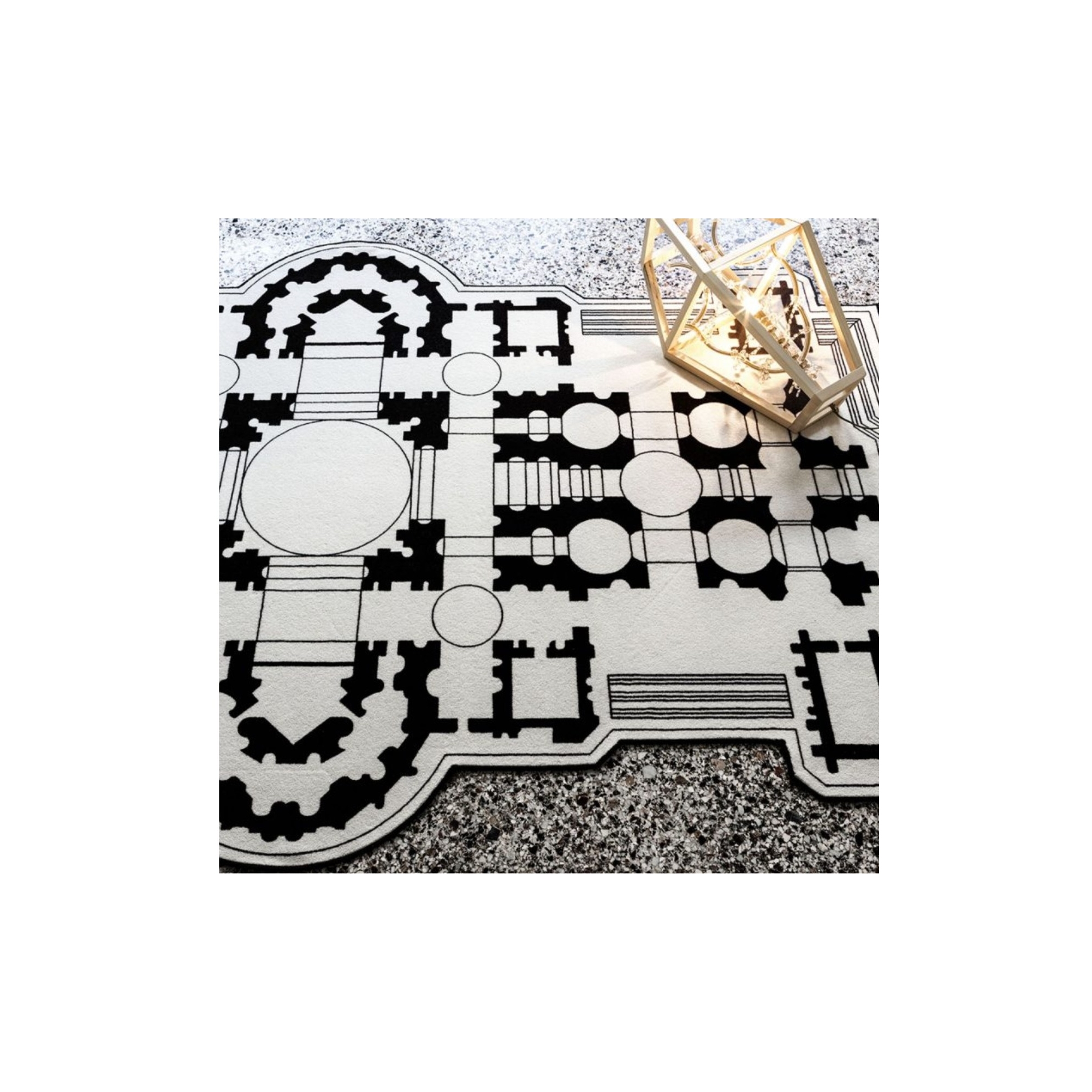 Pietro rug made of 80% wool and 20% polyamide printed in black and white with a wire border. Pietro is based on the floor plan of St. Peter's Basilica, a late Renaissance church located within Vatican City. Pietro is the rug for color who likes architectural designs. Designed by Mura&Pezza for Mogg.