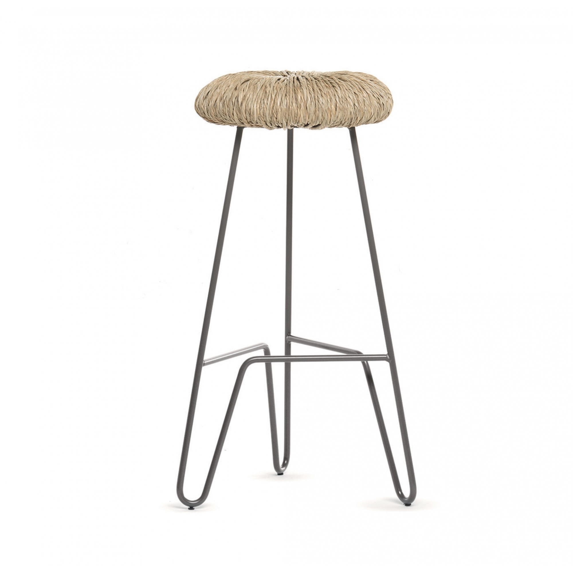Donut Stool with staw padded seat and curved metal structure available in white and anthracite gray. The original straw weave allows to obtain both a contemporary design and a comfortable seat, designed by Alessandra Baldereschi for Mogg. Dimensions : Height 65 cm. Item material: Metal, Straw.