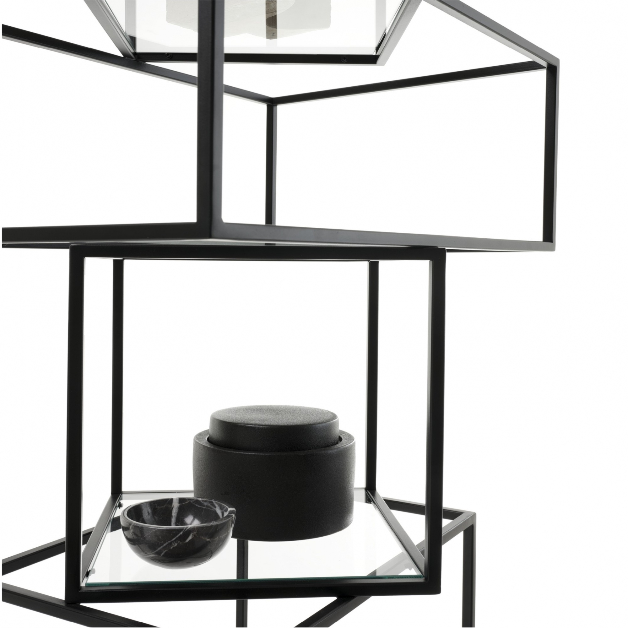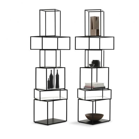 Freestanding black lacquered metal storage, equipped with transparent crystal shelves. Designed by Emanuele Magini for Mogg.