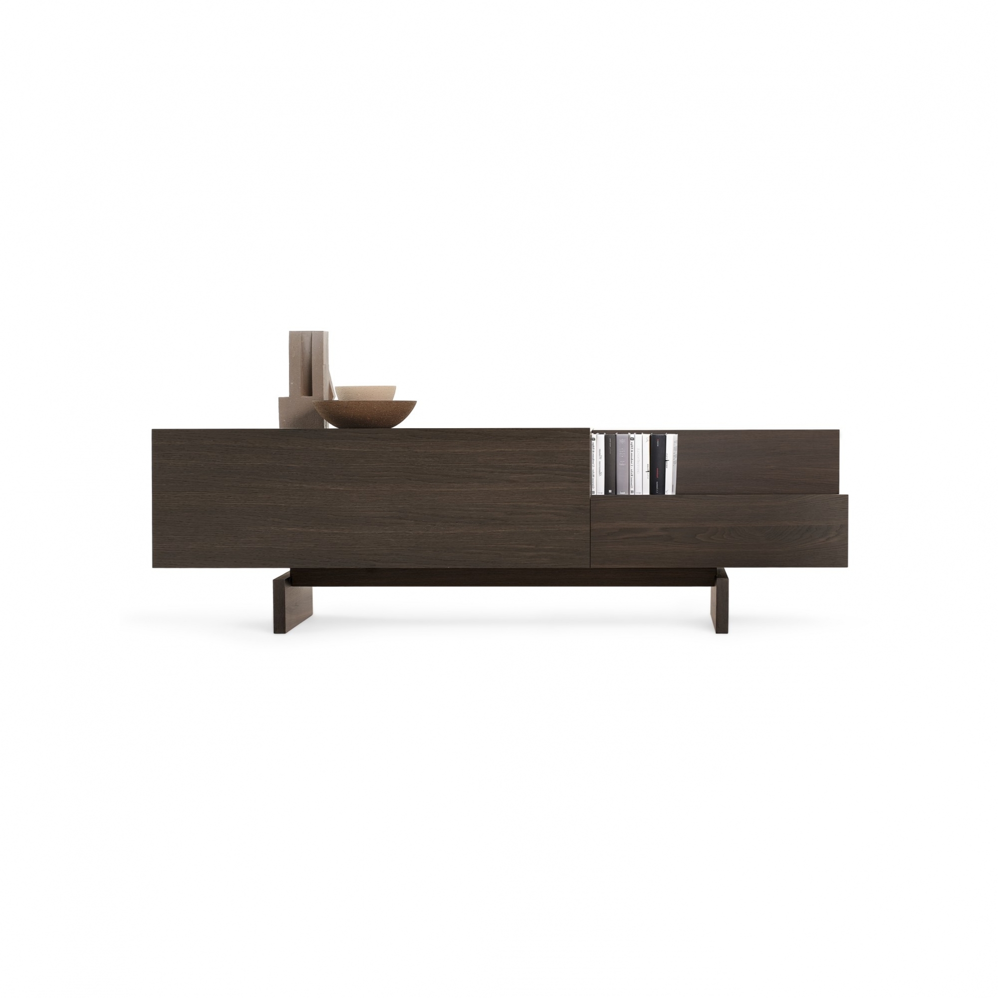 Ella Cupboard with mdf structure in black oak heat-treated. Ella is a well shaped container, made of simple and compact elements, juxstapposed and geometrically arranged. Thanks to its architectural character, Ella perfectly fits in any corner of the living area, giving a more stylish touch to the environment, designed by Uto Balmoral for Mogg. Dimensions 230cm lenght, 52 depth, 69 height. Material Wood.