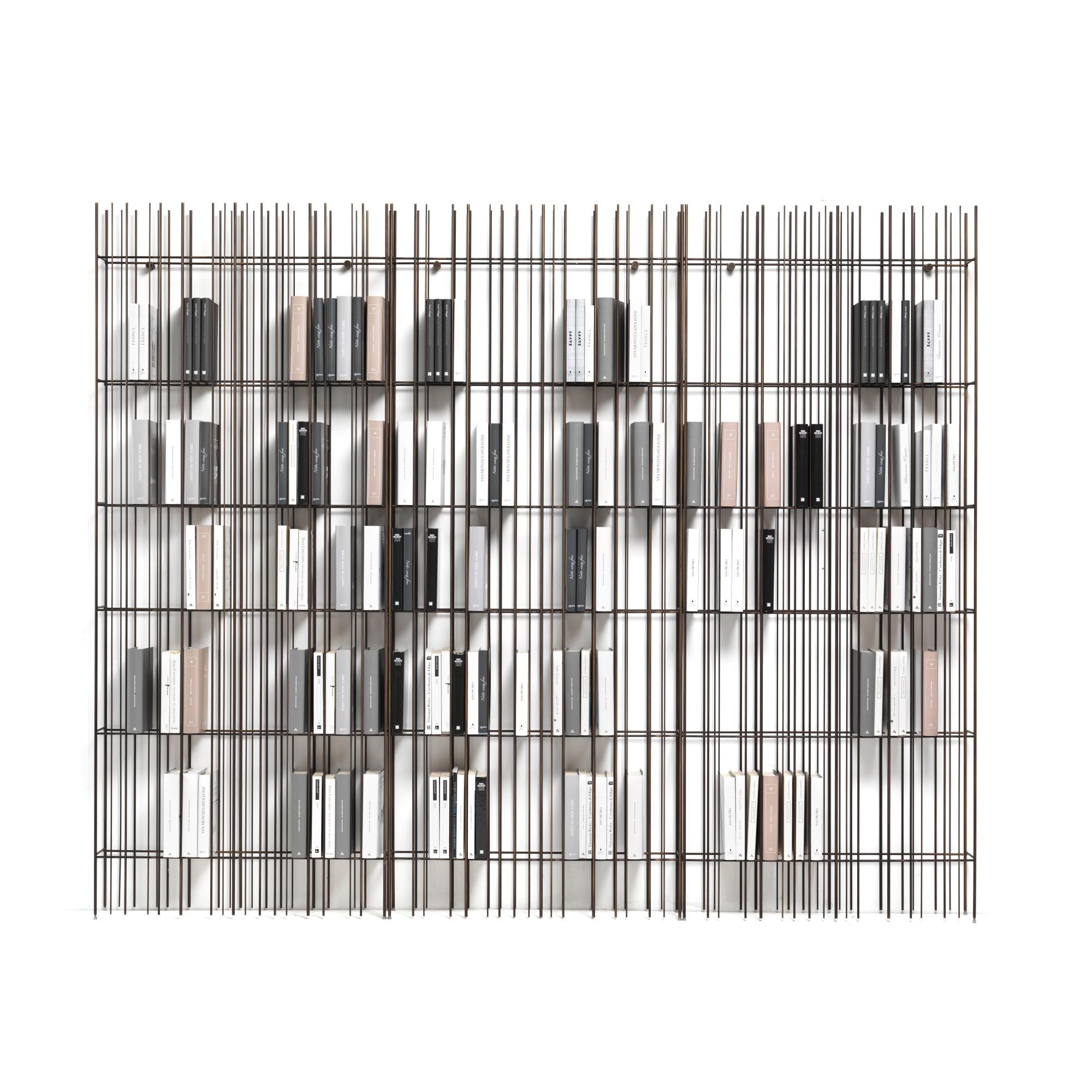 Metrica Wall A bookcase, made with metal structure and optional glass shelves. Available in the splendid finishes in burnished, gold and titanium as regards the structure and in green or bronze as regards the shelves, Metrica Wall is a bookcase with a simple design: the rhythm is marked by iron rods fixed at different intervals, on a rigorous structure, ready to be filled with books and objects. Ideal for furnishings with a contemporary taste, Metrica Wall is preparing to become the protagonist of your living environments. Designed by Ctrlzak for Mogg.