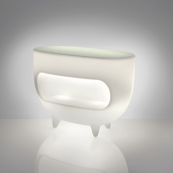 Splay is an illuminated bar counter characterized by its sinuous and elegant silhouette, crafted by Slide entirely from polyethylene, a material that is 100% recyclable, versatile, and weather-resistant, making it ideal for both indoor and outdoor placements. This bar counter is multifunctional: it can be used both as a display for the retail sector and promotional events, and as a catering station. Moreover, its illuminated version can create a warm and special atmosphere, making it perfect to match with any type of context: whether placed in a living room, in a lounge area, in gardens, terraces, or trendy restaurants and venues, Splay adds a touch of luxury and greatly emphasizes the products displayed. Slide confirms its capability to create cutting-edge design furniture by offering the illuminated Splay bar counter as a solution that makes every space contemporary and practical. Designed by Karim Rashid for Slide.