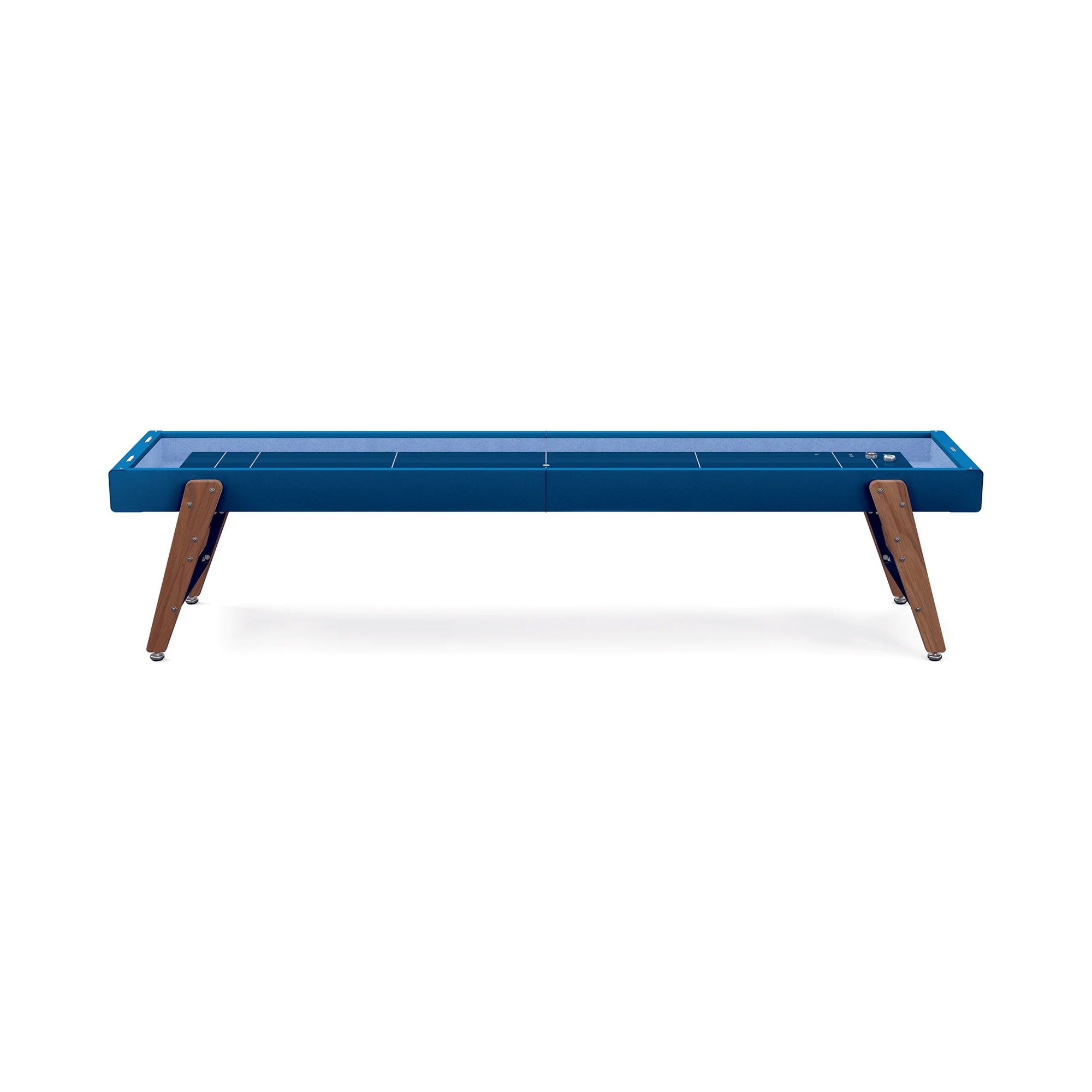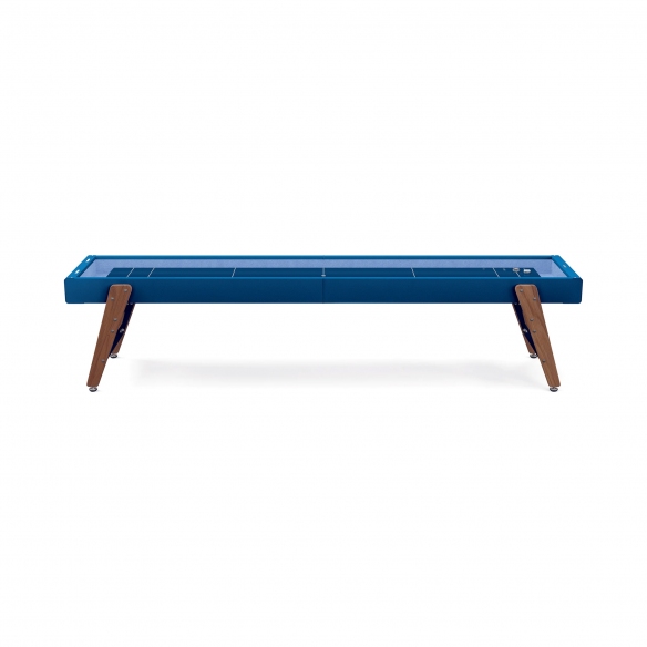 The Track shuffleboard table (12 ft American) by RS Barcelona is a masterstroke of design, melding style, fun, and quality into one exceptional piece. Crafted with a steel structure utilizing a cataphoretic coating process and fine-textured micro powder polyester paint, a game field of painted steel and two-component epoxy resin, FSC/PEFC certified Iroko wood legs, and a 100% PET (60% recycled) internal Textel Echo 9 lining, the Track table guarantees endless entertainment hours. Available in various colors, this shuffleboard table seamlessly blends with any decor or style, whether situated in a home game area, office, or public space, making it a visually striking piece that captures the interest of guests. Additionally, the table includes a set of discs (8 units) and 450 grams (1 pound) of shuffleboard powder to optimize the playing experience. The Track shuffleboard table is more than just a game: it is a statement of style, designed to foster interaction and enjoyment among friends, family, or colleagues. Conceived by Rafael Rodríguez for RS Barcelona.
