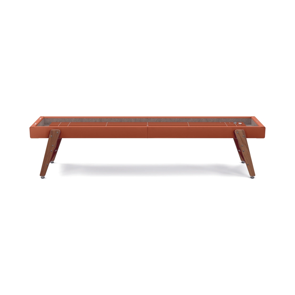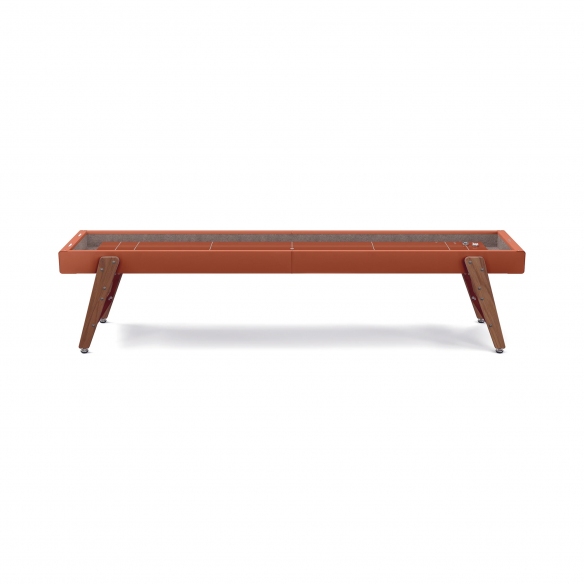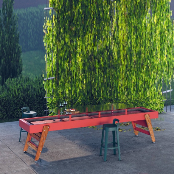 The Track shuffleboard table (12 ft American) by RS Barcelona is a masterstroke of design, melding style, fun, and quality into one exceptional piece. Crafted with a steel structure utilizing a cataphoretic coating process and fine-textured micro powder polyester paint, a game field of painted steel and two-component epoxy resin, FSC/PEFC certified Iroko wood legs, and a 100% PET (60% recycled) internal Textel Echo 9 lining, the Track table guarantees endless entertainment hours. Available in various colors, this shuffleboard table seamlessly blends with any decor or style, whether situated in a home game area, office, or public space, making it a visually striking piece that captures the interest of guests. Additionally, the table includes a set of discs (8 units) and 450 grams (1 pound) of shuffleboard powder to optimize the playing experience. The Track shuffleboard table is more than just a game: it is a statement of style, designed to foster interaction and enjoyment among friends, family, or colleagues. Conceived by Rafael Rodríguez for RS Barcelona.