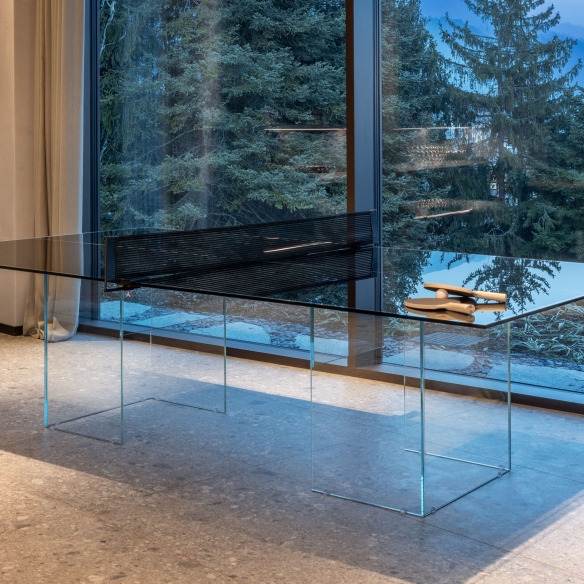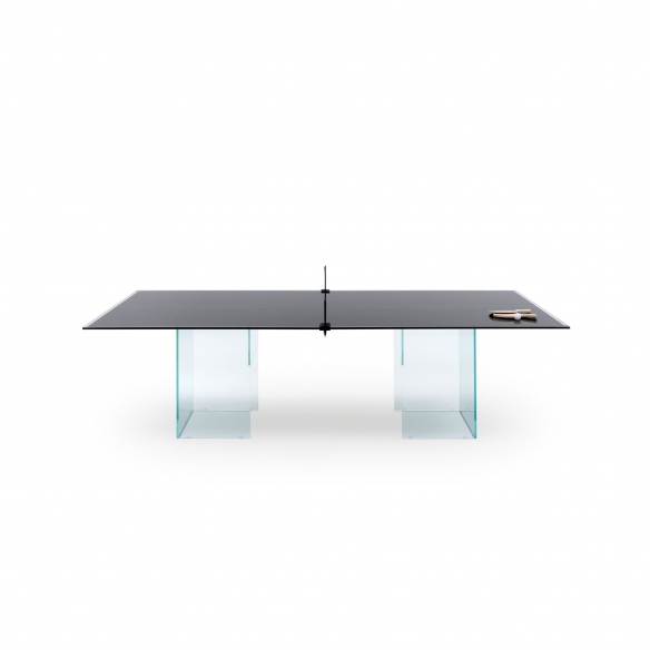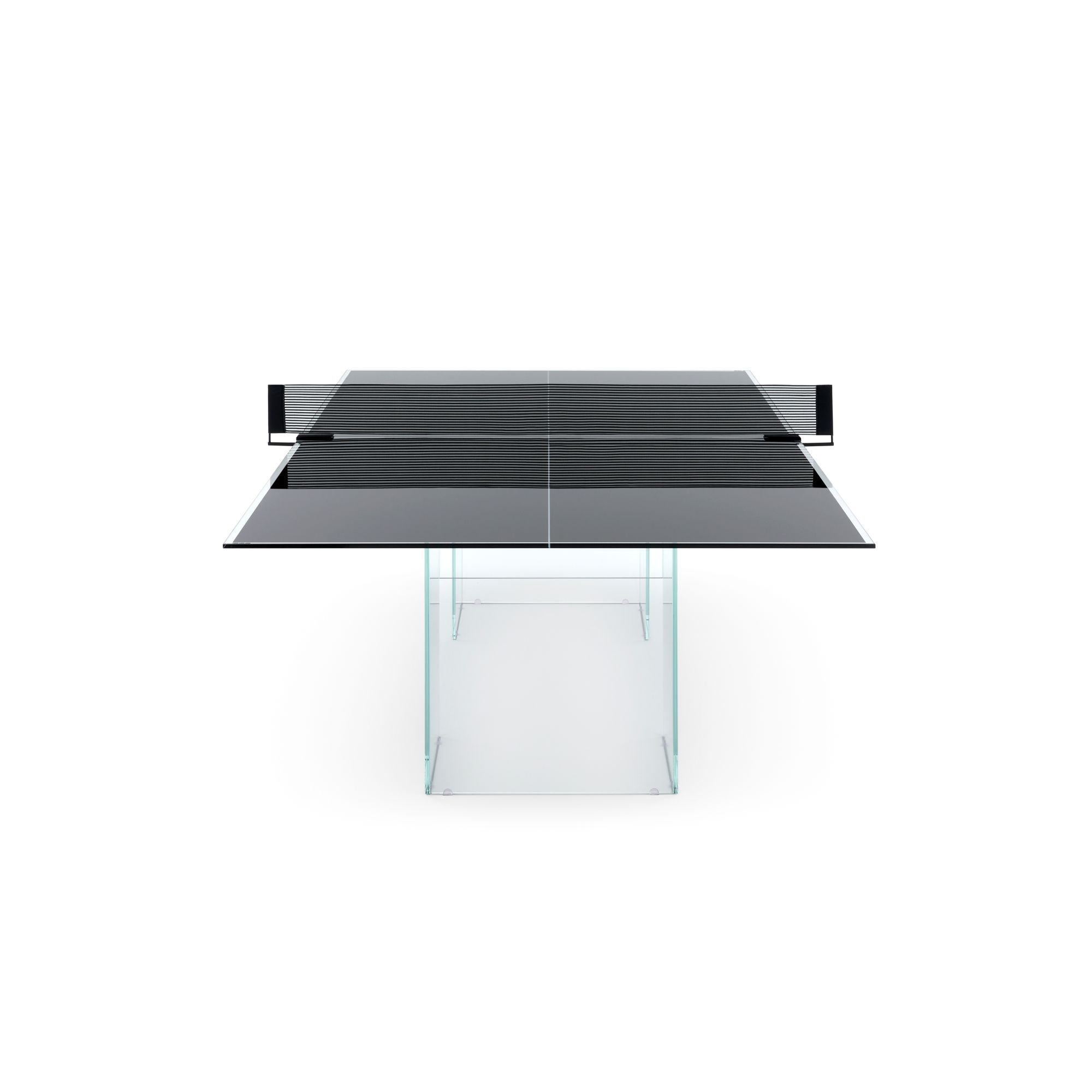 The Crystal Black ping pong table, measuring 274x152.5x76h cm, is a fabulous accessory that will enhance evenings with friends; crafted by FAS Pendezza entirely in glass, legs included. Available in this beautiful black color, the Crystal Black ping pong table is a versatile and elegant piece of furniture that harmonizes with any setting: whether placed within a home game room or in a living room, Crystal invites you to play without limits. The Crystal Black ping pong table is an invitation to share moments of joy, a piece of design that stimulates team spirit and healthy competition. By removing the play net, Crystal transforms into an elegant and understated dining table, ideal for the most modern homes, newly conceived hotels, and the most important representative rooms. Designed by Basaglia and Rota Nodari for FAS Pendezza.