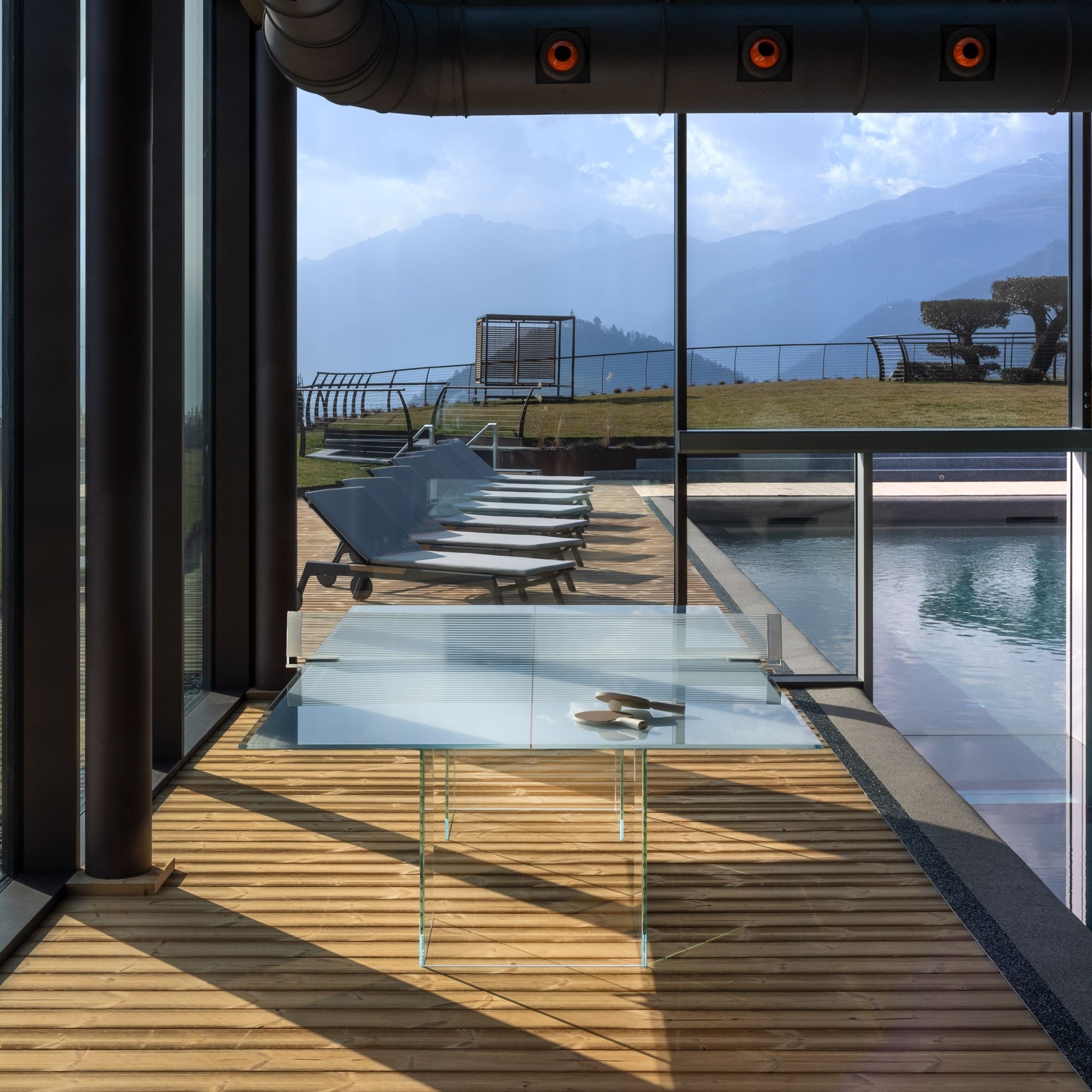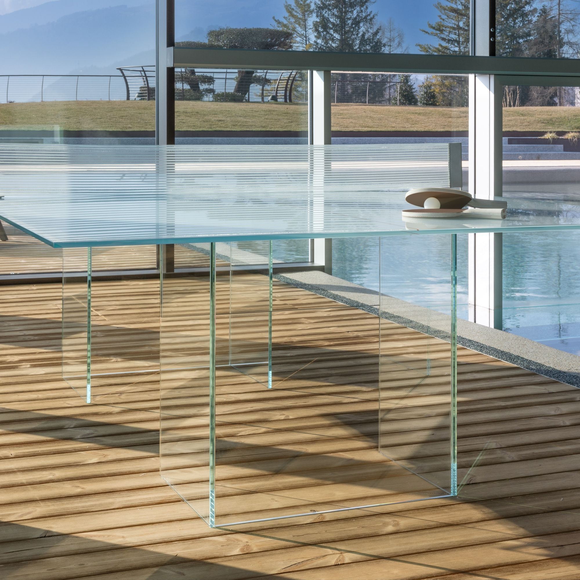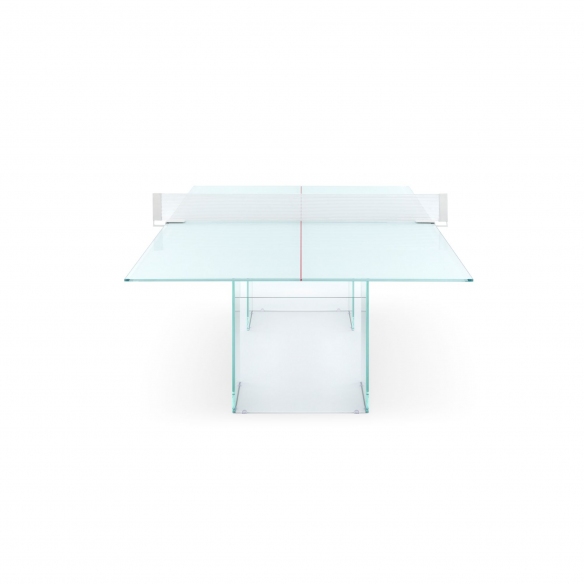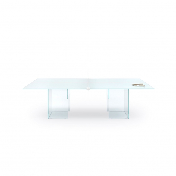 The Crystal White ping pong table, measuring 274x152.5x76h cm, is a fabulous accessory that will enhance evenings with friends; crafted by FAS Pendezza entirely in glass, legs included. Available in this beautiful black color, the Crystal White ping pong table is a versatile and elegant piece of furniture that harmonizes with any setting: whether placed within a home game room or in a living room, Crystal invites you to play without limits. The Crystal White ping pong table is an invitation to share moments of joy, a piece of design that stimulates team spirit and healthy competition. By removing the play net, Crystal transforms into an elegant and understated dining table, ideal for the most modern homes, newly conceived hotels, and the most important representative rooms. Designed by Basaglia and Rota Nodari for FAS Pendezza.