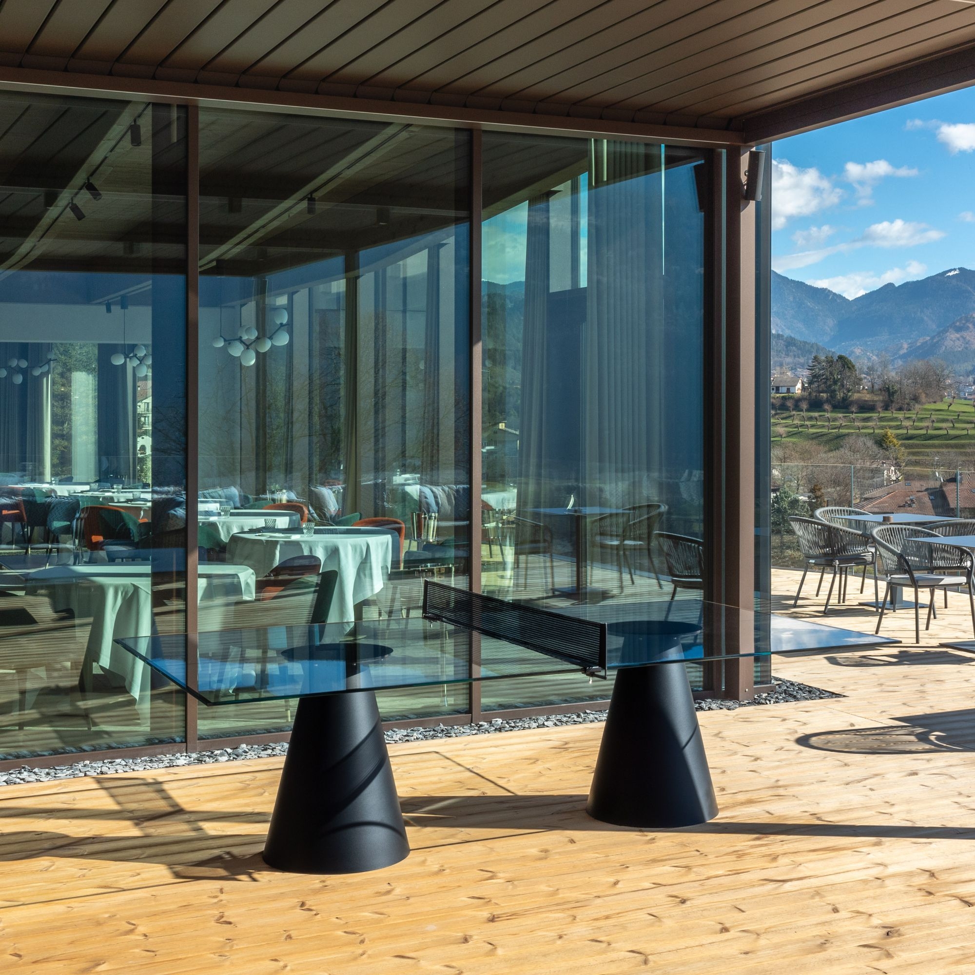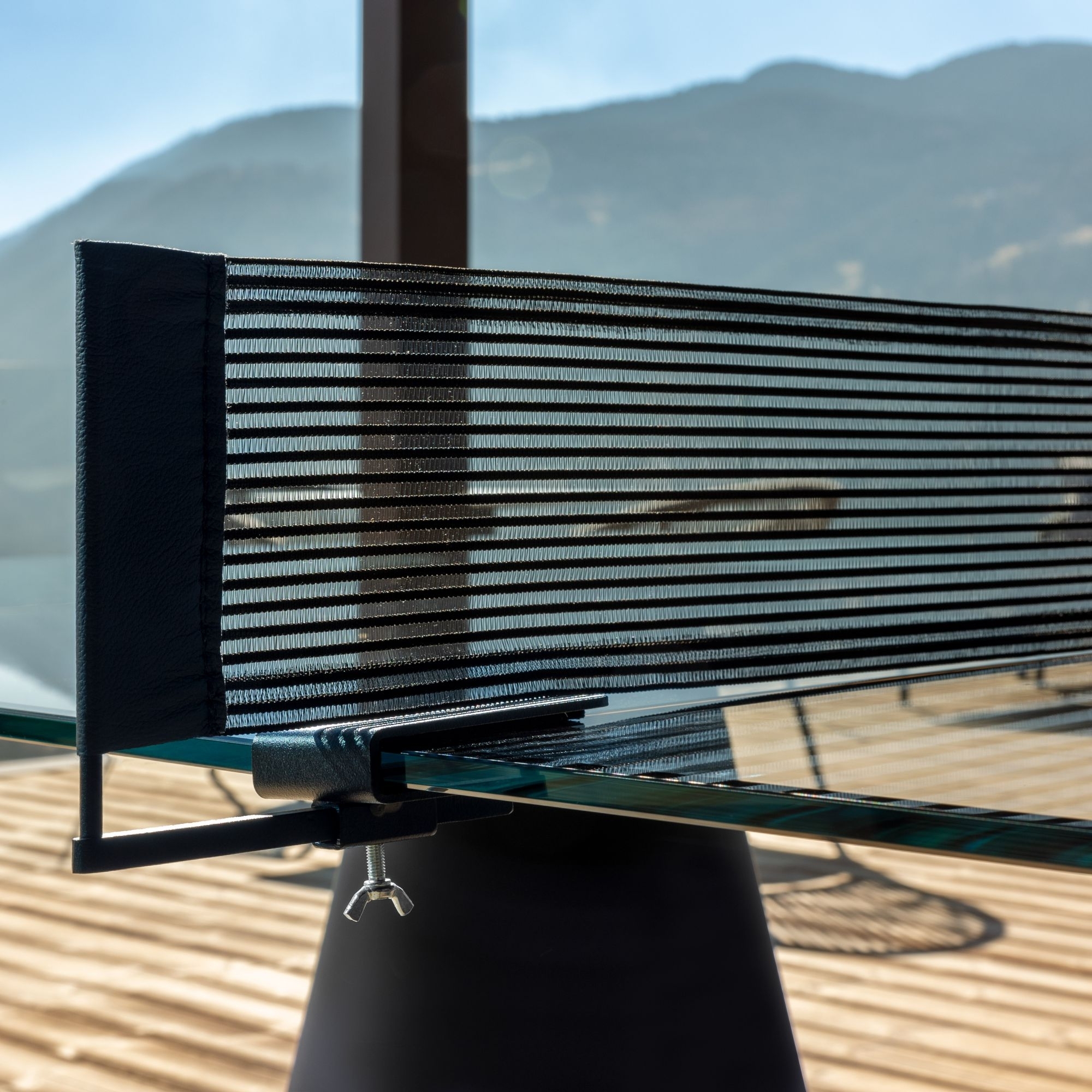 The Dada Glass Black ping pong table, with dimensions of 274x152.5x76h cm, is a fabulous accessory that will enhance evenings with friends; made by FAS Pendezza with a conical metal base and a white glass top. Available in this beautiful color, the Dada Glass Black ping pong table is a versatile and elegant piece of furniture that harmonizes with any setting: whether placed inside a home game room or in the living room, Dada Glass invites you to play without limits. The Dada Glass Black ping pong table is an invitation to share moments of joy, a design piece that stimulates team spirit and healthy competition. By removing the play net, Dada Glass transforms into an elegant and understated dining table, ideal for the most modern homes, newly designed hotels, and the most prestigious reception rooms. Designed by Basaglia and Rota Nodari for FAS Pendezza.