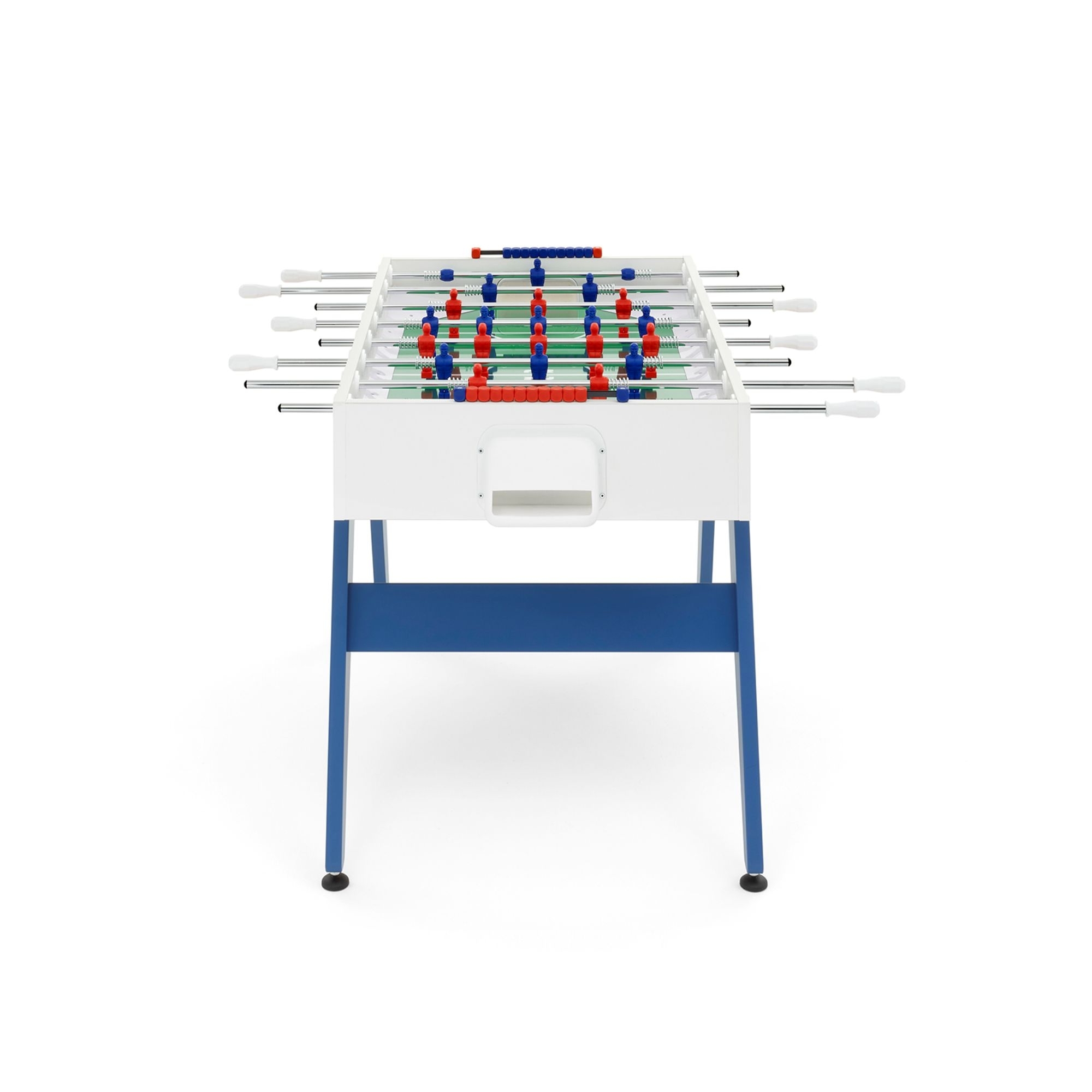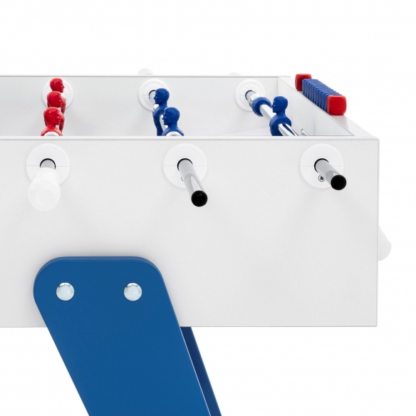 The Cross foosball table is a fantastic piece of design and entertainment crafted by FAS Pendezza from 22 mm thick MDF covered in laminate plastic, legs made of 30 mm painted birch plywood, and a playing field in high-resistance tempered glass. This foosball table has a contemporary design appreciated for its clean lines, reminiscent of both classic and timeless design. Available in red and blue colors, Cross embodies research and elegance, and can be placed in any space of your home or in public areas. Whether it's set up in a game room, living room, or chic pub, its presence is fresh and elegant. Additionally, the rods can be either telescopic or going through, designed to offer smooth and safe maneuvering. The foosball table is both sleek and stable, perfect for unleashing exciting challenges. Included are 5 white balls. Designed by Basaglia and Rota Nodari for FAS Pendezza.