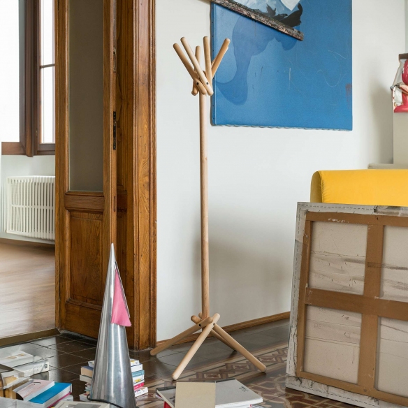 Broomstick Uno folding coat hanger made of waxed maple. Available in "natural" and "blue" colors, the Broomstick Uno coat hanger represents the essence of the fusion between minimalist aesthetics and maximum practicality. Inspired by the concept of neo-nomadic living, this design masterpiece offers an innovative, elegant and at the same time incredibly functional solution for organizing contemporary living spaces. Its peculiar characteristic is the ability to be foldable, thus allowing convenient management of the space according to needs. This functionality not only enhances the portability and modular essence of the coat hanger but also allows you to easily transform the environment without giving up a touch of distinctive and refined design. Optimized dimensions and easy to manage make the Broomstick Uno coat hanger ideal for entrances, bedrooms or offices, offering an intuitive and clutter-free user experience. Revolutionize the way you experience spaces with a design icon that combines form, function and timeless elegance. Designed by Vico Magistretti for Campeggi.