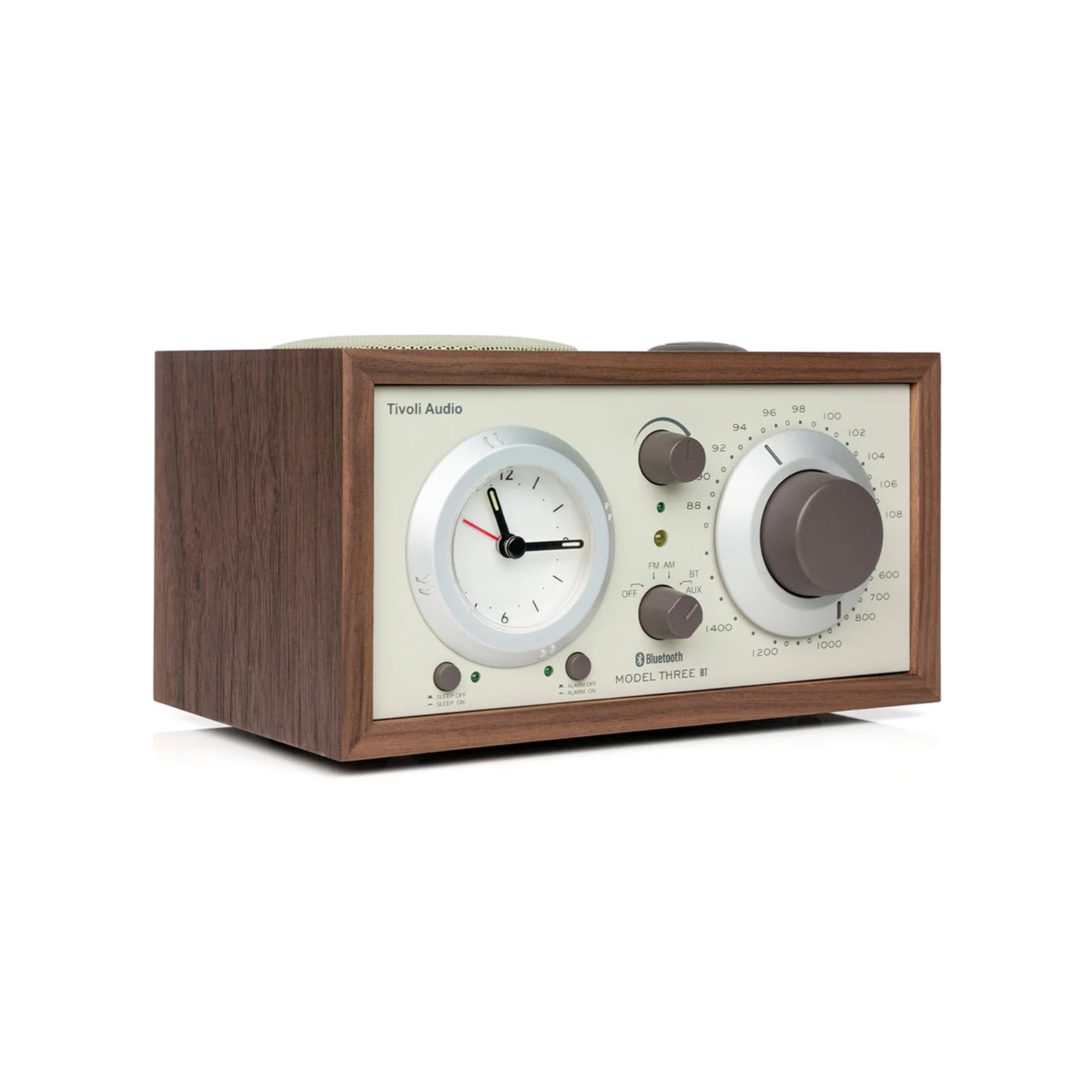The Model Three BT AM/FM/Bluetooth Clock Radio Speaker, crafted by Tivoli Audio in wood, is an elegant and stylish accessory. This splendid speaker is available in various combinations and fits into any setting; whether it is placed on a bedside table in the bedroom, on a desk in the office, or on a coffee table in the living room, the Model Three BT will enhance any space. Thanks to its integrated wireless Bluetooth technology, it allows music to be streamed seamlessly before going to sleep, upon awakening, and at any point during the day. The soft and steady lighting keeps the clock face visible in low light or darkness without disturbing sleep. The highly sensitive AM/FM tuner, easy-to-set alarm, and sleep function, coupled with its beautiful natural wood cabinet, make the Model Three BT the perfect clock radio for your nightstand.