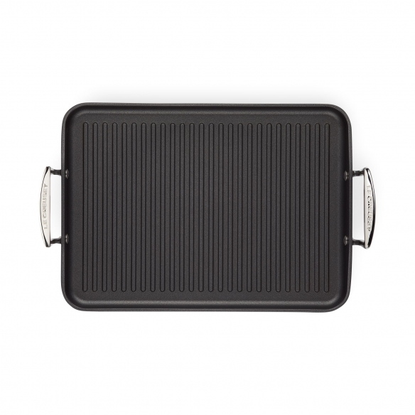 Aluminum grill. Designed to ensure outstanding performance, this grill comes as a functional and handy kitchen accessory to prepare perfectly cooked food. Whether it's meat, fish or vegetables, you will get outstanding results. Its structure helps to distribute heat quickly and evenly, for preparing quick and delicious meals! The large stainless steel handles, on the other hand, ensure a secure and flawless grip, for 360-degree control! Get the authentic BBQ effect at home: choose Le Creuset grill!