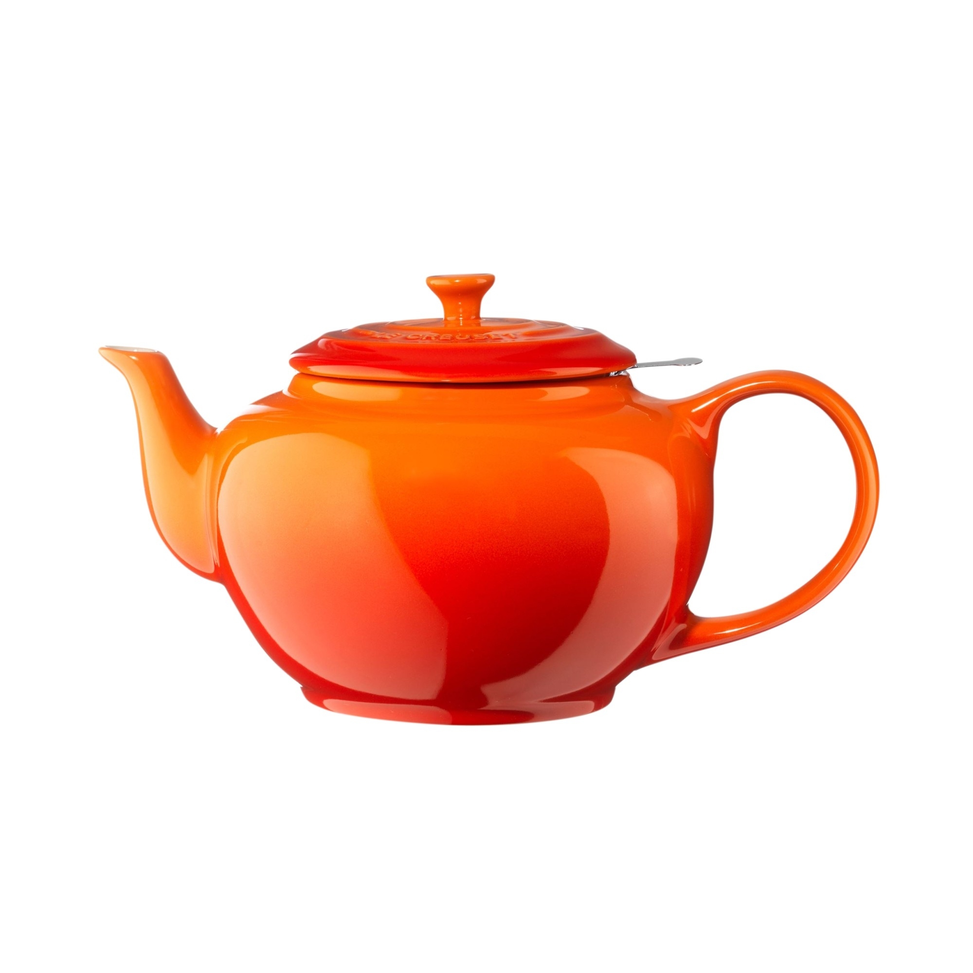 Vitrified stoneware teapot including a stainless steel infuser. Available in the exclusive orange and cherry, it's ideal for preparing and serving your favorite hot drinks. This vintage-inspired teapot is a handy kitchen accessory to have around your kitchen, especially when the winter brings you in the chill, so you can enjoy a hot cup of tea, as well as the most popular hot drinks. The vitrified stoneware keeps your drinks warm by spreading heat evenly. The special handle makes it more comfortable and easy to grip, lift and pour.The infuser allows you to cook your tea in a very simple way: the tea leaves remain in infusion in the teapot without mixing with the water. Choose Le Creuset teapot with infuser, inimitable design!