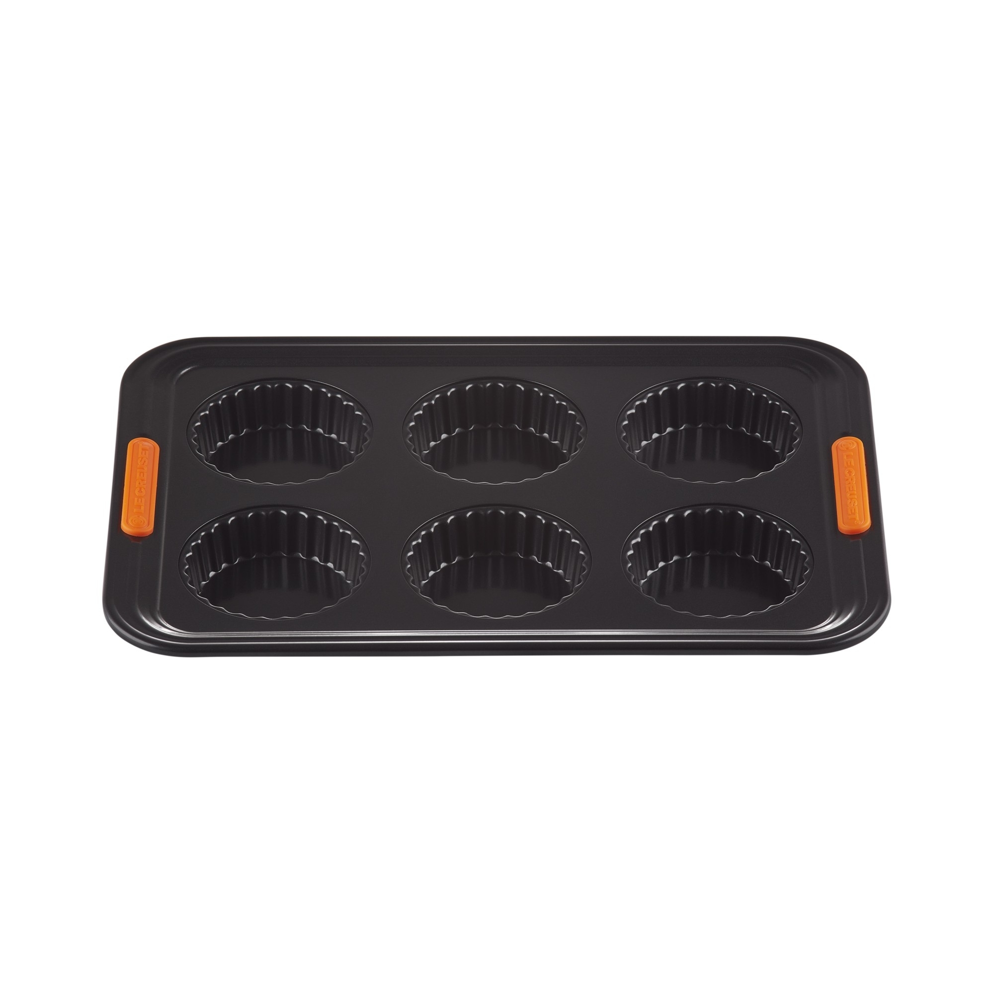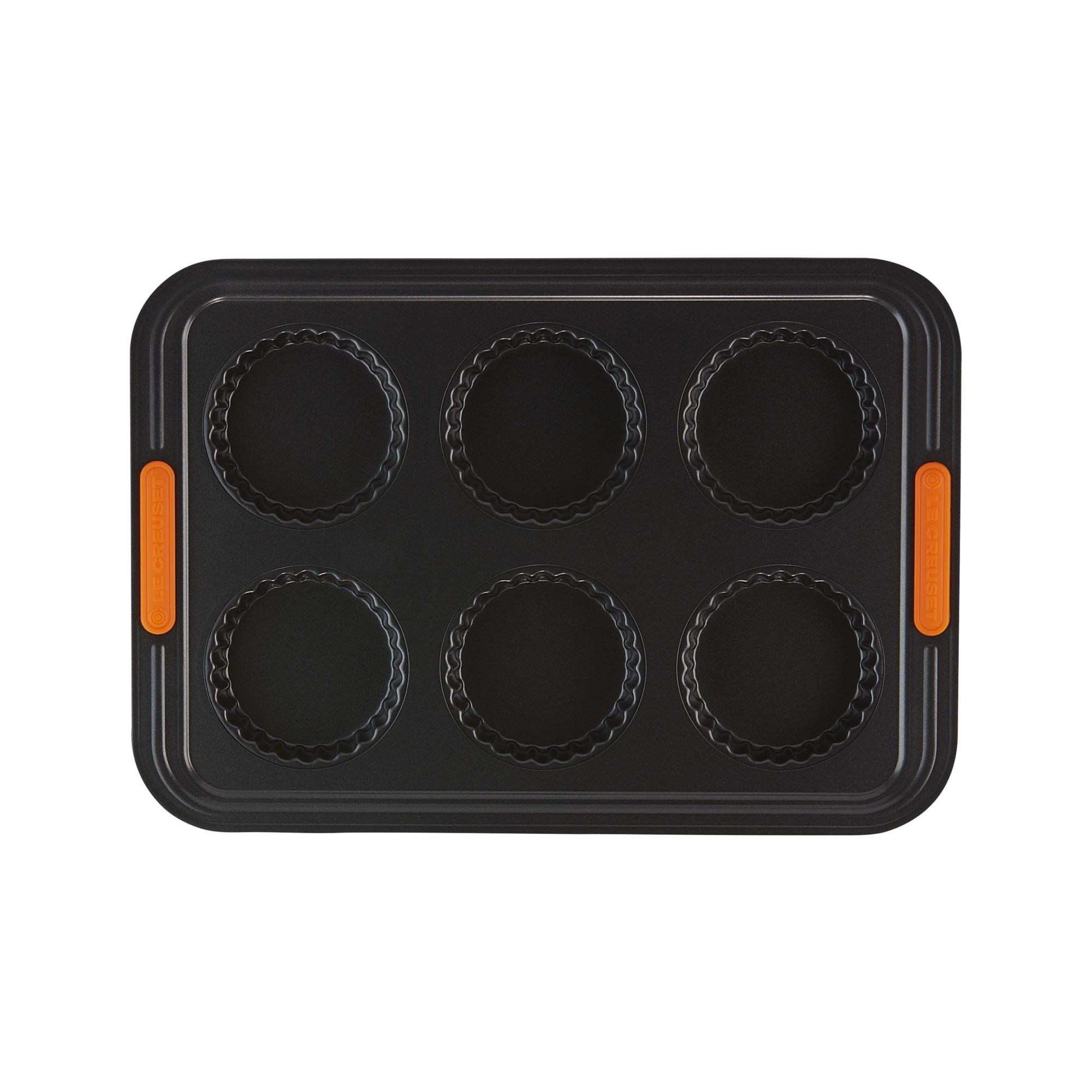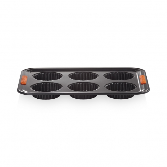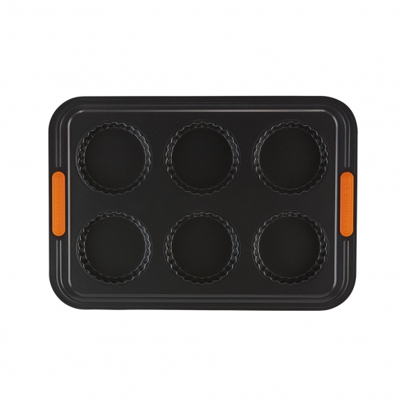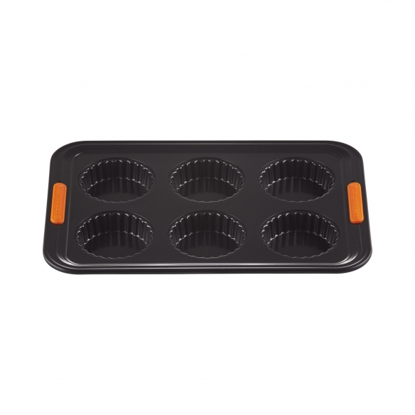 Anti-adherent carbon steel 6 tarts mold. Designed to ensure advance performance, this practical and versatile tart mold is perfect for creating amazing desserts. Get great desserts: the special non-stick internal coating allows to spread heat evenly, preventing food from sticking and allows quick and easy cleaning, while the heat-resistant silicone handles allow you to grip the product easily and safely. Make preparing your favourite desserts a plesaure, choose Le Creuset! The best for your sweet creations!