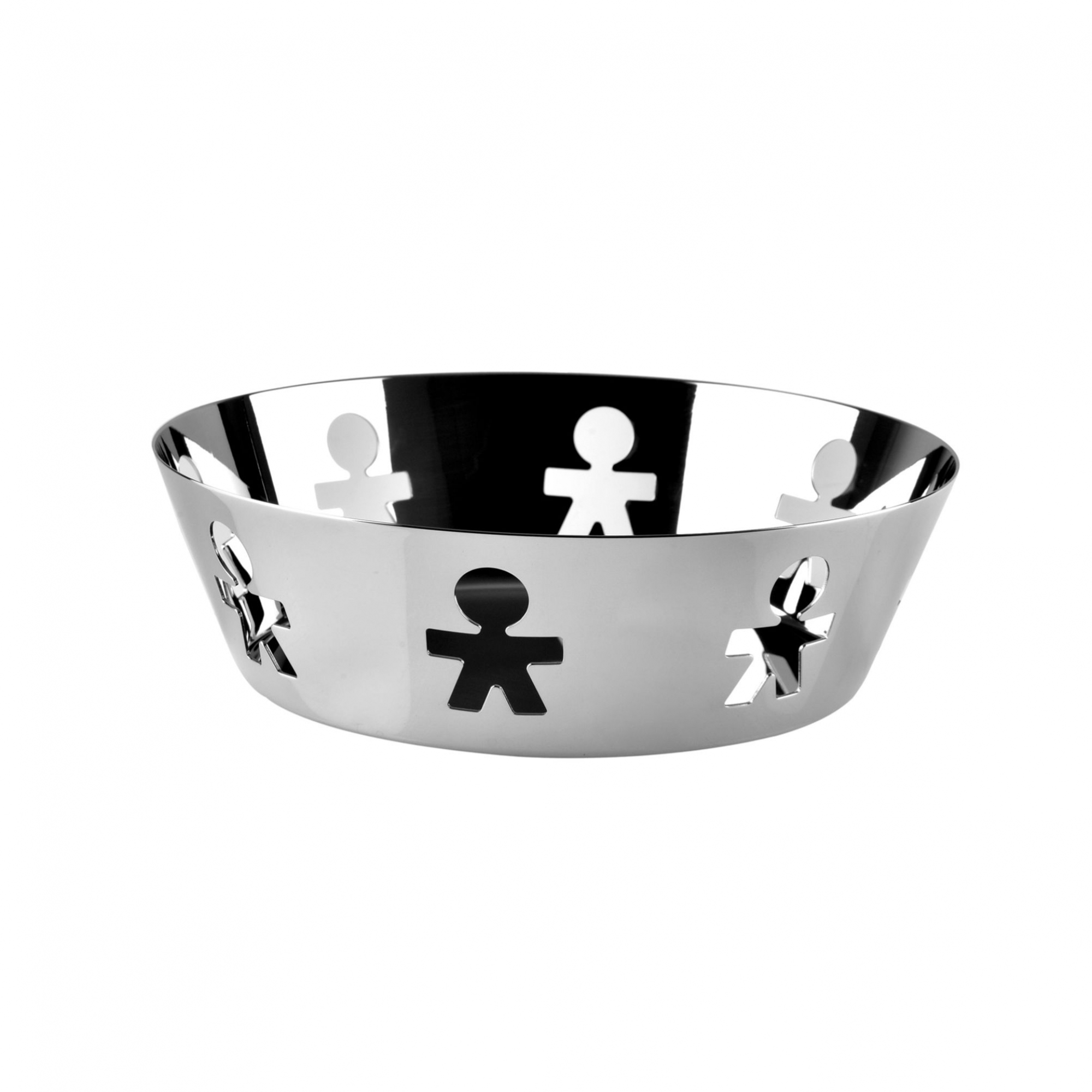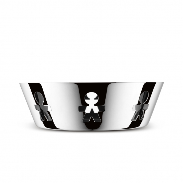 Girotondo 18/10 stainless steel basket with perforated edge ( 18 cm).  Available in 2 exclusive colors (steel and black), this basket is a true icon of Alessi. Featuring well-defined shape, this unique basket has been designed to bring a touch of timeless elegance to your mise en place. Ideal for holding bread and fruit. Designed by King-Kong for Alessi.