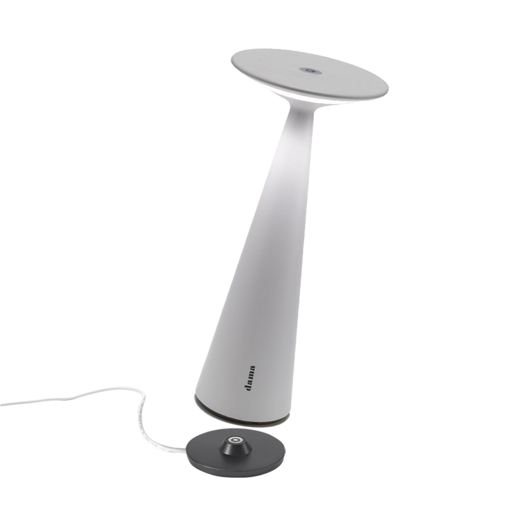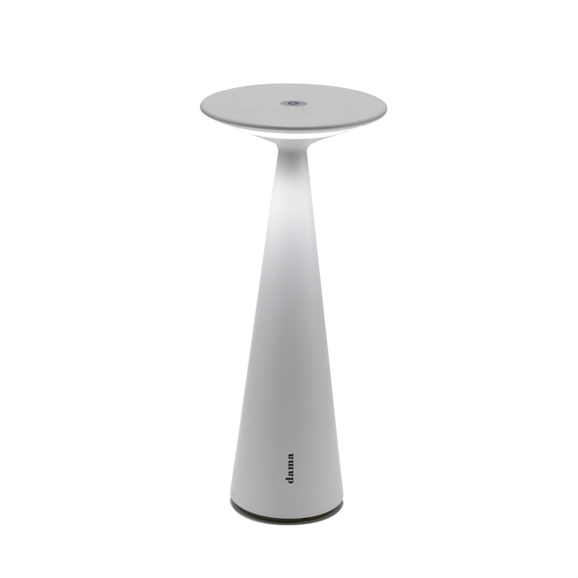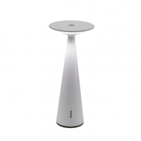 Rechargeable Dama Pro Led table lamp made with painted die-cast aluminum body and polycarbonate diffuser. Available in 2 elegant color finishes, the Dama lamp has a rechargeable and replaceable lithium battery with a duration of approximately 9 hours. The contact charging base with touch dimmer and the function for selecting the color temperature of the light between 2700 ° and 3000 ° Kelvin allow easy management of the Dama lamp: a real luminous home sculpture!