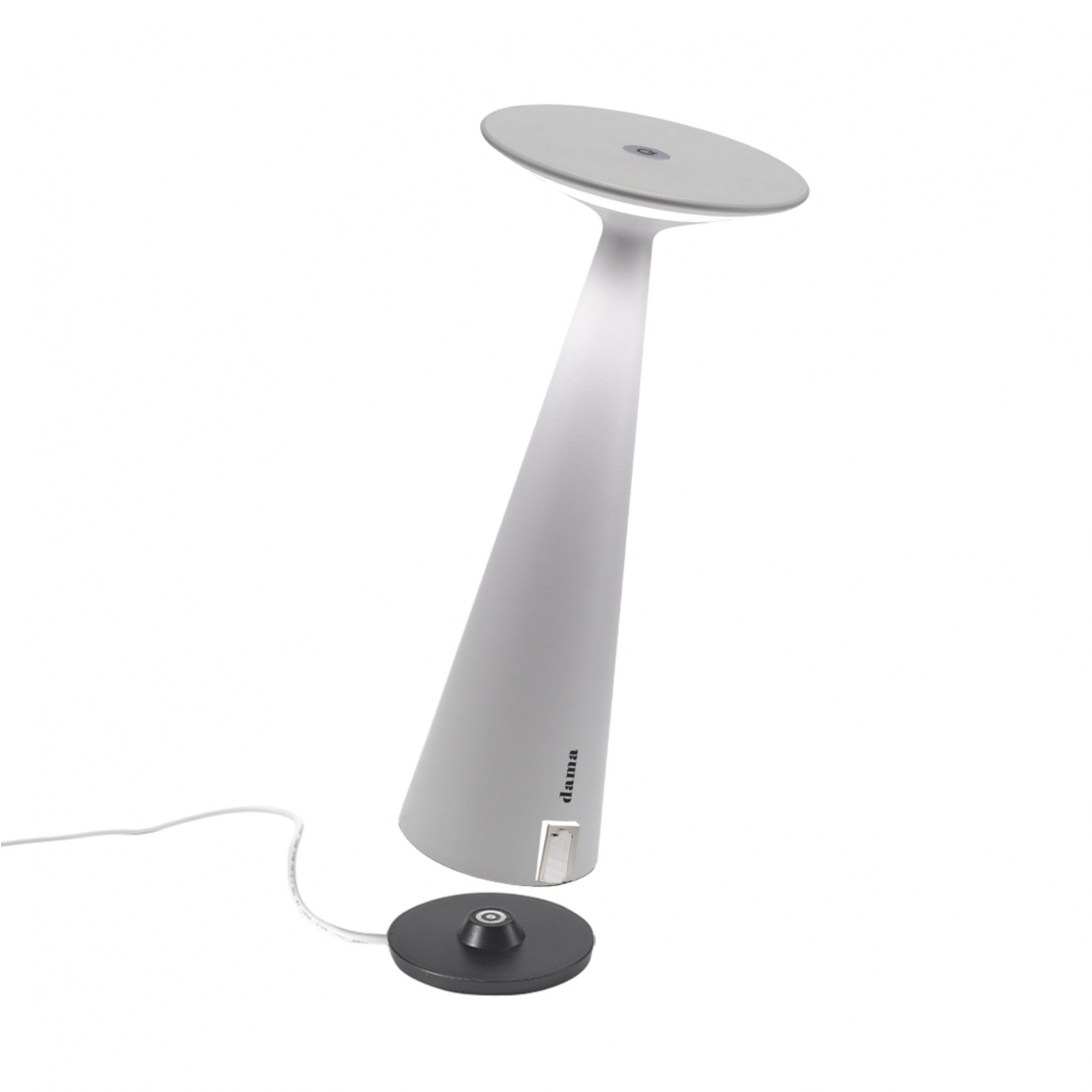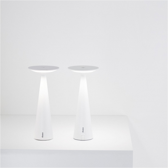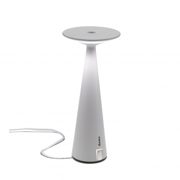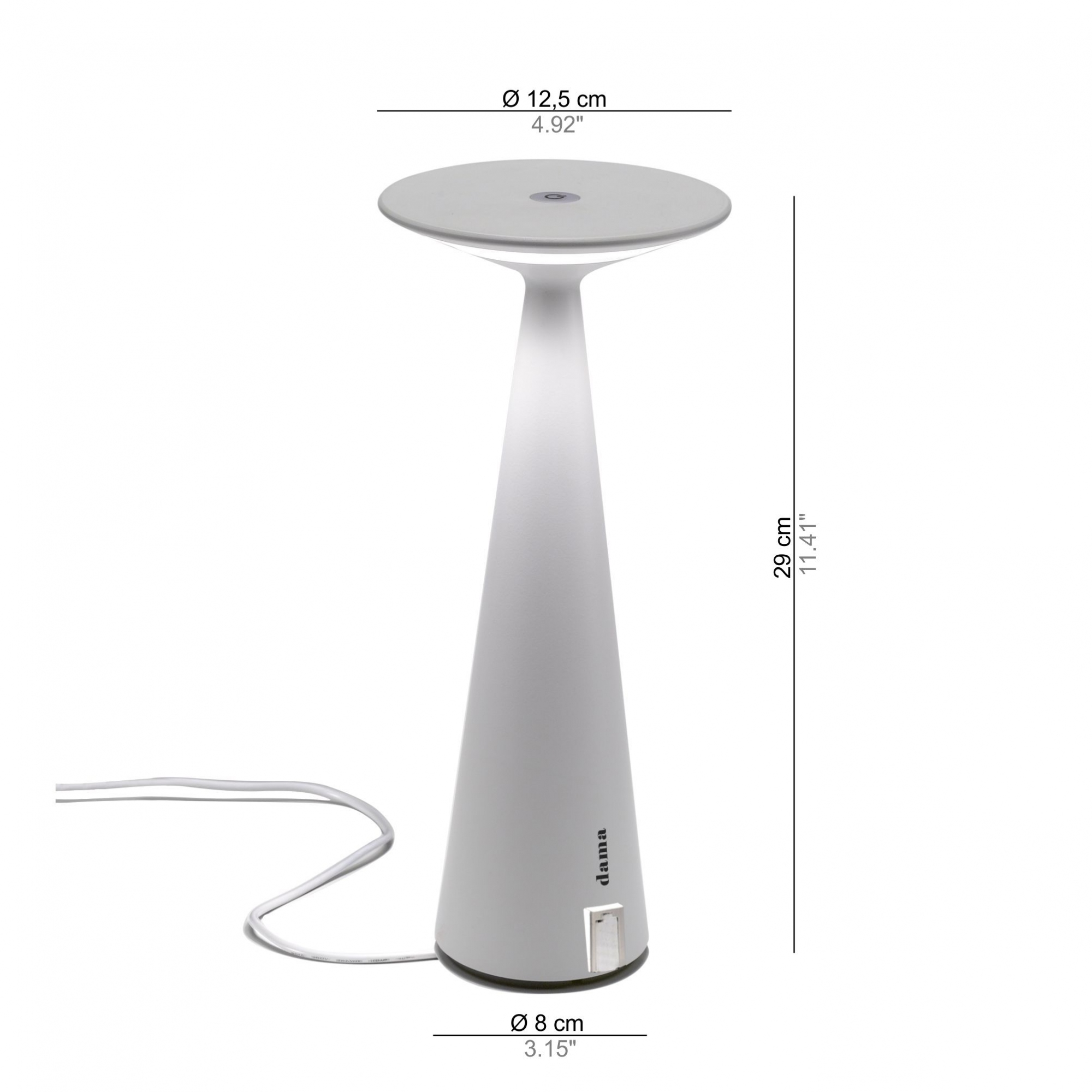 Dama Pro USB rechargeable table lamp made with painted die-cast aluminum body and polycarbonate diffuser. Available in 2 elegant color finishes, the Dama lamp has a rechargeable and replaceable lithium battery with a duration of approximately 9 hours. The contact charging base with touch dimmer and the function for selecting the color temperature of the light between 2700 ° and 3000 ° Kelvin allow easy management of the Dama lamp. Easily recharges via USB! A real futuristic home sculpture!