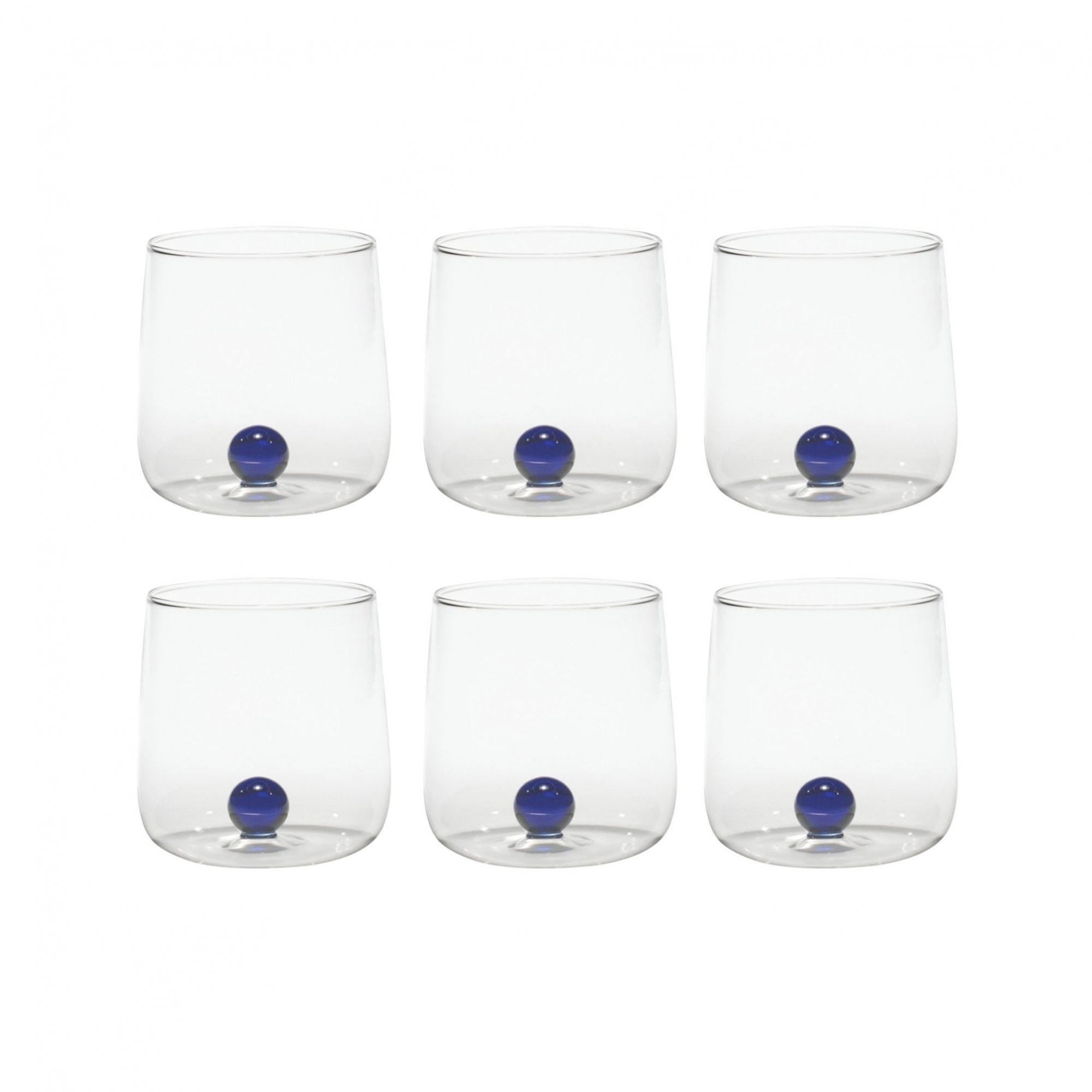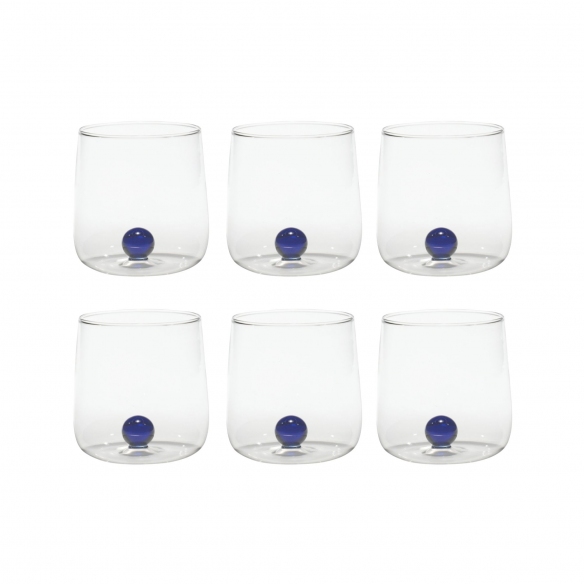 6 Bilia glasses made of handmade borosilicate glass. With a capacity of 440 ml, Bilia glasses take their name from the suggestive marble inside the glass, perfectly visible thanks to the transparency of the glass. The set includes 6 glasses in different colors: ideal to give style and color to your table! Designed by Federico de Majo for Zafferano.