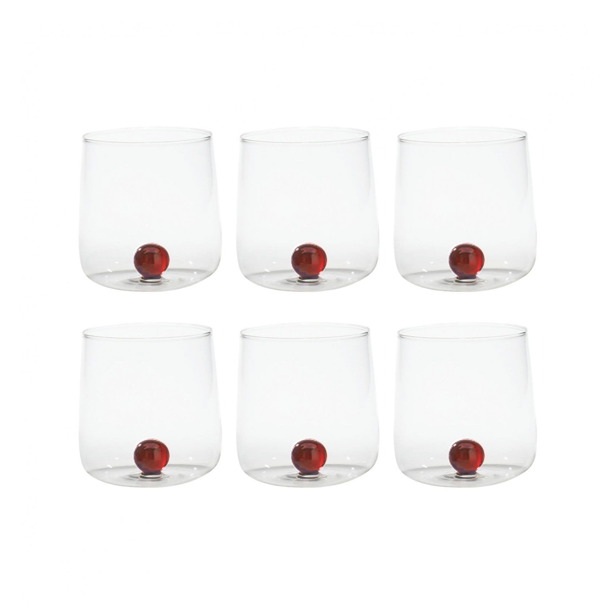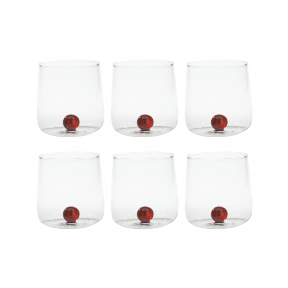 6 Bilia glasses made of handmade borosilicate glass. With a capacity of 440 ml, Bilia glasses take their name from the suggestive marble inside the glass, perfectly visible thanks to the transparency of the glass. The set includes 6 glasses in different colors: ideal to give style and color to your table! Designed by Federico de Majo for Zafferano.