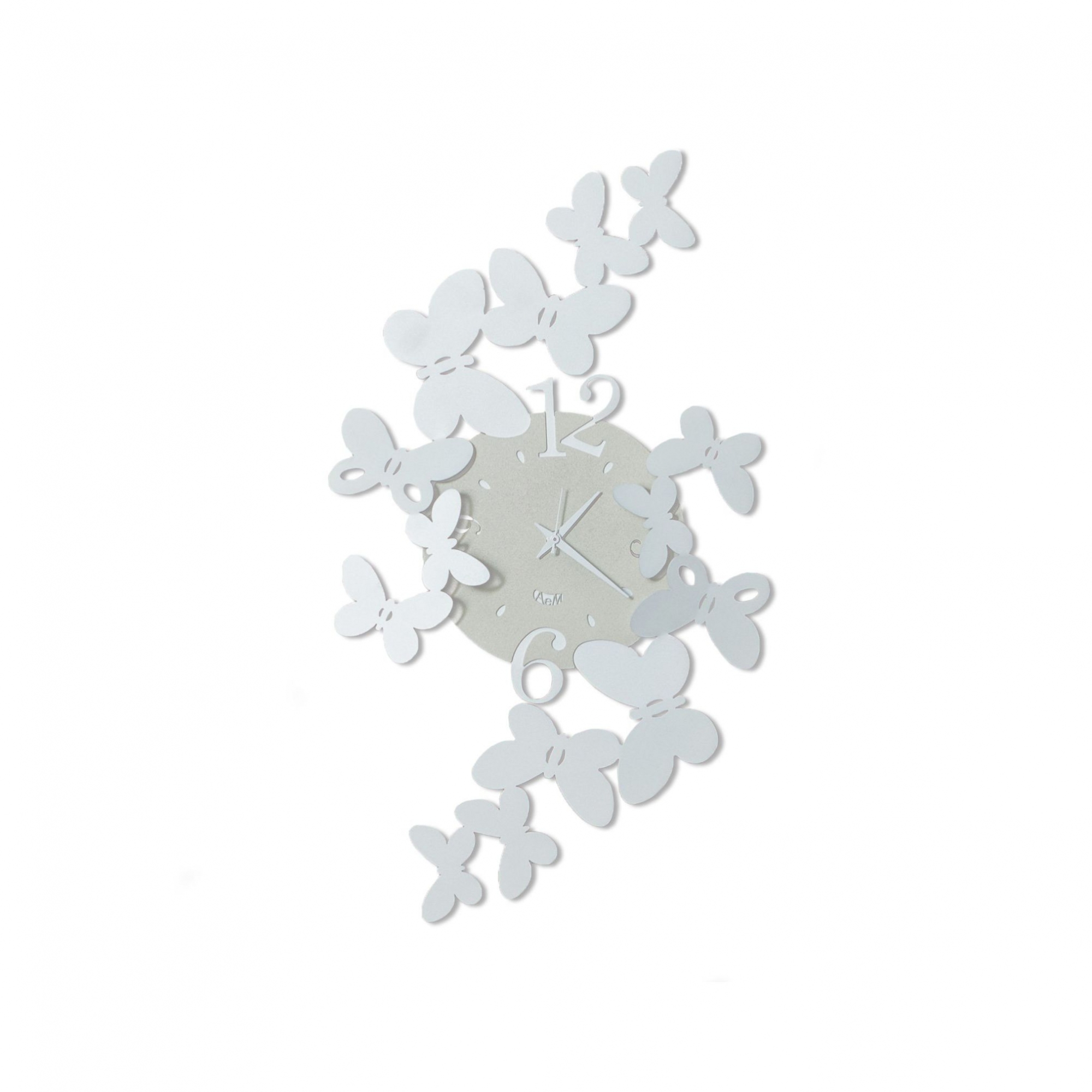 Papillion wall clock made of iron with a round central dial and numbers 12 and 6 that leave it. A frame full of butterflies surrounds the dial. Expand itself vertically. Available in two color finishes (white and beige).). Iron is the brand's flagship material that is laser cut mixed with colours to return a light and contemporary style. Made by Arti e Mestieri.