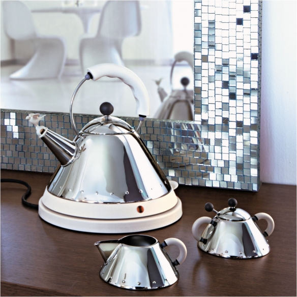 Mg32 kettle made of 18/10 stainless steel with a base and a handle in thermoplastic resin. Available in 3 colours finishes (light blue, black and white), this amazing kettle is the ideal to prepare tea, infusions and baby food.  MG32 is suitable to all sources of warmth and it is an unmissable object in your kitchen. Designed by Michael Graves for Alessi.