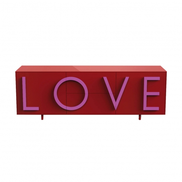 Love cabinet made of lacquered MDF. Available in 14 colour combinations, the Love sideboard amazes at first glance for the message it manages to convey. From the combination of aesthetics and function, the lines become three-dimensional, the sheet extrudes itself into a container and the letters come out of the sheet generating handles. A cabinet that turns into a poster, a piece of furniture that wants to remind you that love is a closed box, waiting to be discovered. Designed by Fabio Novembre for Driade.